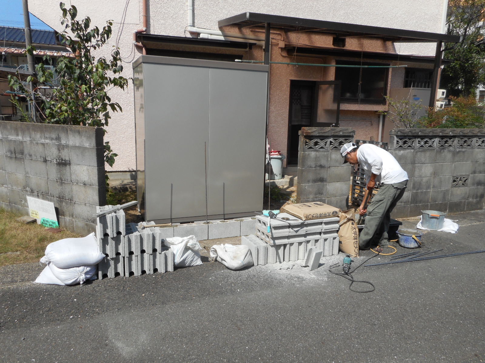 整地後、基礎ブロックを据付けました!! 新規の物置の組立て、据付けが完了しました!!