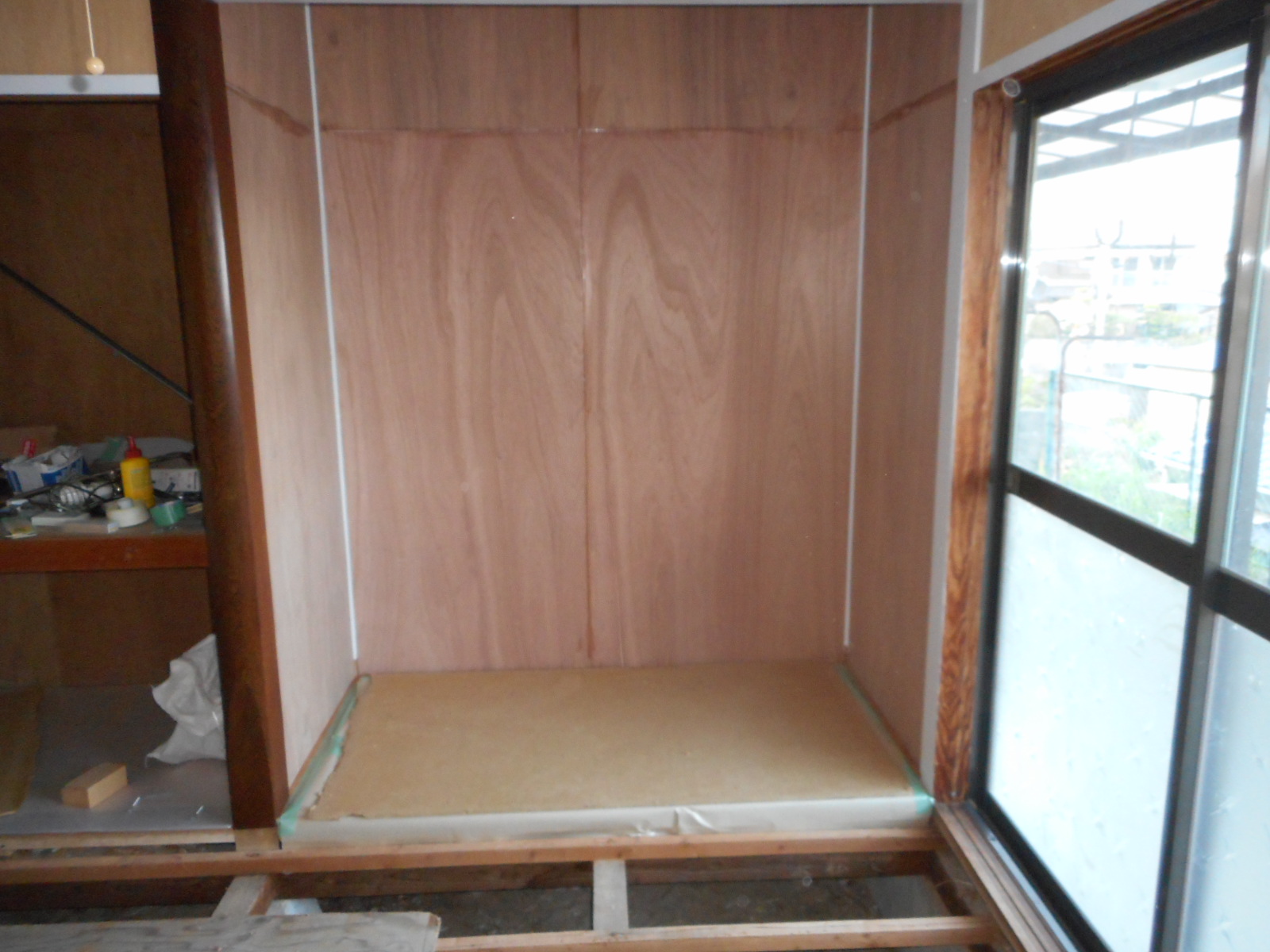 | 壁廻りに、クロス下地のベニヤを施工しました!! | 仏壇置き場も、物置スペースに改修しました!! |