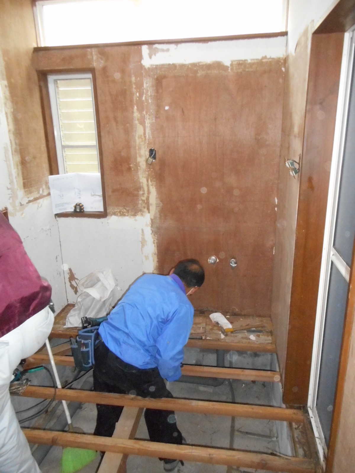 | 既存化粧台を撤去し、床も解体します!! | 床にCF下地のコンパネを施工し、壁廻りの状態の悪い部分も補修しました!! |