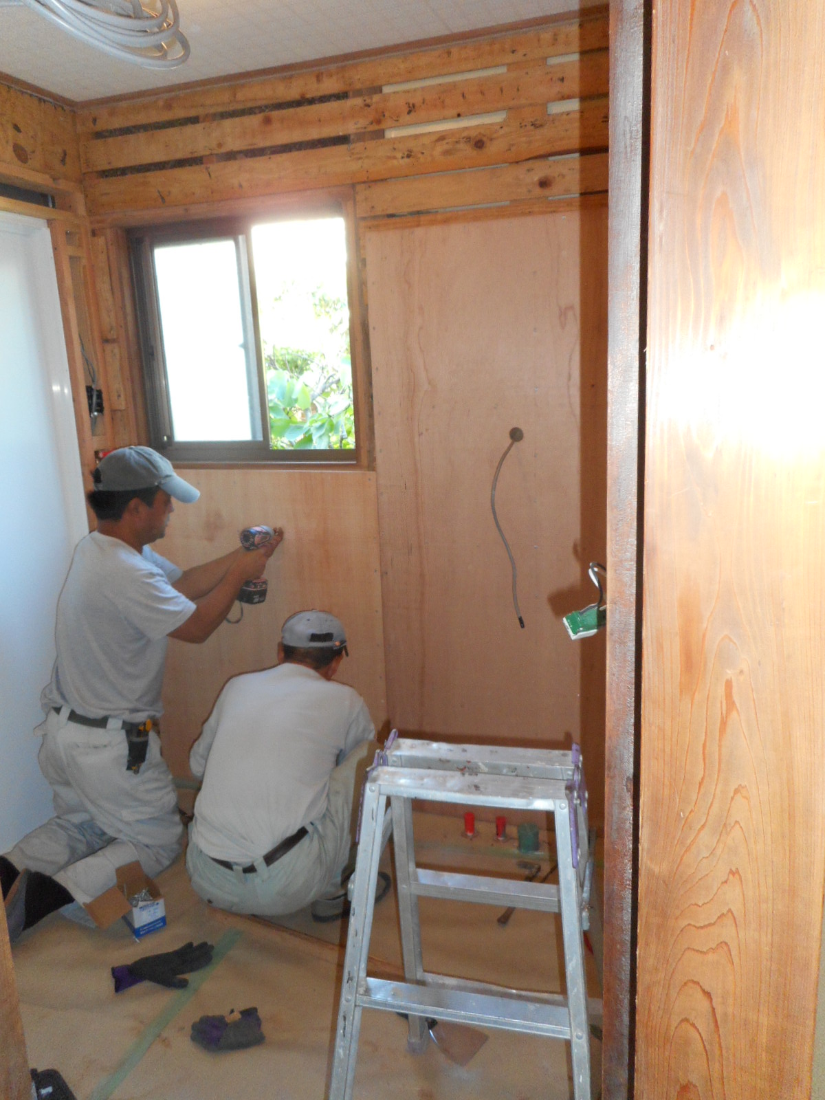 | 設備屋さんが、洗面所の化粧台と洗濯機の給排水管の整備をします!! | 壁と天井に、クロス下地のベニヤを施工いて行きます!! |