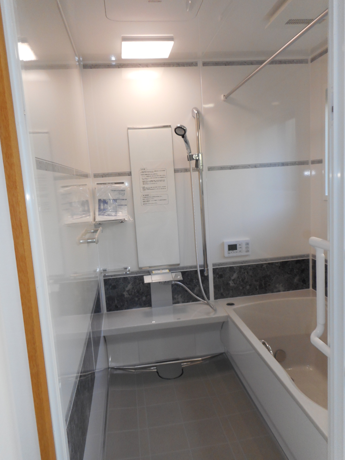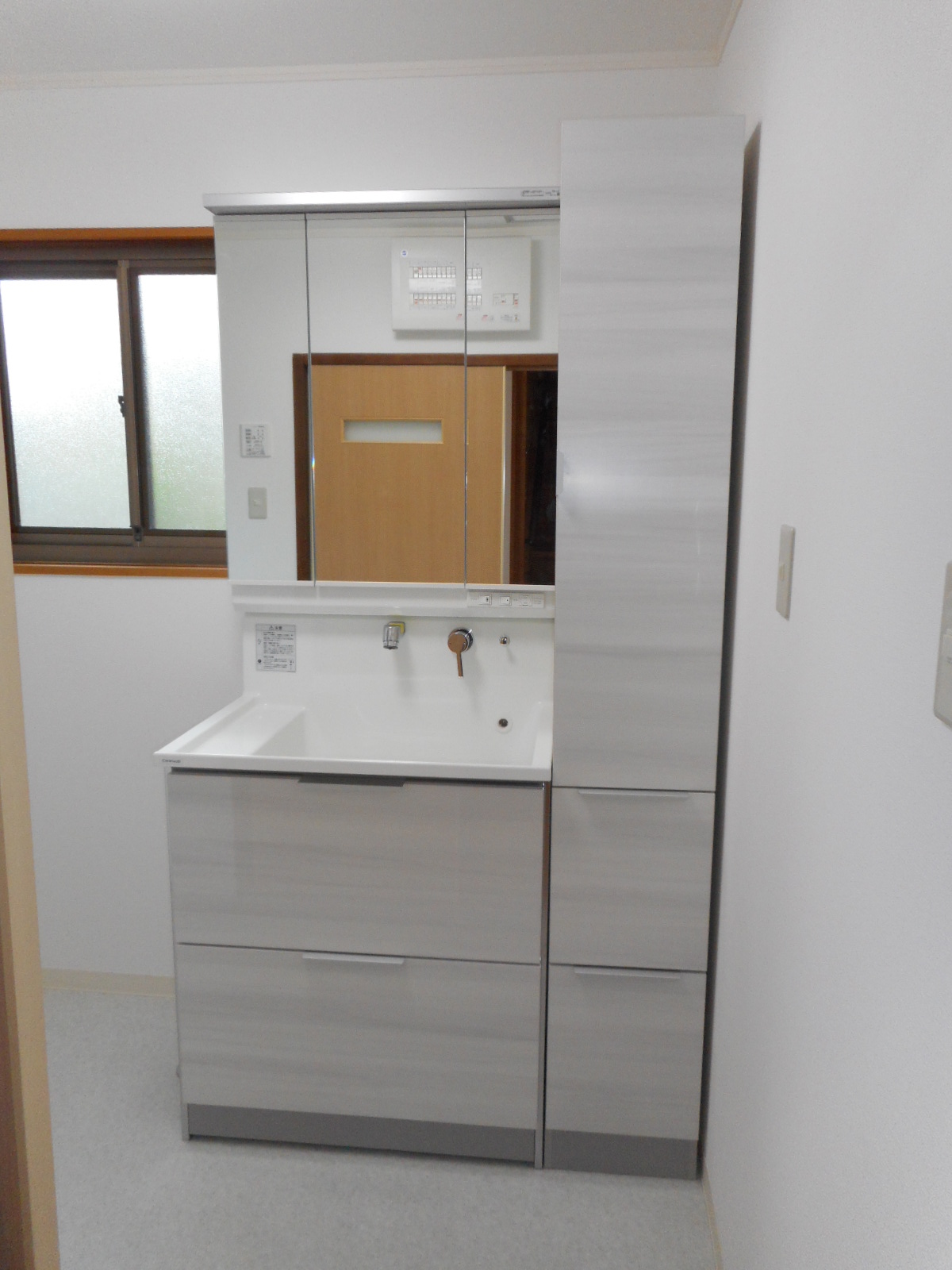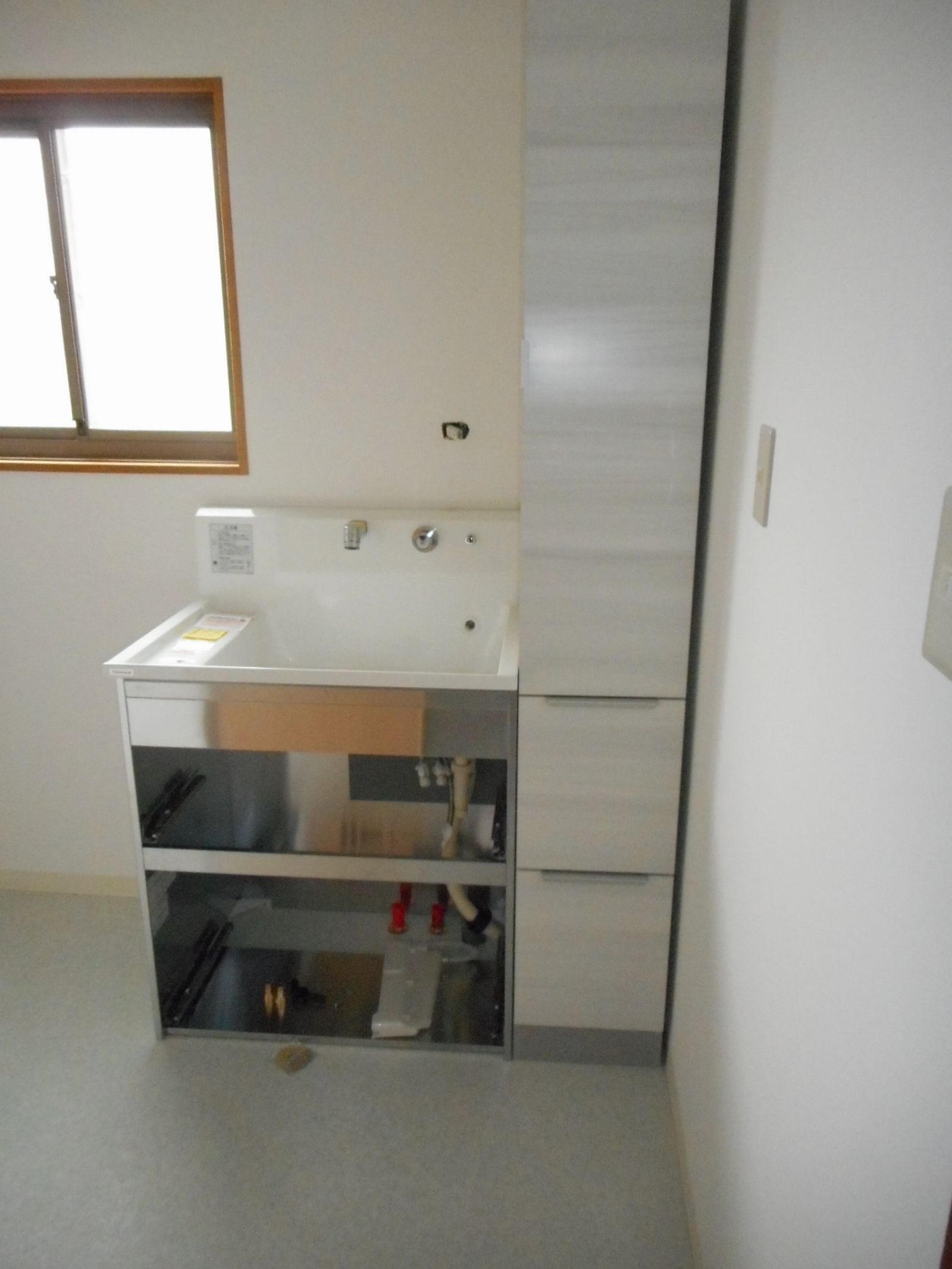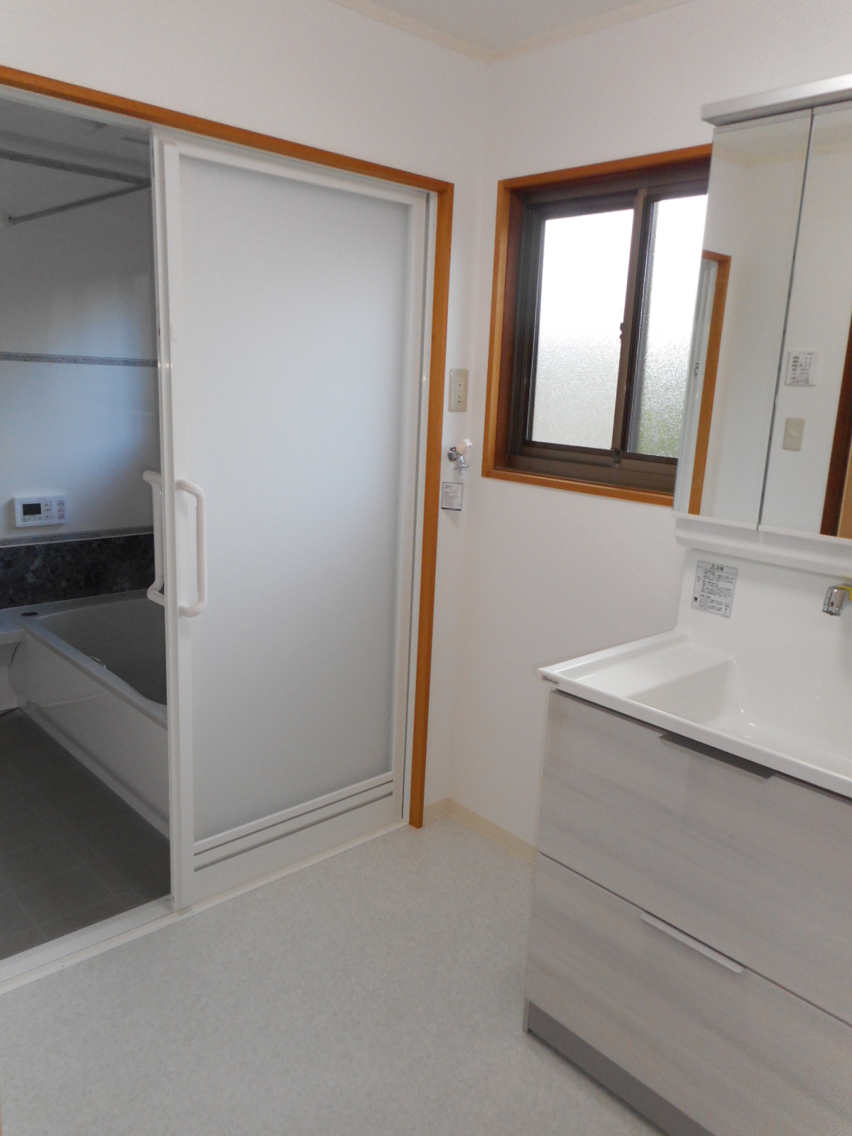 | 浴室の入り口ドアも取付けました!! | 洗面所は内装工事後、新規の化粧台とウォールキャビネットを組付けて行きます!! |