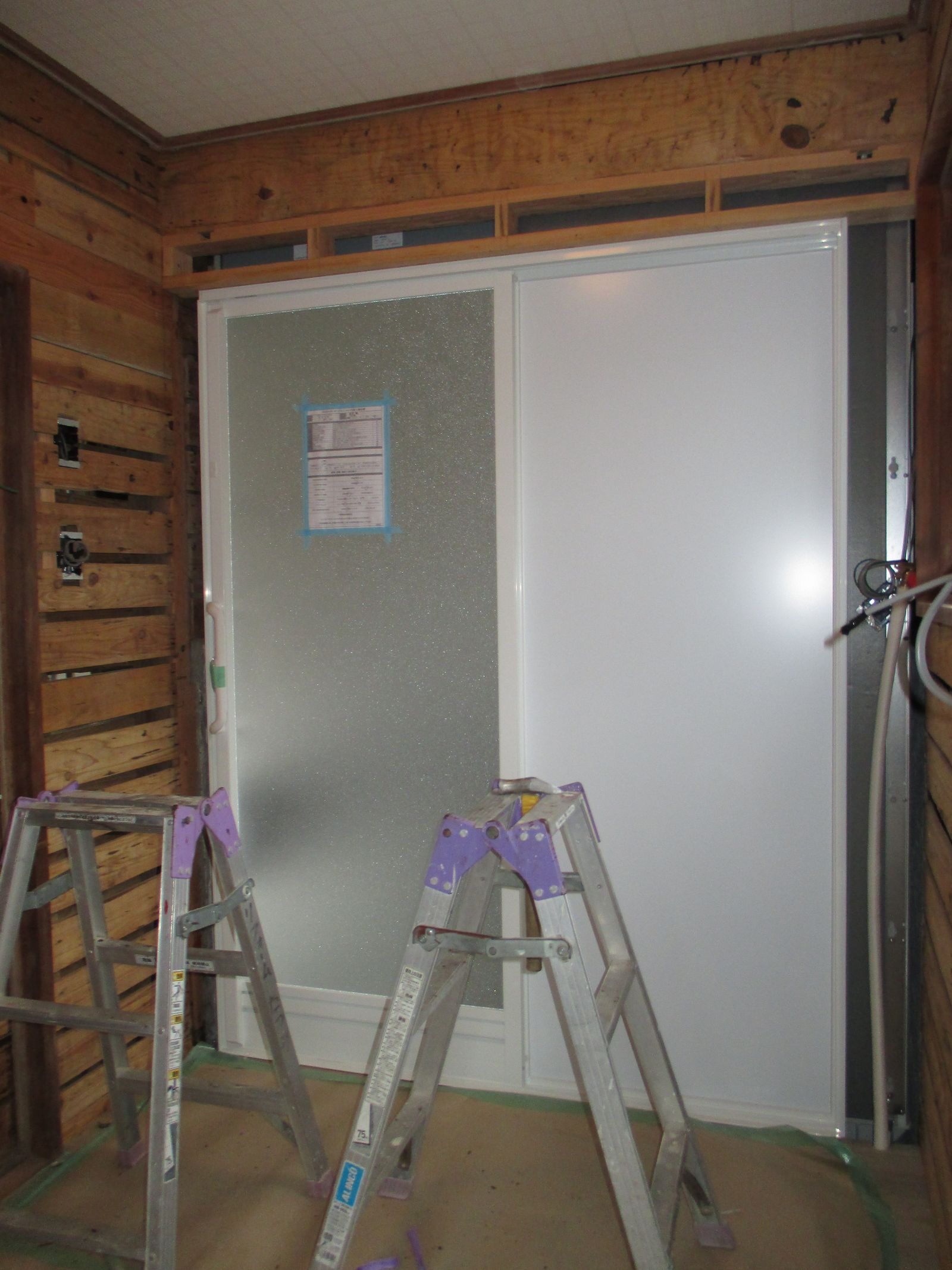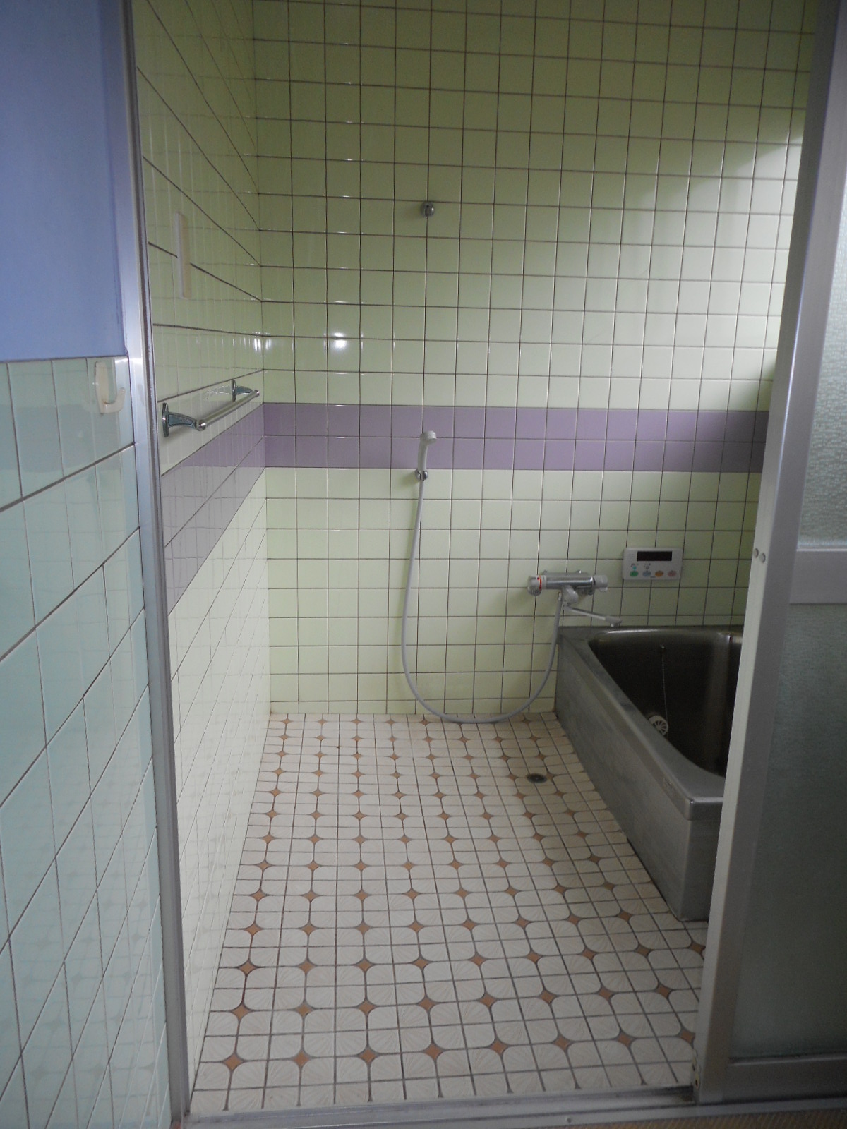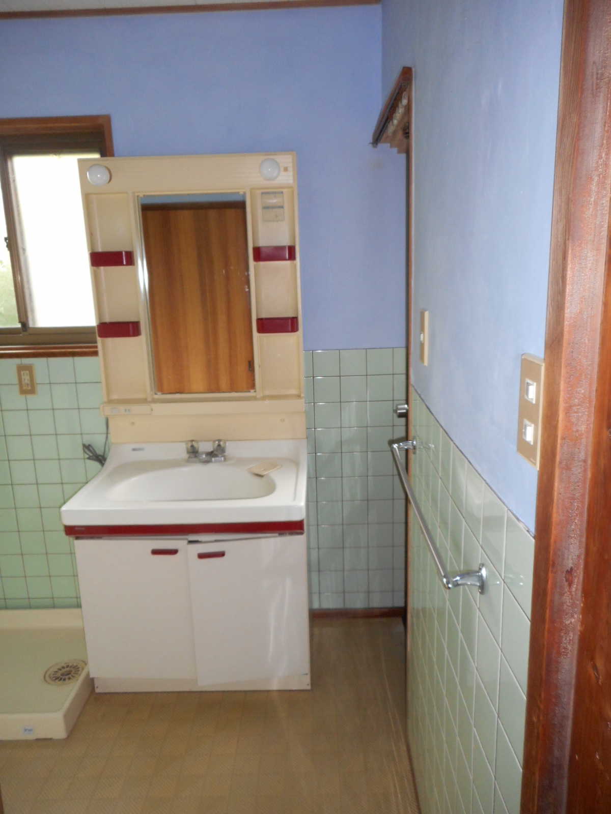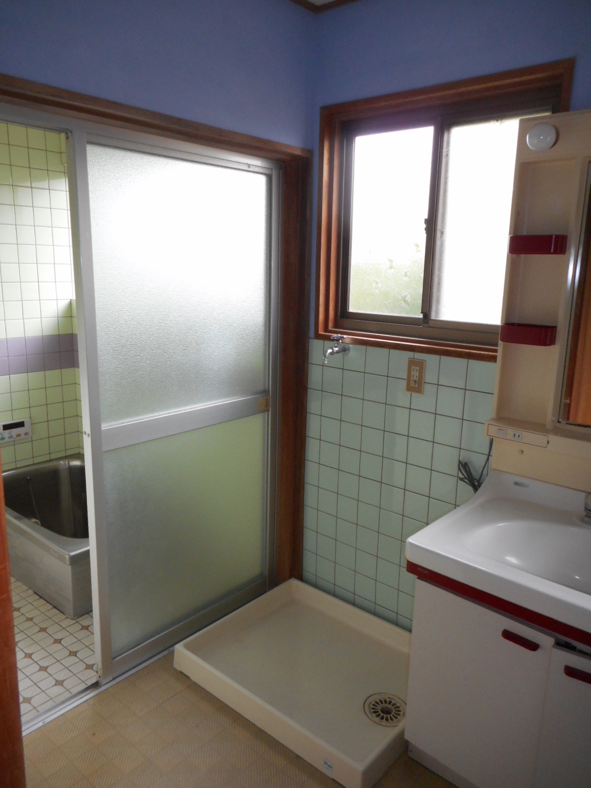 | 浴室の入り口ドアも取付けました!! | 洗面所は内装工事後、新規の化粧台とウォールキャビネットを組付けて行きます!! |
