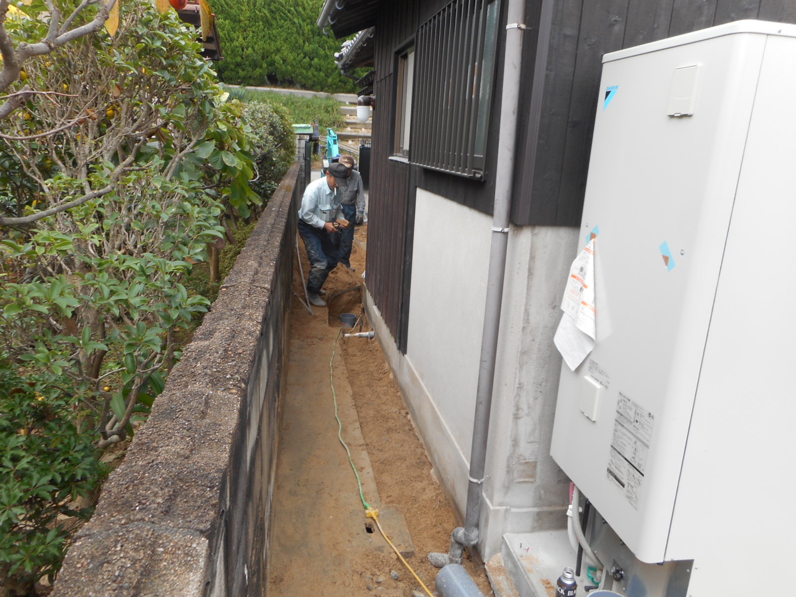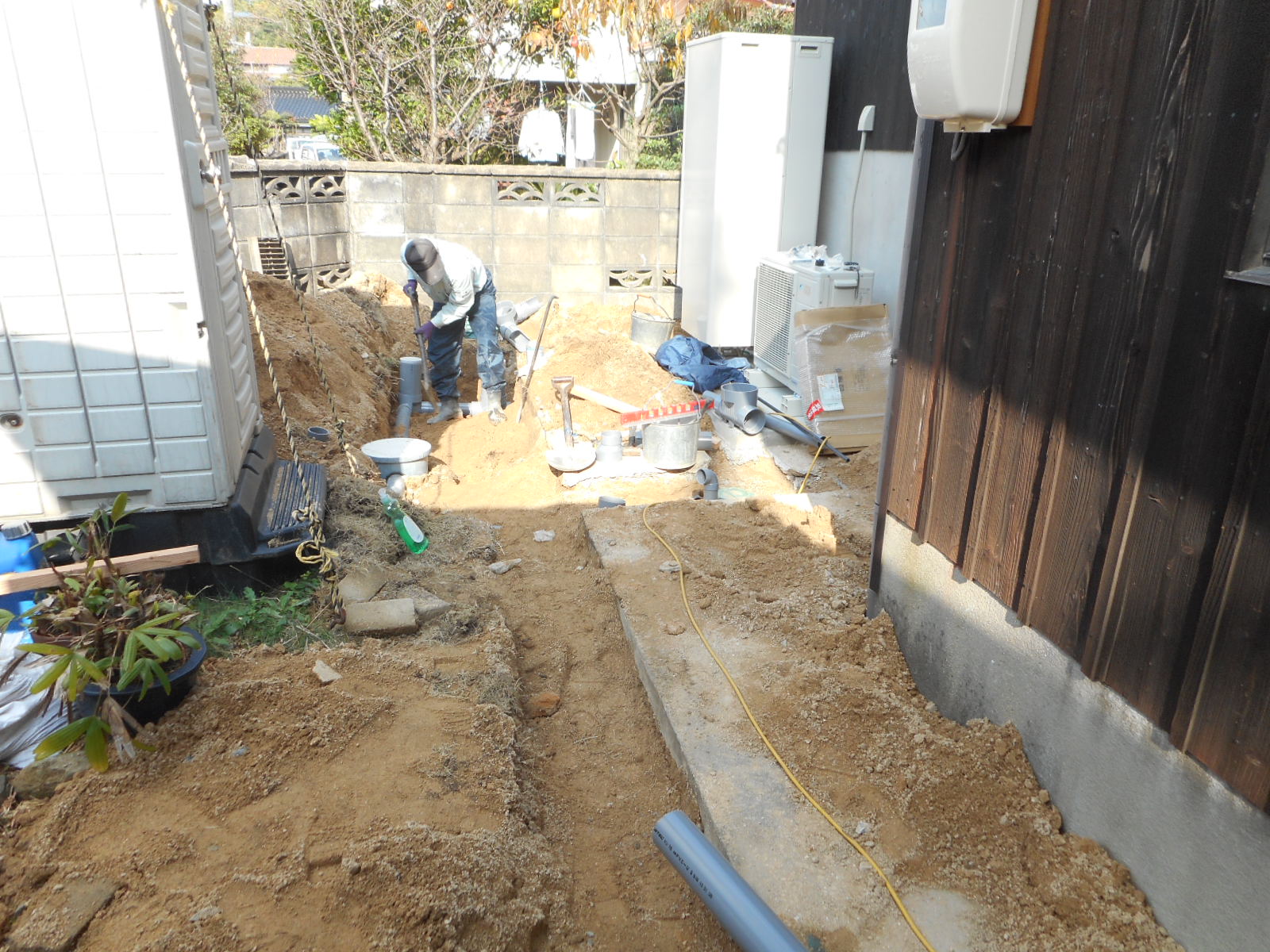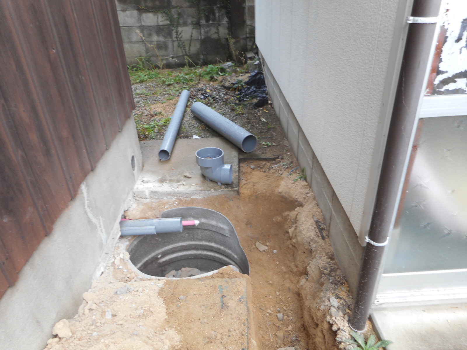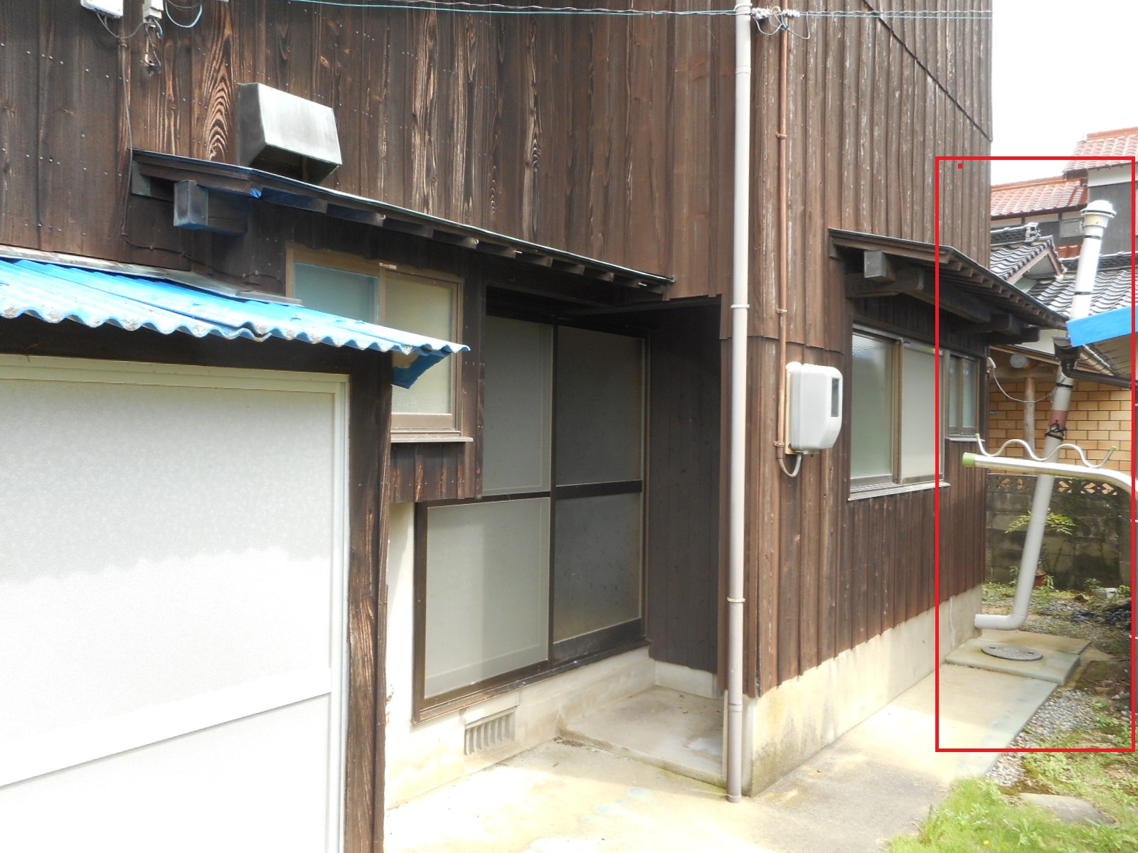 | □部分が、一番奥のトイレです!! | トイレの中に新規の排水管を引き入れました!!(ここから○まで、順次下水道管を整備します) |