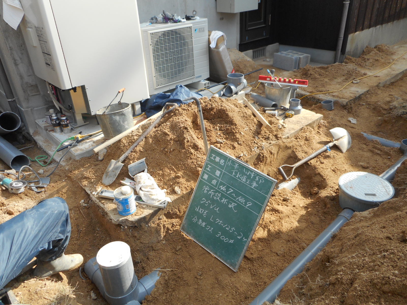 | キッチンと浴室からの、下水道管を整備しています。 | 場所ごとにボードに工事名等と書いて、写真を撮ります!!(下水道局に書類と一緒に添付する必要があるため) |