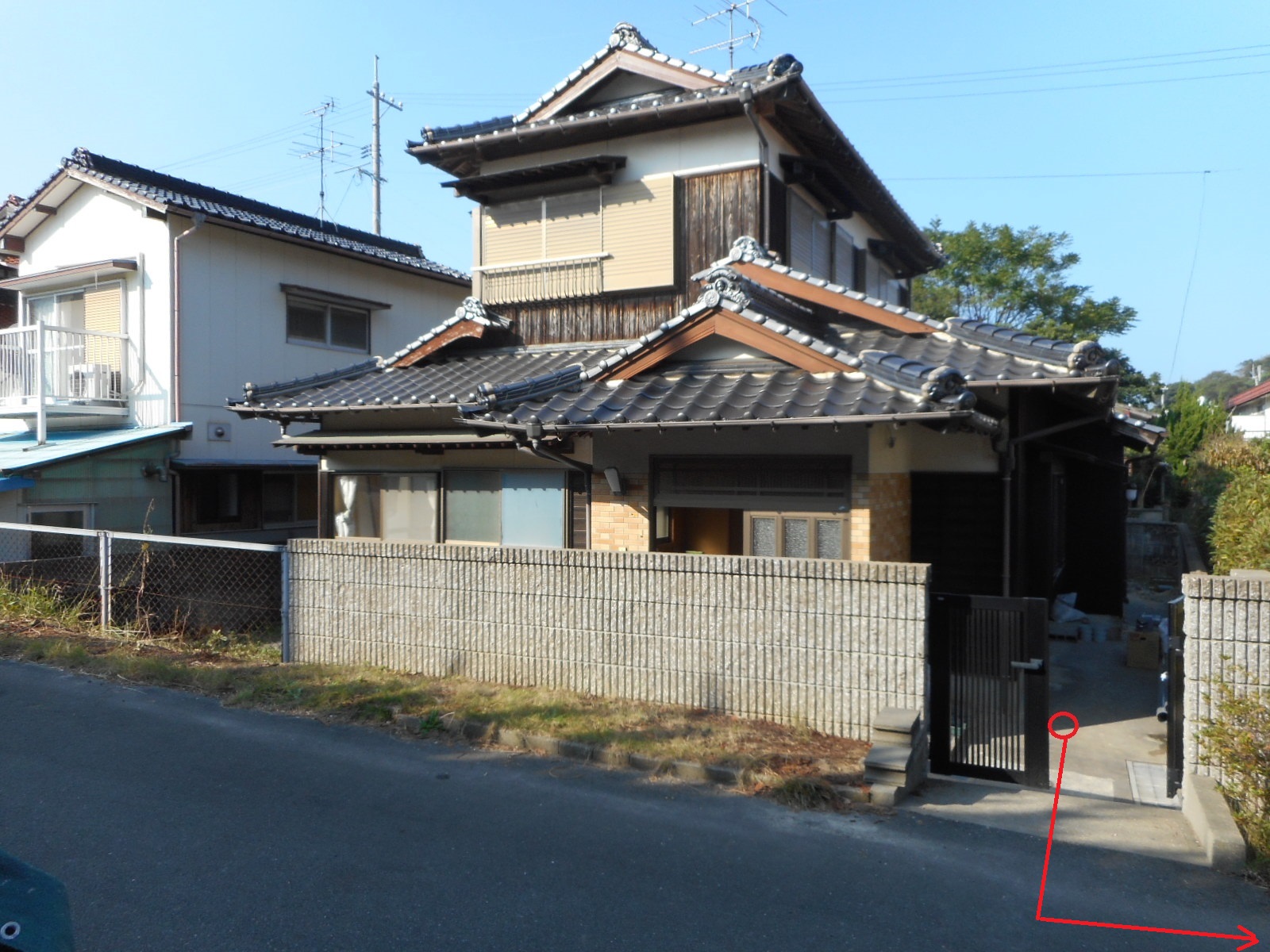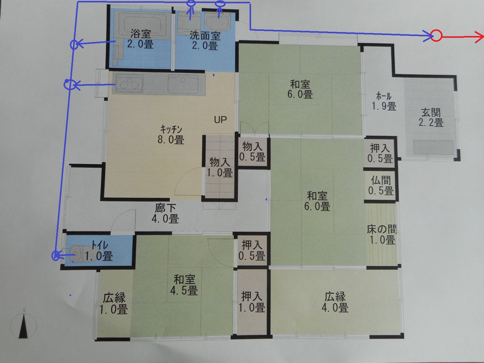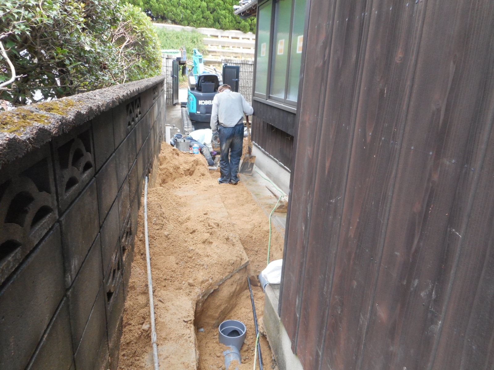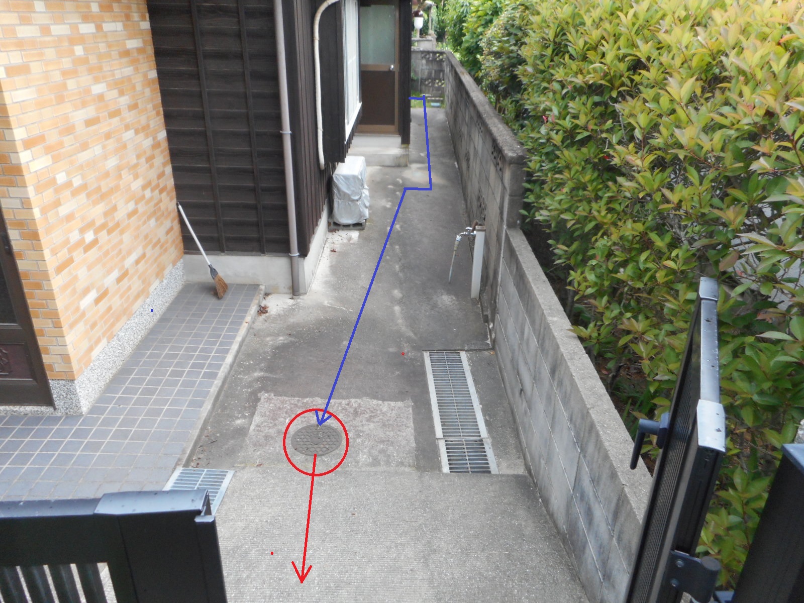 | 現在は、敷地内の○の所に道路にある本管と繋がった 枡があります!! | 道路の本管と繋がった敷地内の枡○までこれからーのルートで敷地内の下水道の整備をします!! |