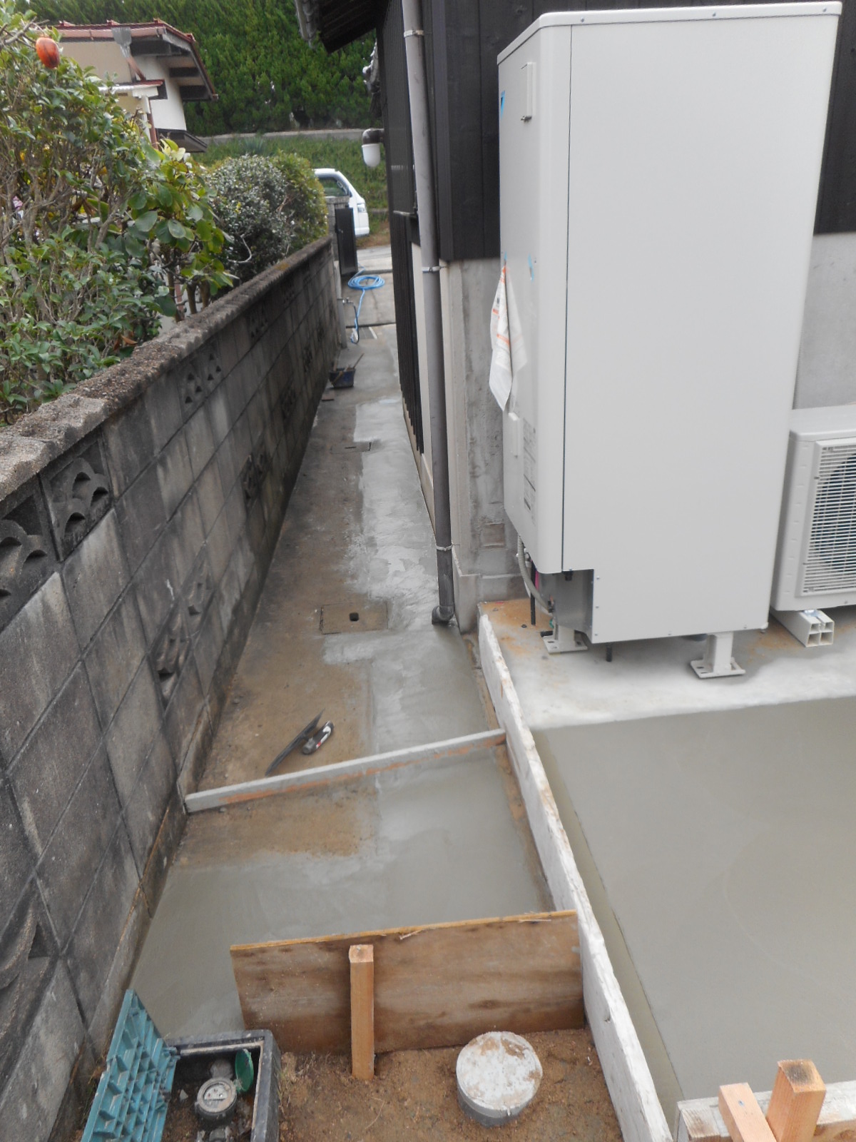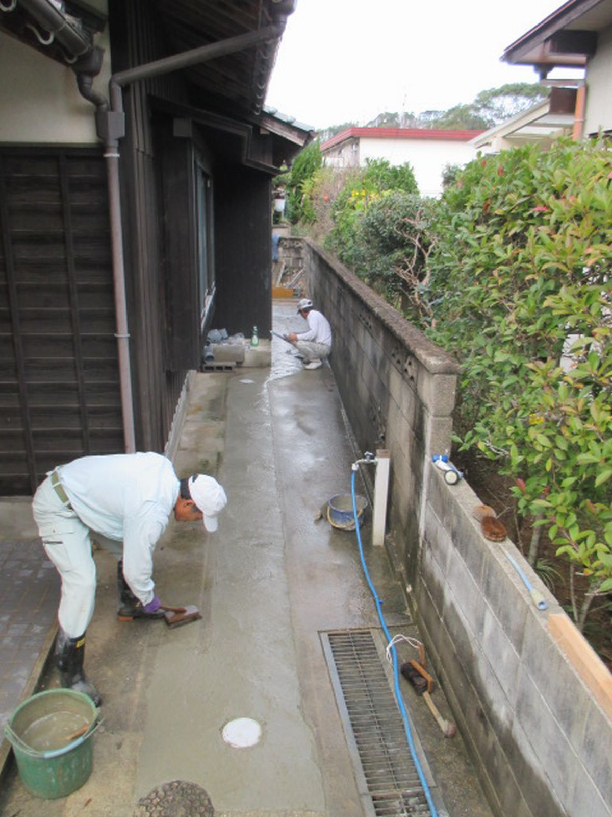 | 下水道管の布設整備が終わったら、仕上げの生コンを打ちます!! | 最後に、コテで押さえて仕上げます!! |