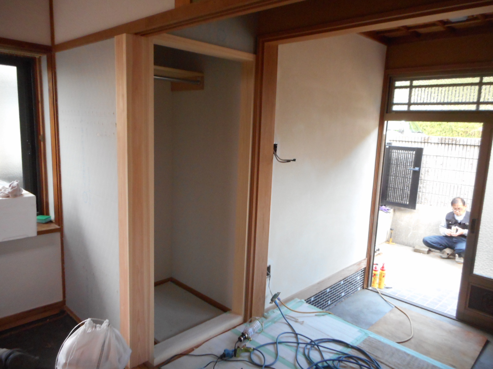 | 最初に電気屋さんが、クロゼットの中になってしまうスイッチとコンセントを移設します!! | 新規の柱を建て、造作をします!! |