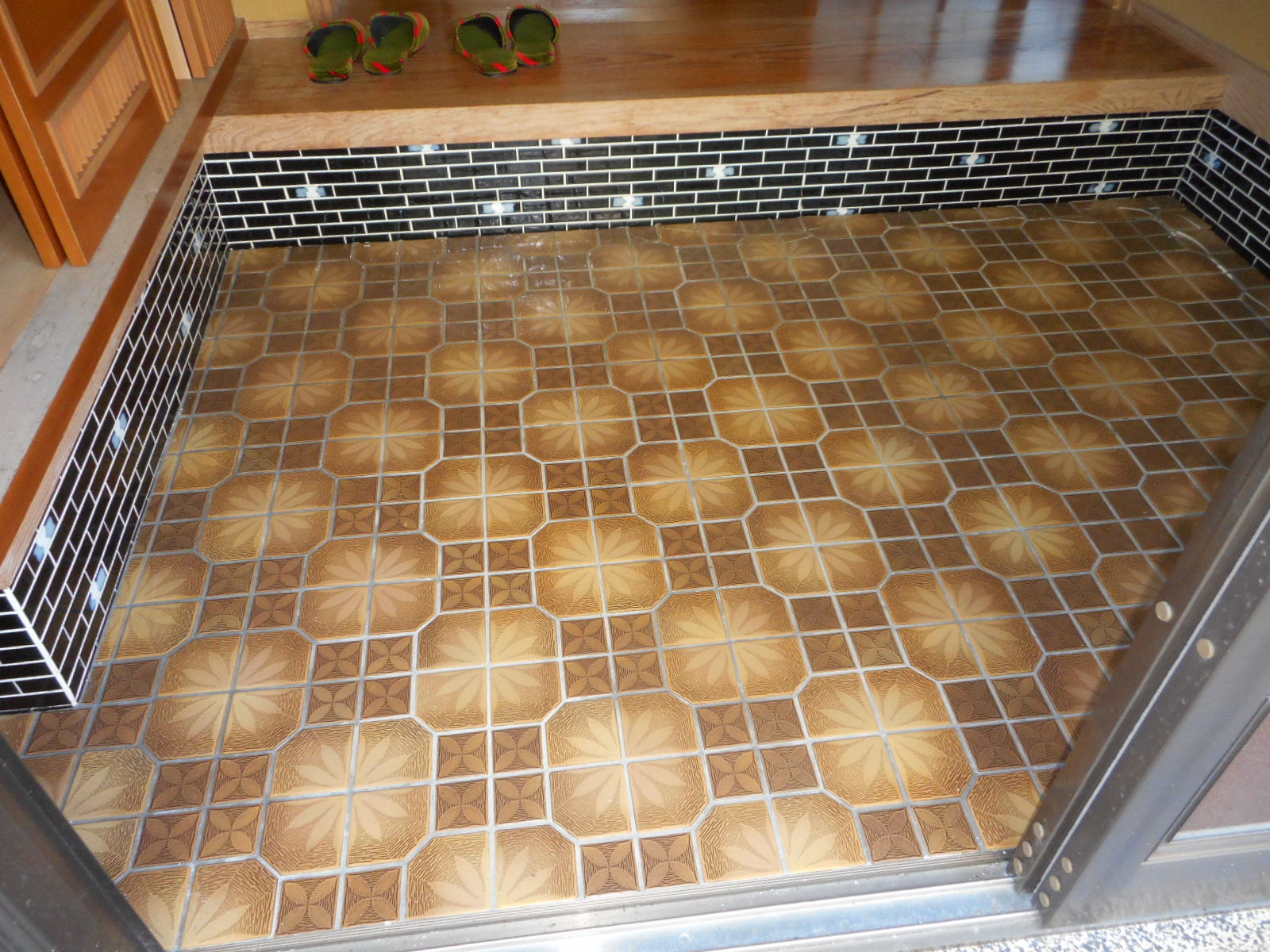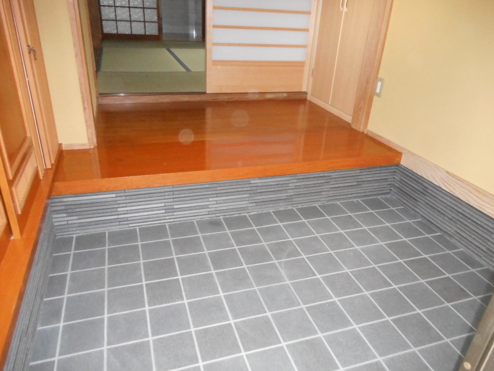 土間のタイルの一部が割れていることと、タイルの色が気にいらないと言うことで立上り部分も含めて、全面張替えることにしました。