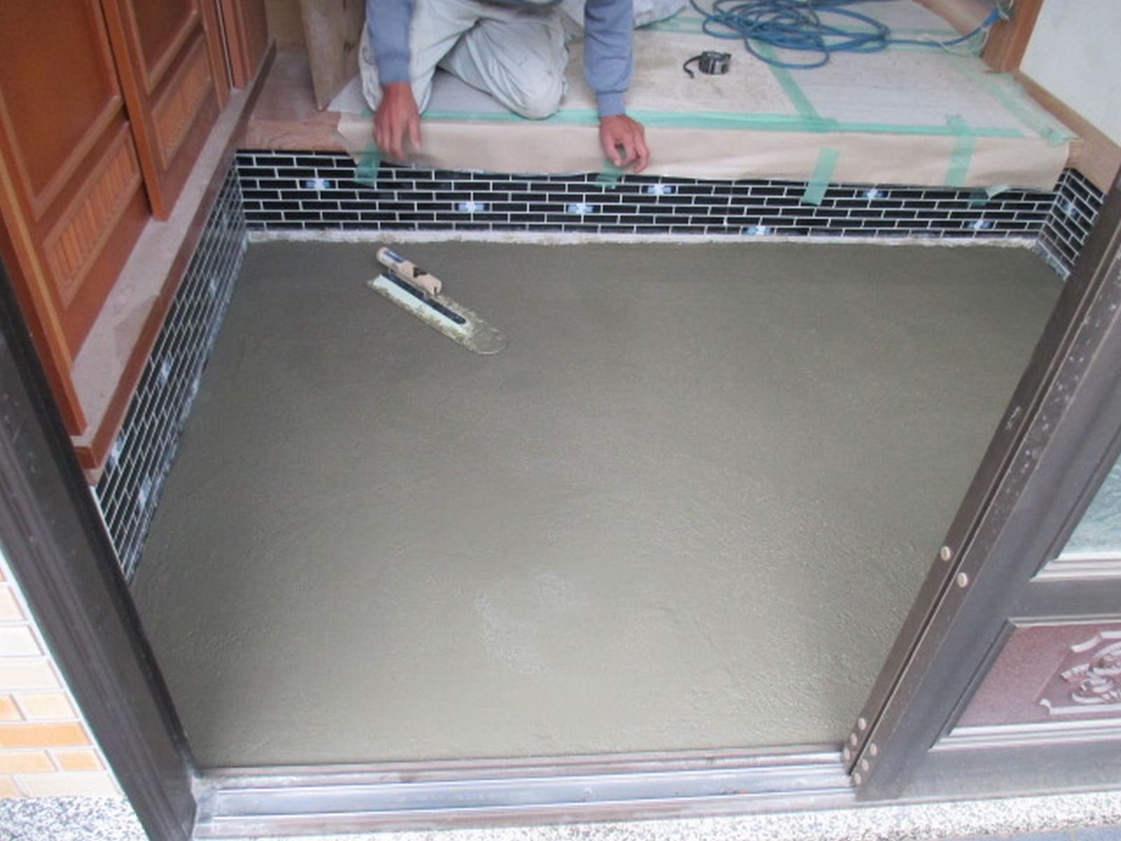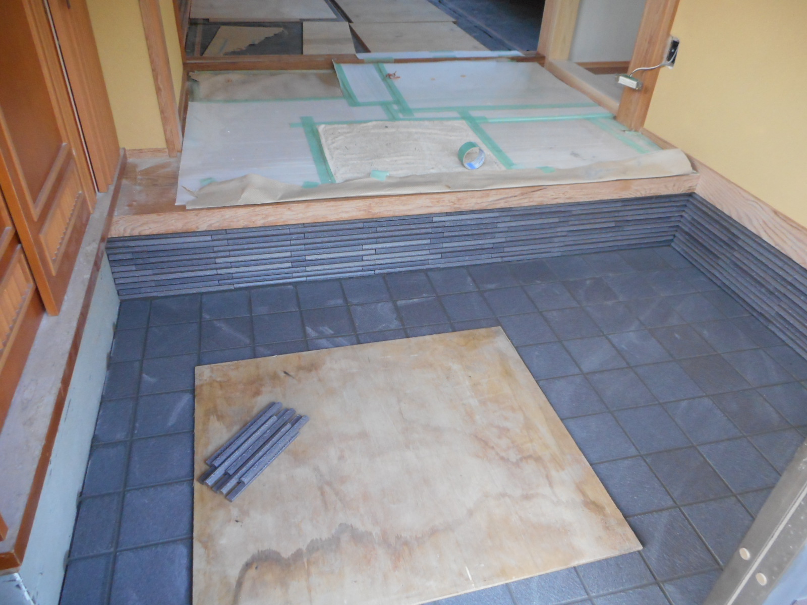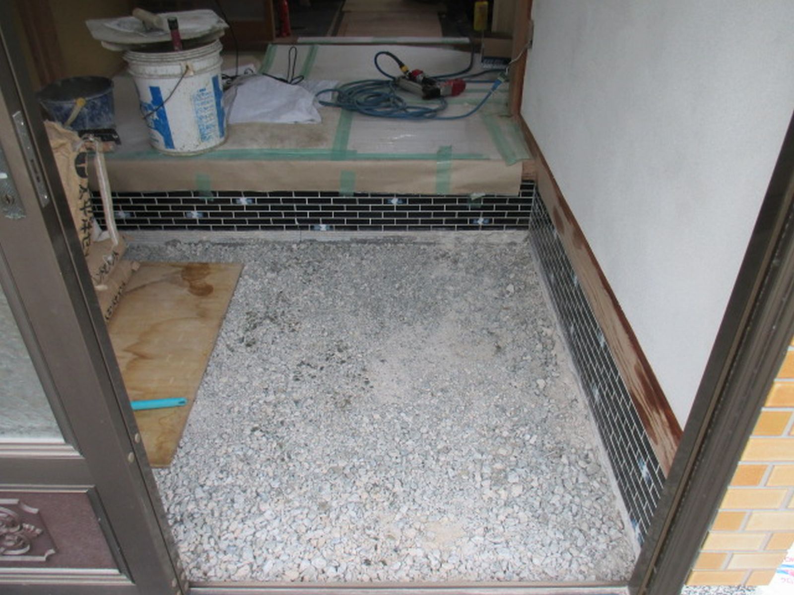 | 土間に、下地モルタルを打ちました!! | 新規のタイルを、張って行きます!! |