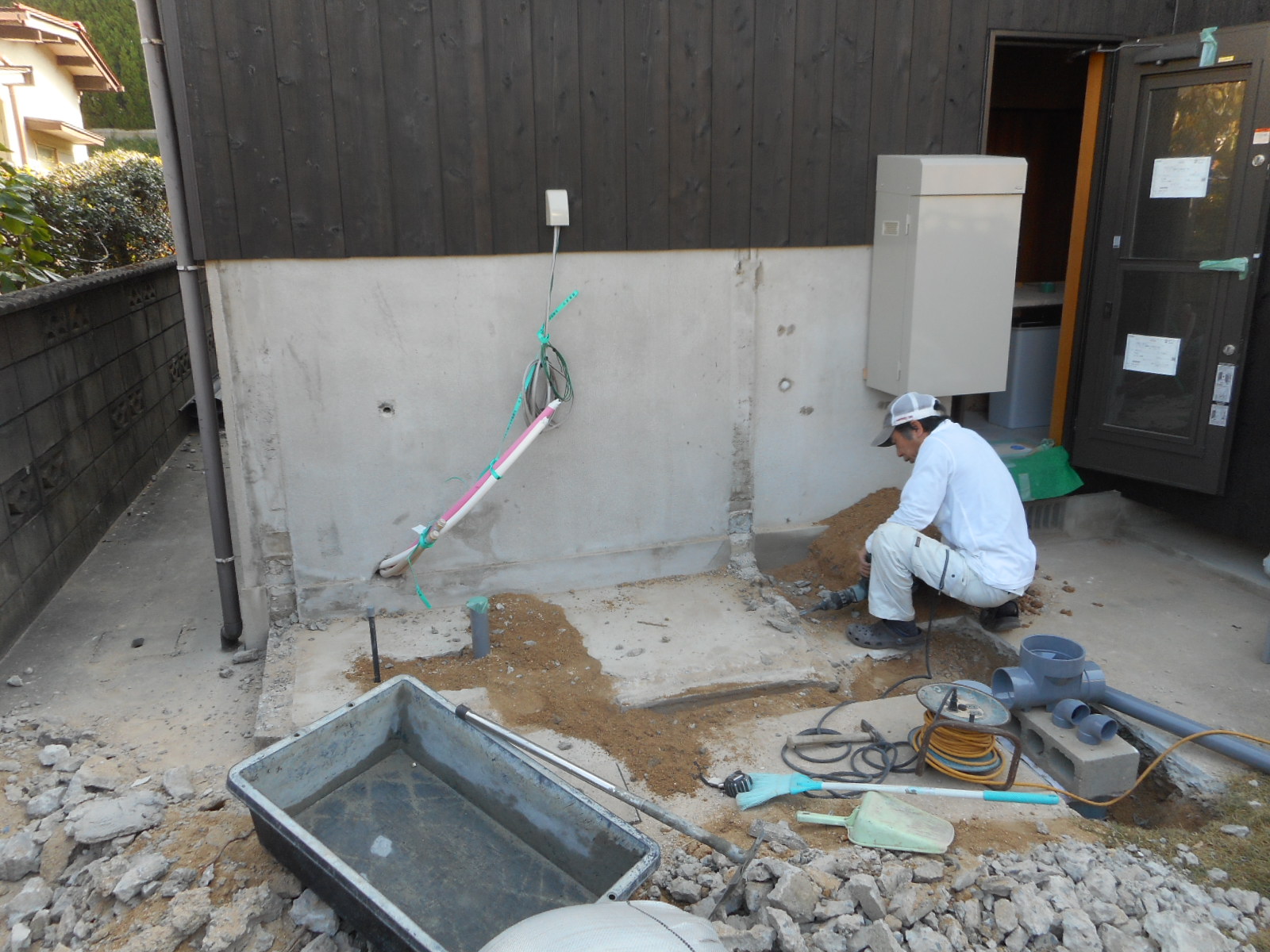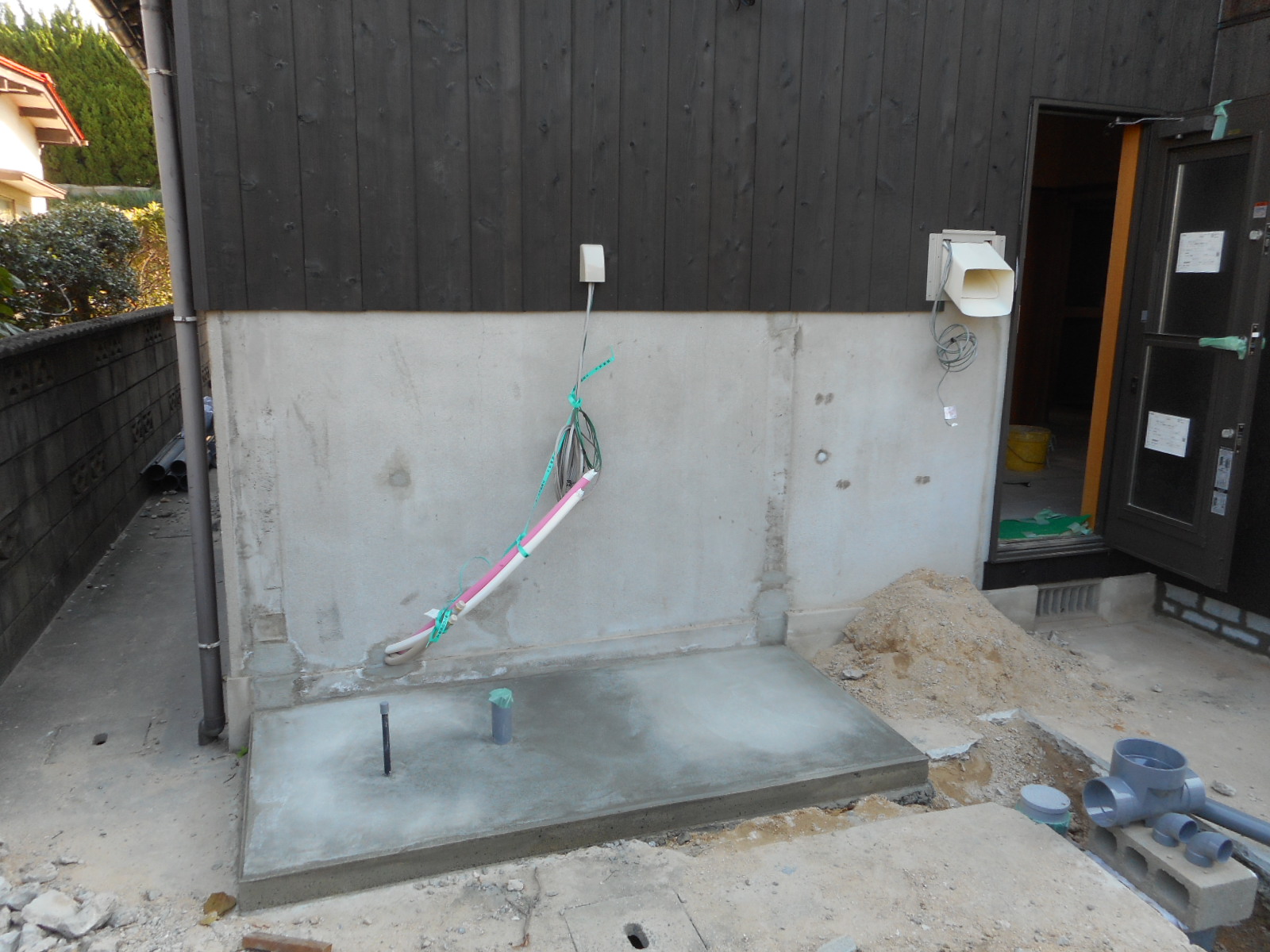 | 既設の灯油ボイラーを撤去し、給排水管の整備をします!! | エコキュートを設置する台を、製作しました!! |