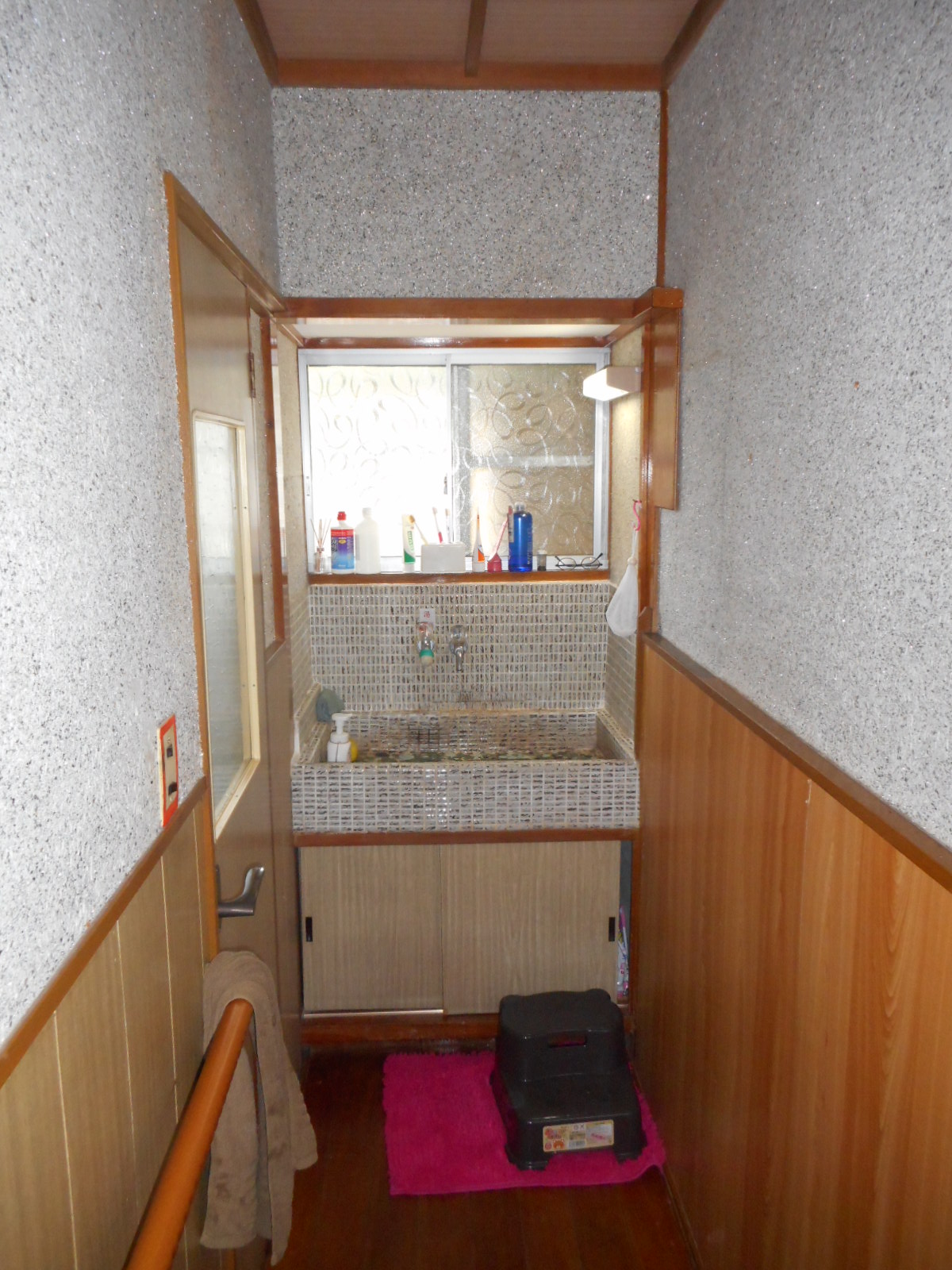 ご覧の様に昔よくあった左官さん手造りの洗面台のため、これを取り壊し新規に化粧台を取付ける工事と天井と壁廻り(腰板から上)に下地づくり後クロスを張り、床も下地づくり後CFを張ることになりました。
