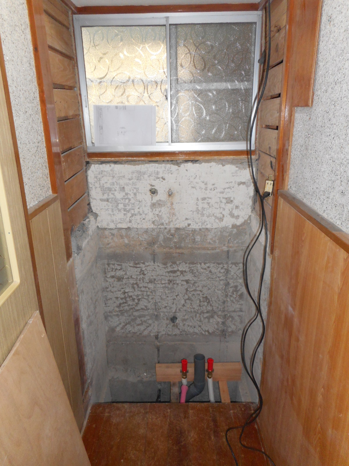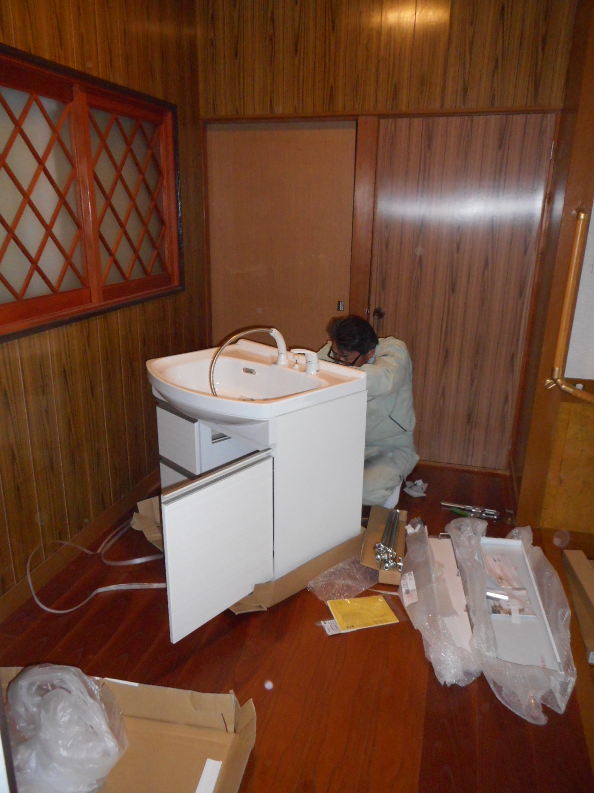 | 既存の化粧台を解体、撤去します!! | 床の一部も解体し、新規の化粧台用の給水,給湯,排水管の移設、整備をしました!! |