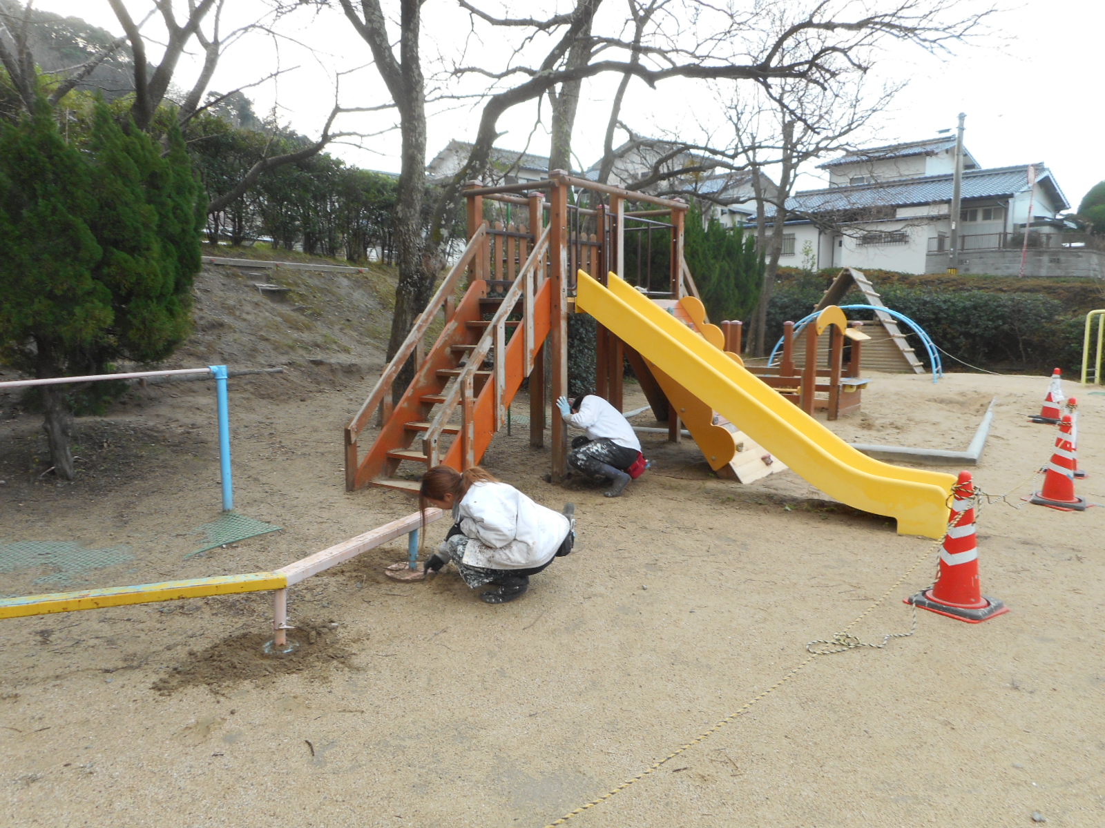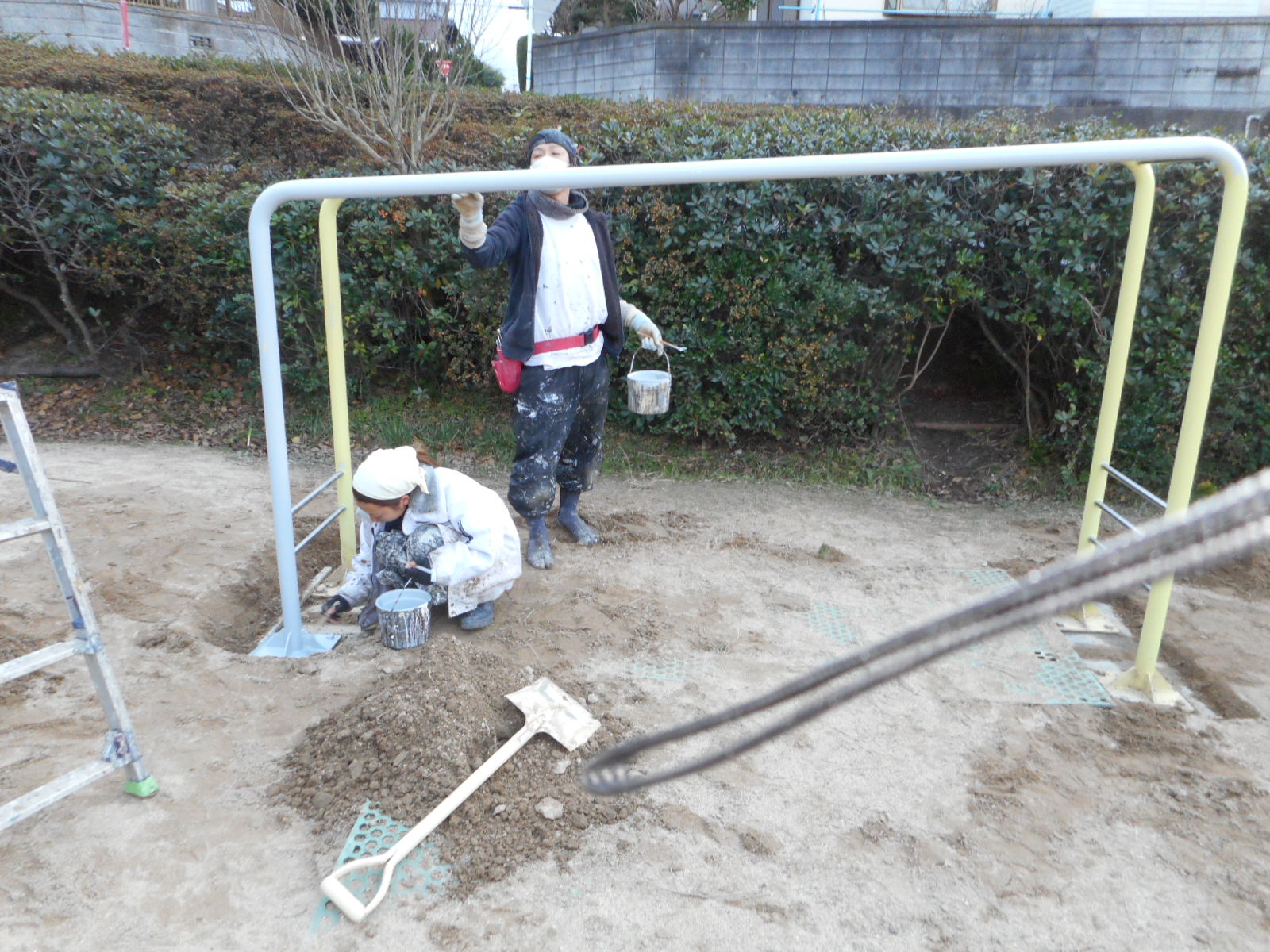| 他の遊具も、順次塗装をして行きます!! | 若い女性の職人さんも、寒い中頑張っています!! |