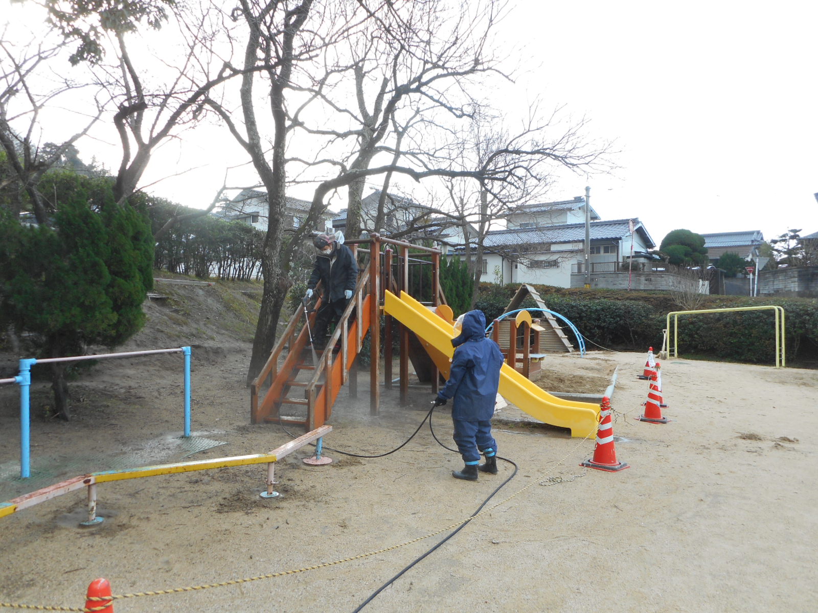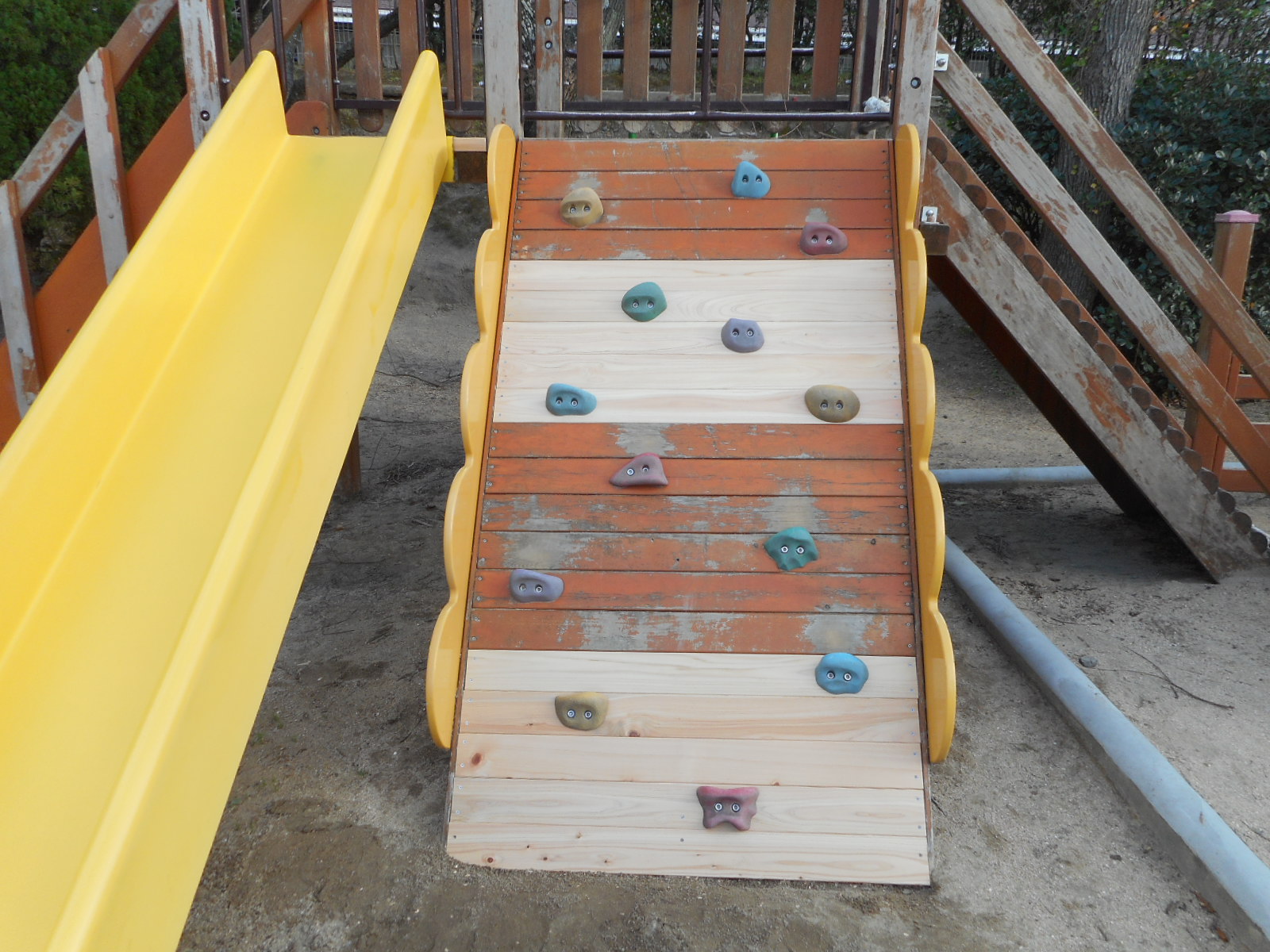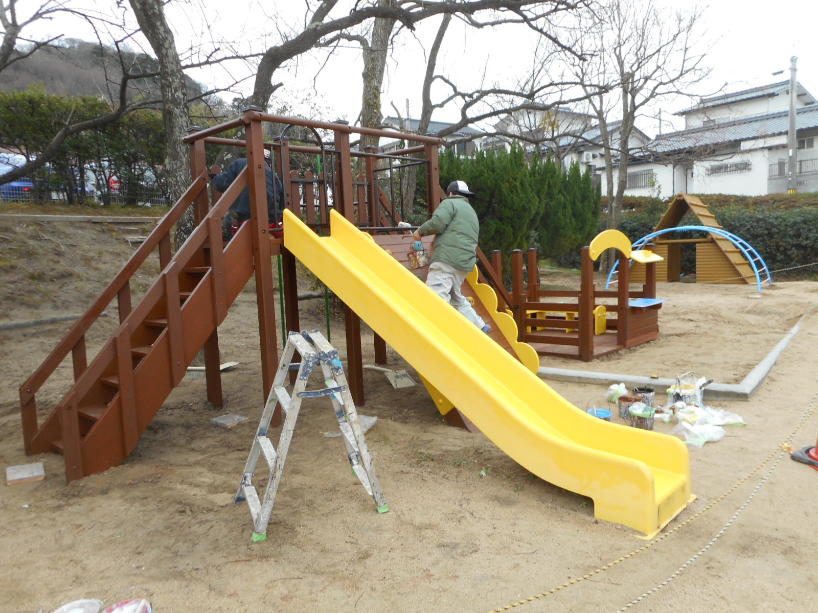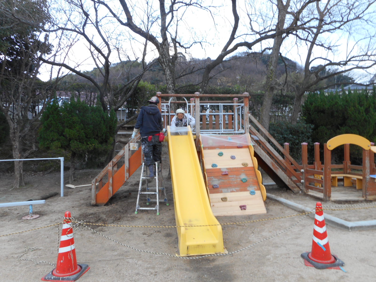 ※前々回のブログで、市内某大学のシャッターの取付け工事を紹介しましたが、今度はその大学の付属幼稚園の遊具の補修と塗装工事の依頼が有り、年明けの1/10~1/20まで行い、1/23に完成引渡しを終えました。