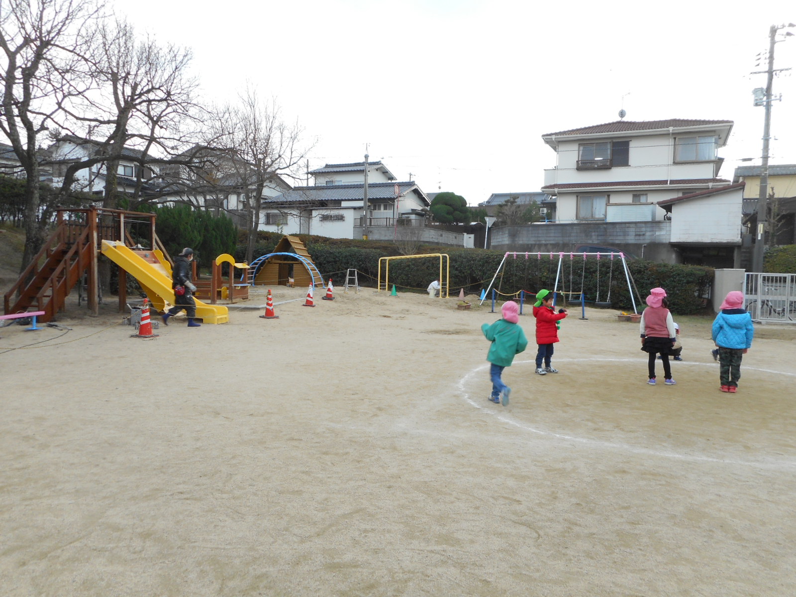 | 園児たちは、待ちきれない様子です!! | 遊具で遊べないので、グランドで遊んでいます!! |