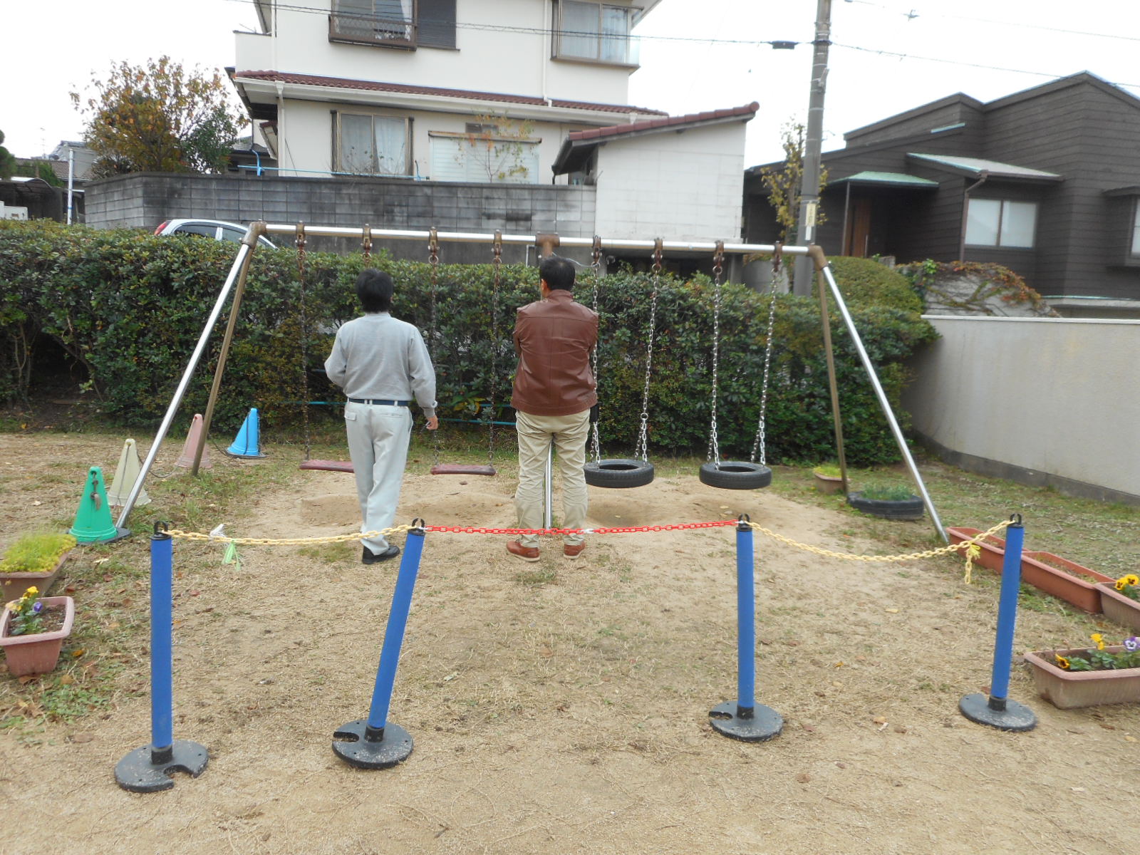 | この遊具も、上がる時に足をかける横の丸棒の状態が悪いので、両面総入れ替えをします!! ⇒ | 撤去作業中!! |
