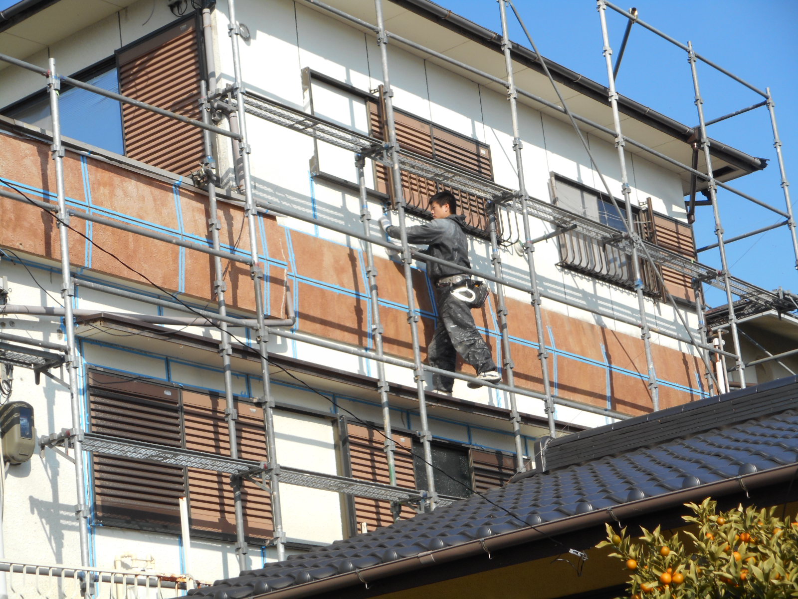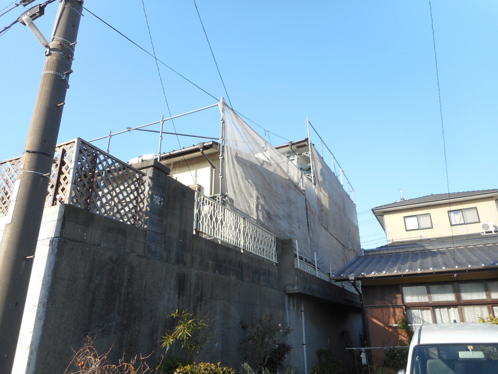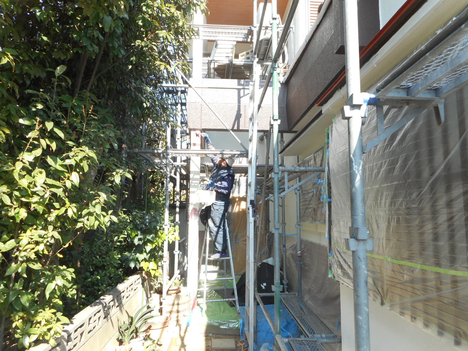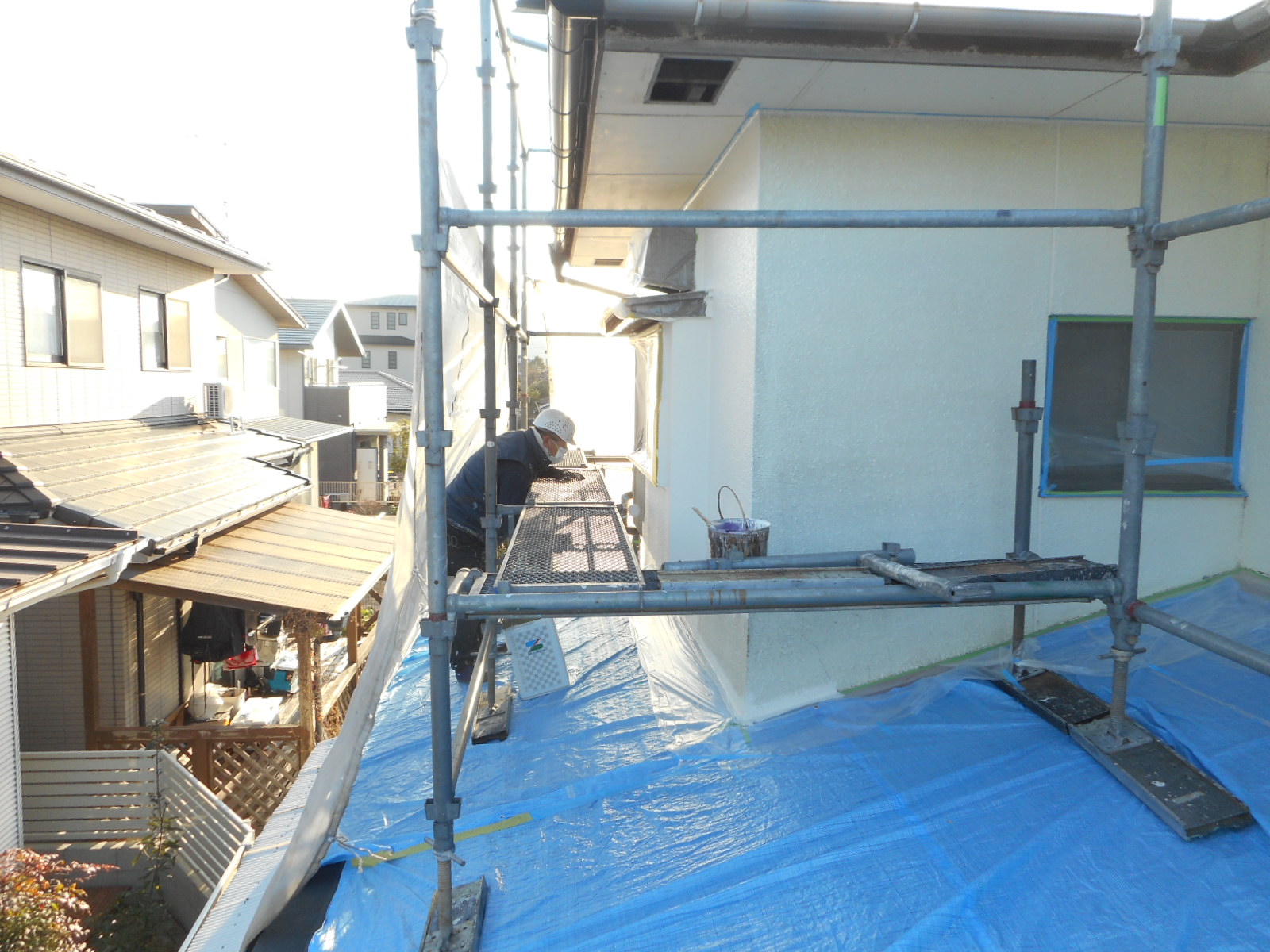 | サッシ廻り等に塗料が付かない様に、養生をします!! | 近所に迷惑がかからない様に、シートを張って作業をします!! |