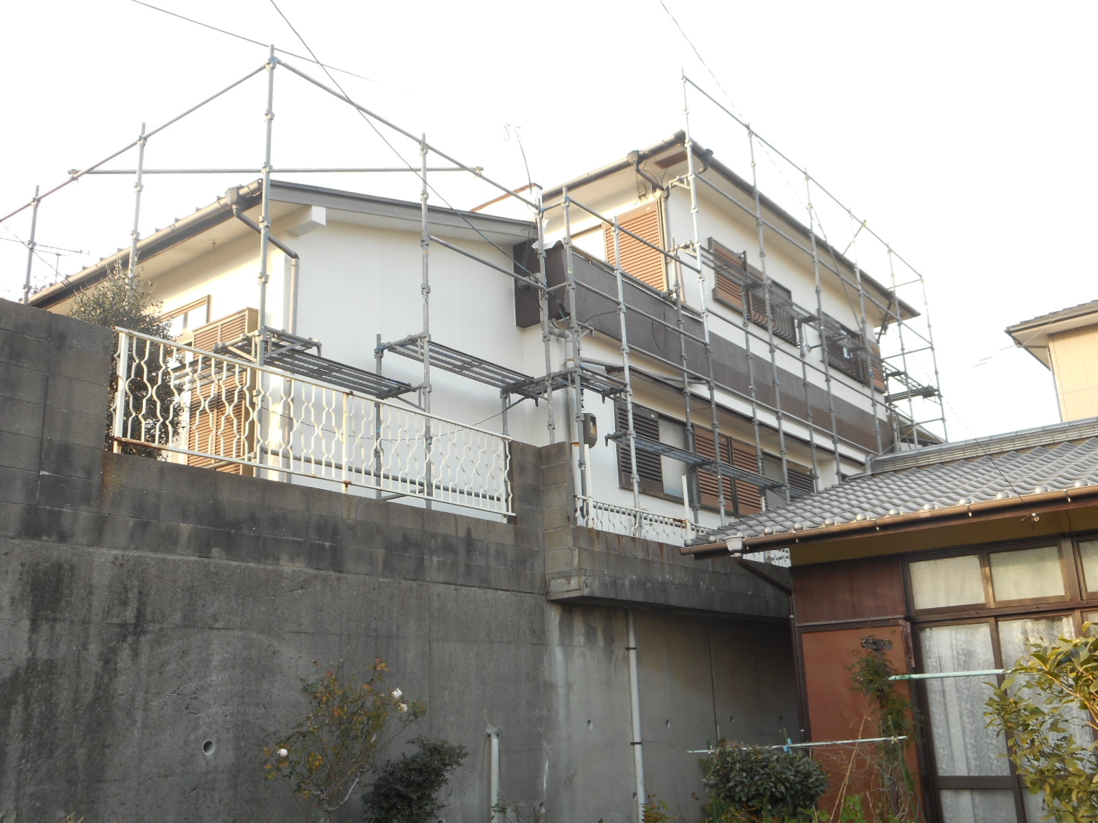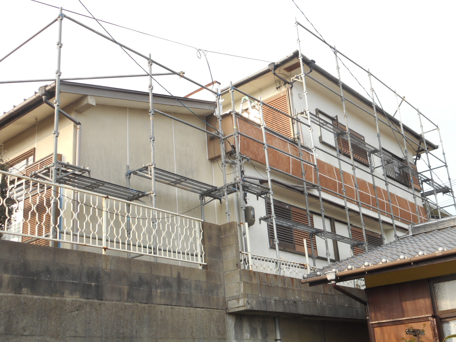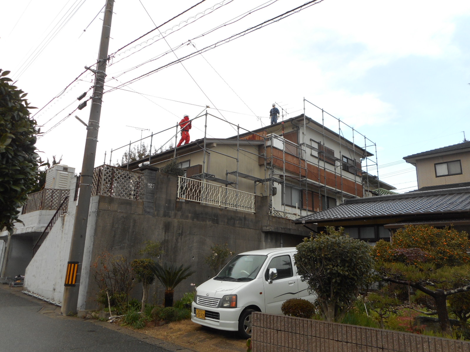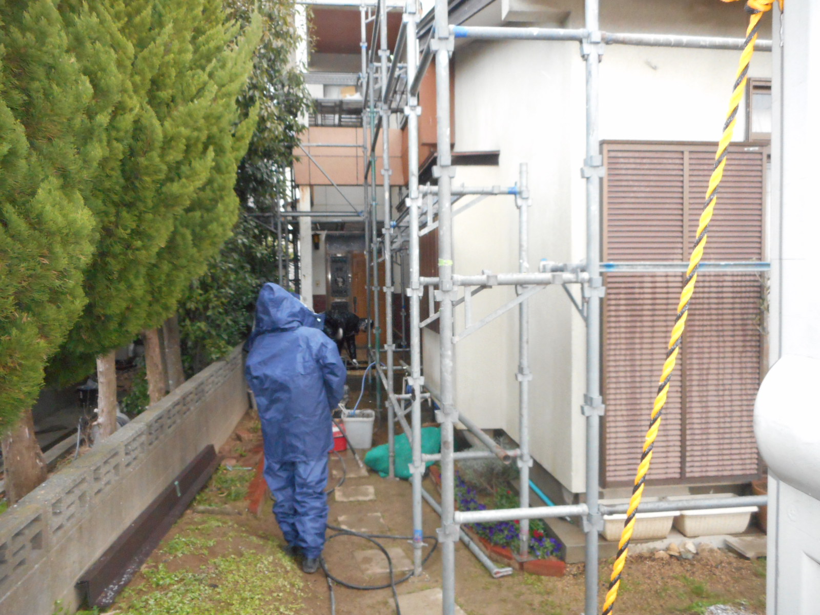 | 作業に必要な、足場を組みます!! | 壁廻りを、しっかり高圧洗浄します!! |