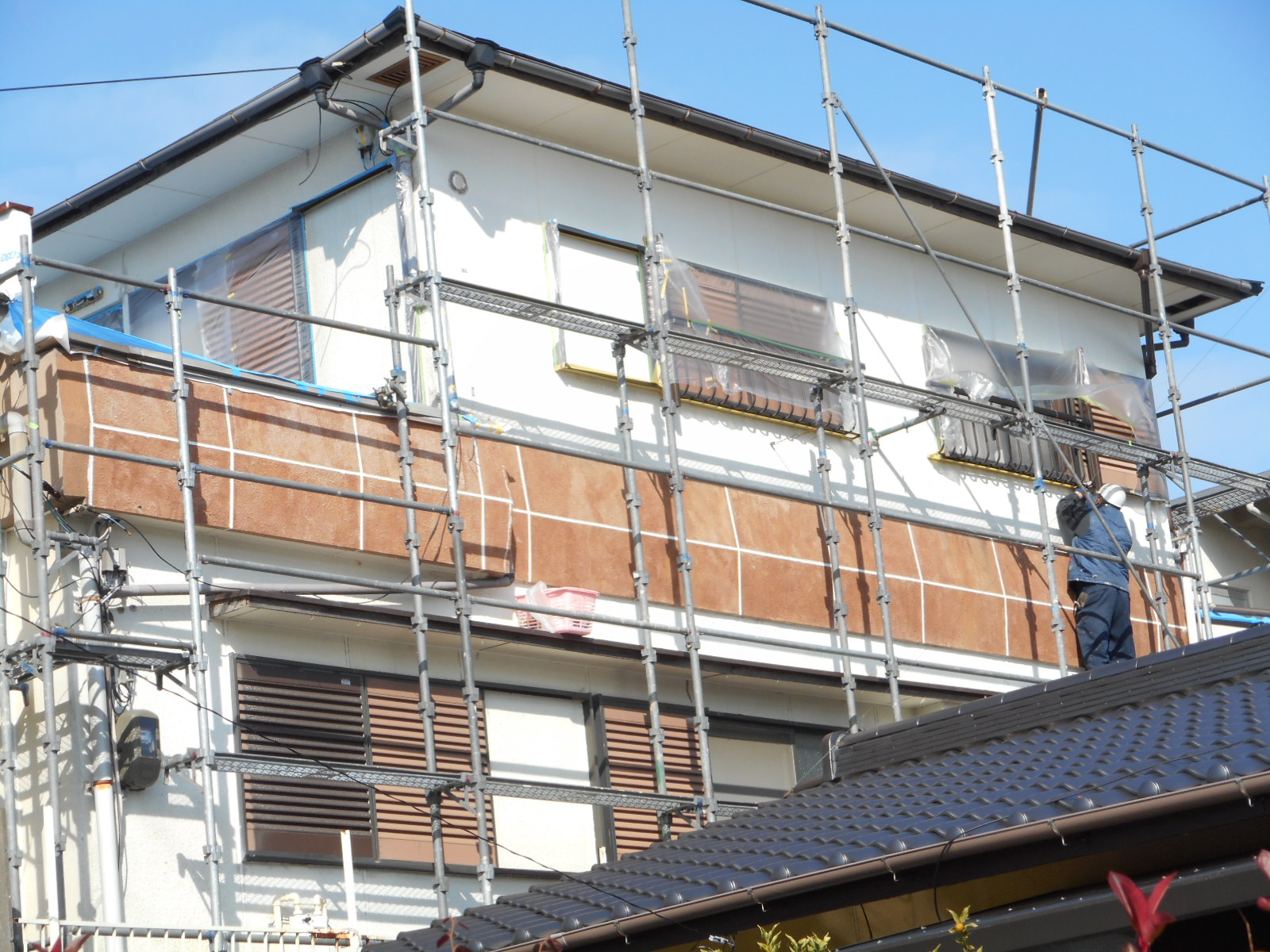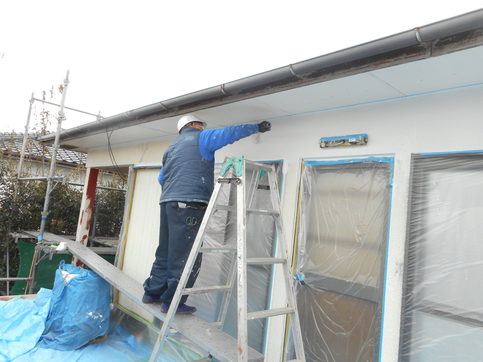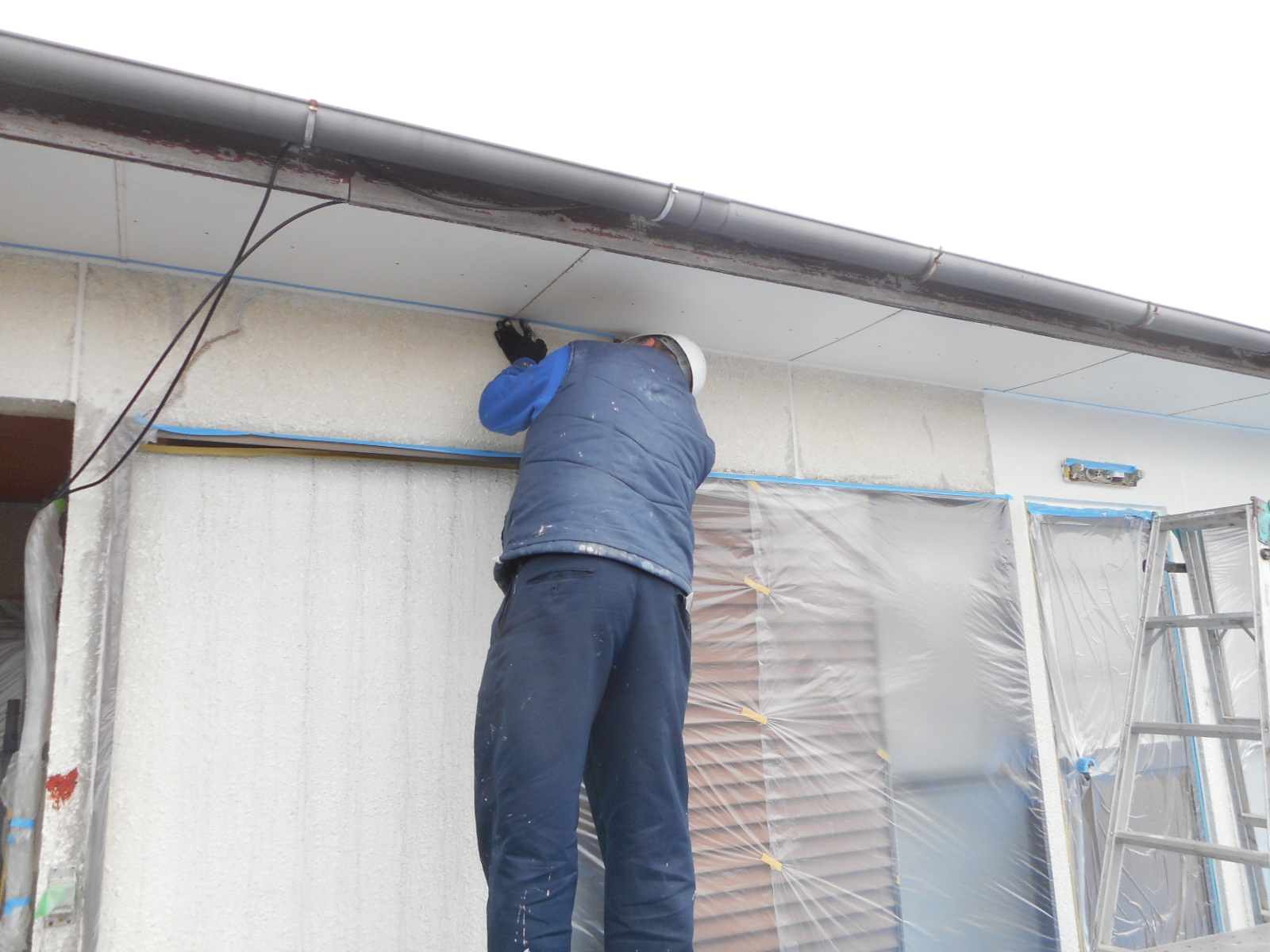 | 軒に塗料が付かない様に、養生テープを張ります!! | 塗装をして行きます!! |