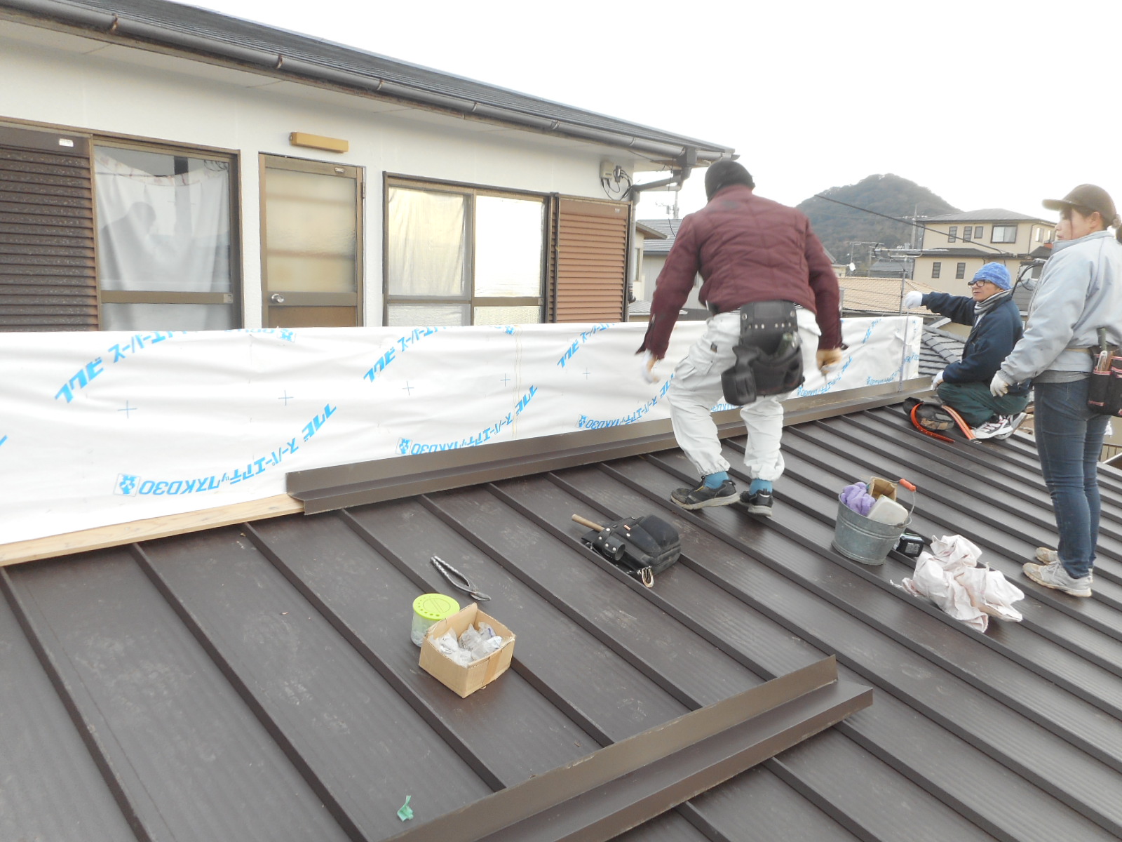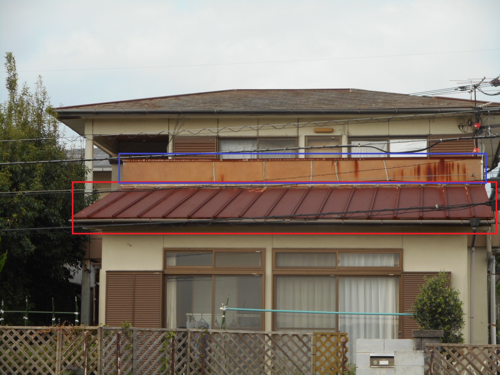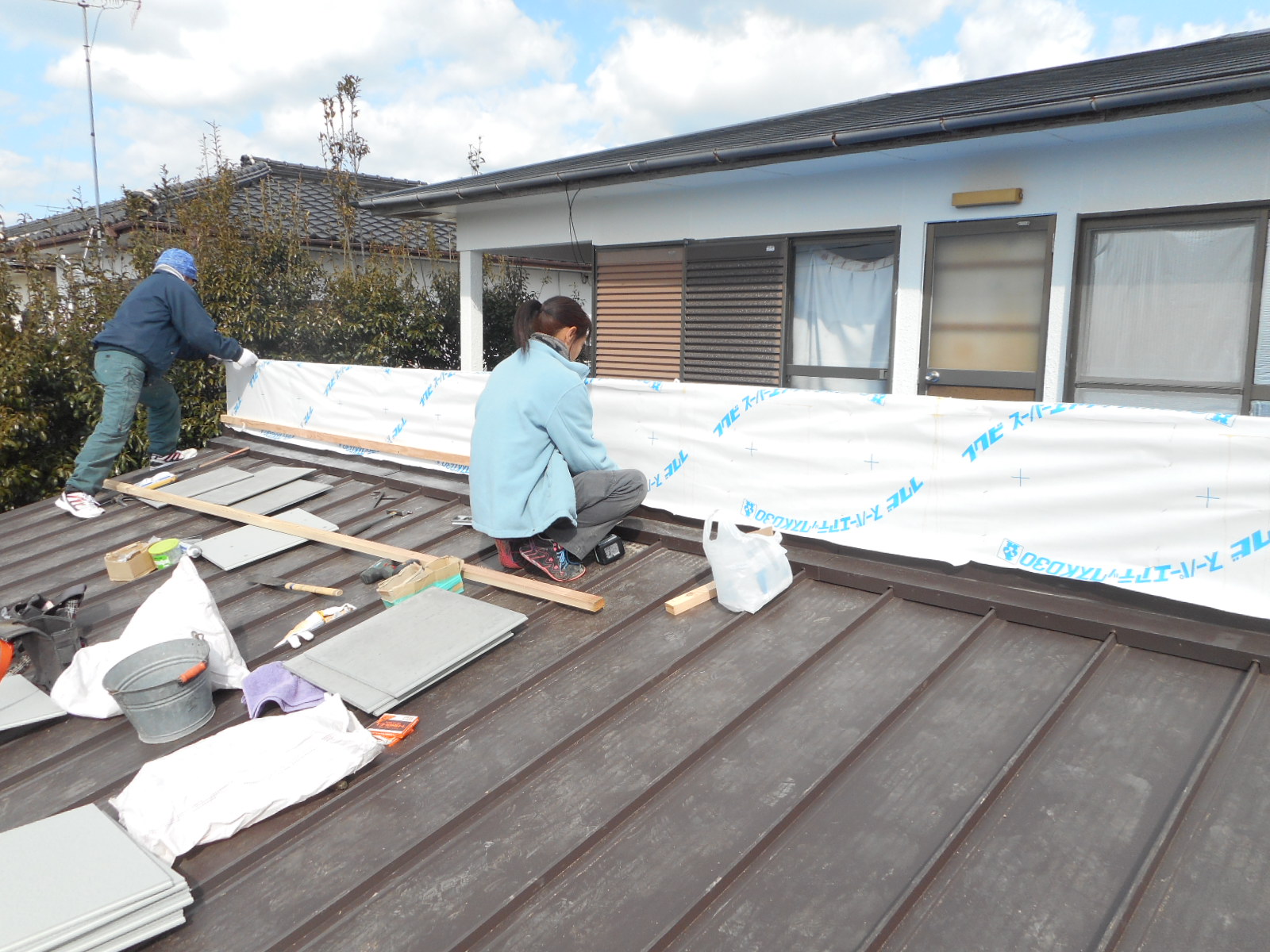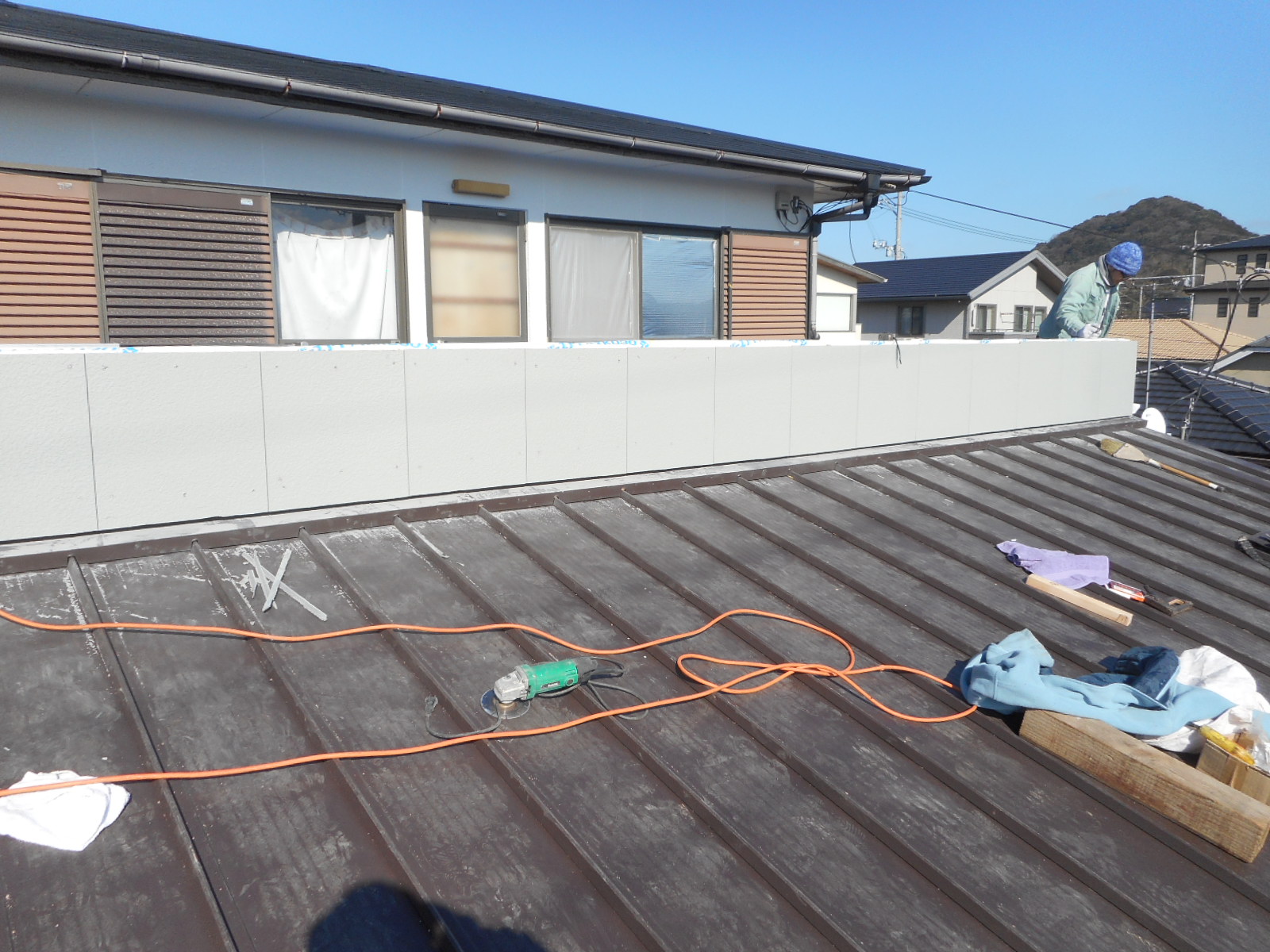 | 工事前の外観(□部分<両面>)を改修します)!! | 下の瓦棒の交換と、立ち上がり壁は解体から防水シート張りまで作業は終わっていました!! |