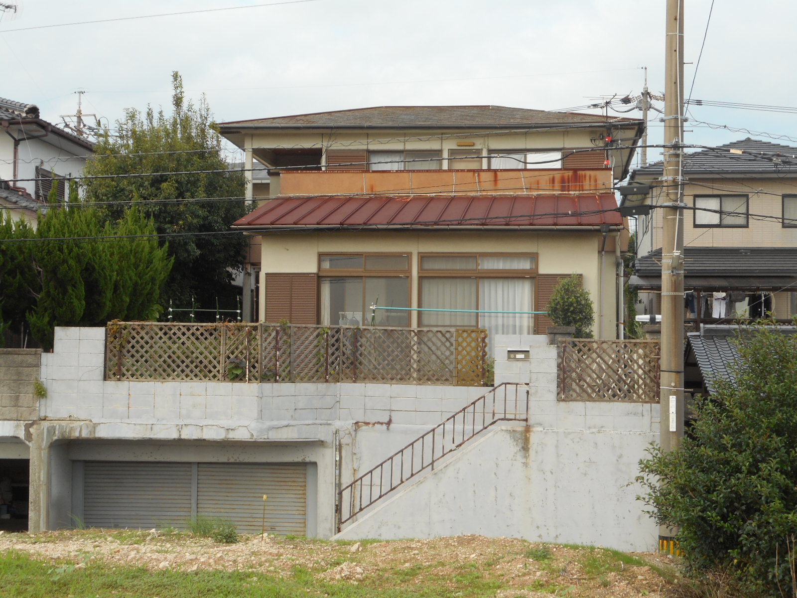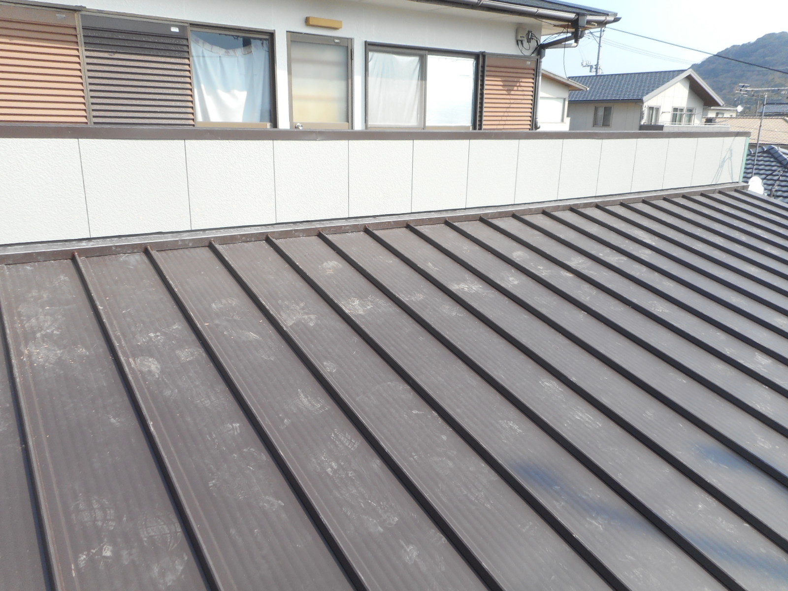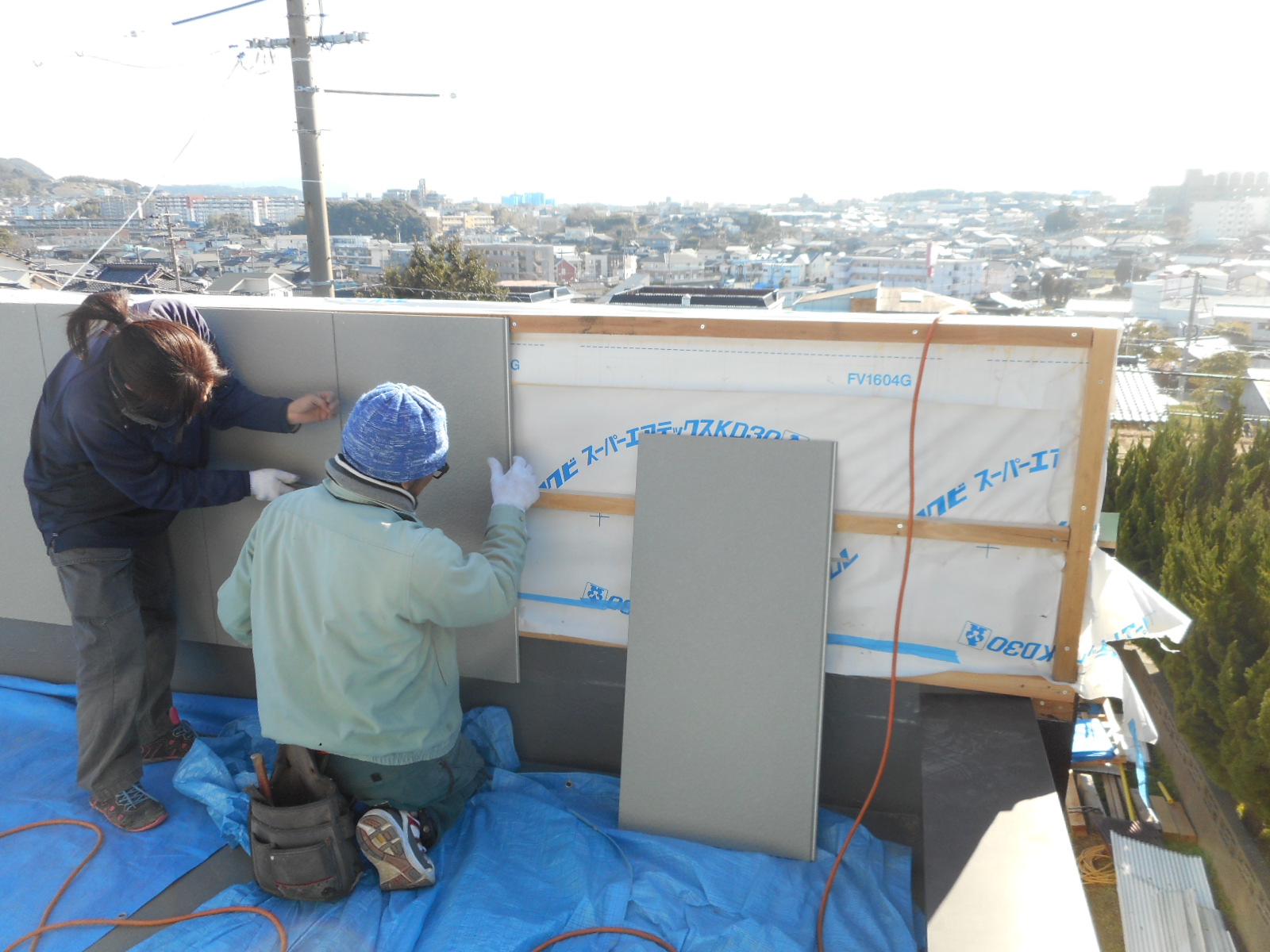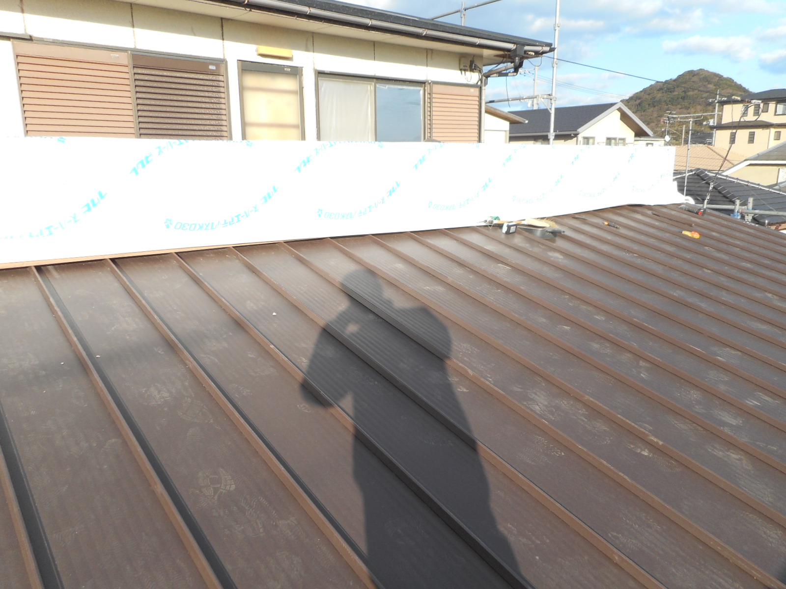 | 工事前の外観(□部分<両面>)を改修します)!! | 下の瓦棒の交換と、立ち上がり壁は解体から防水シート張りまで作業は終わっていました!! |