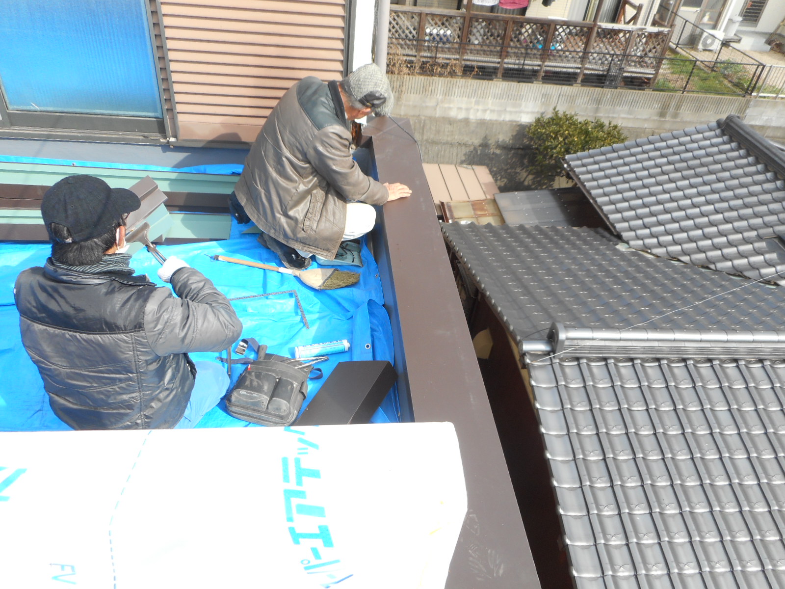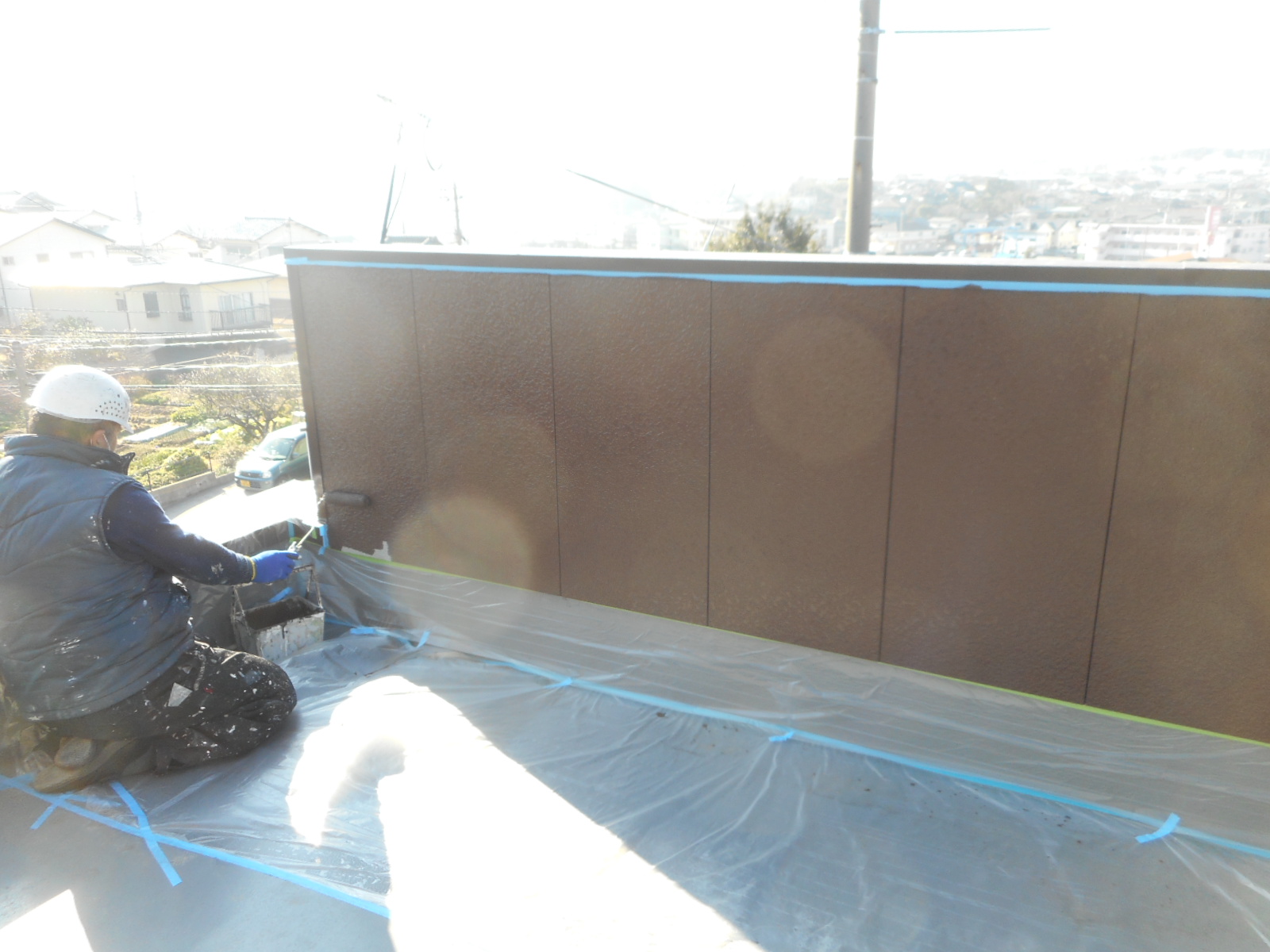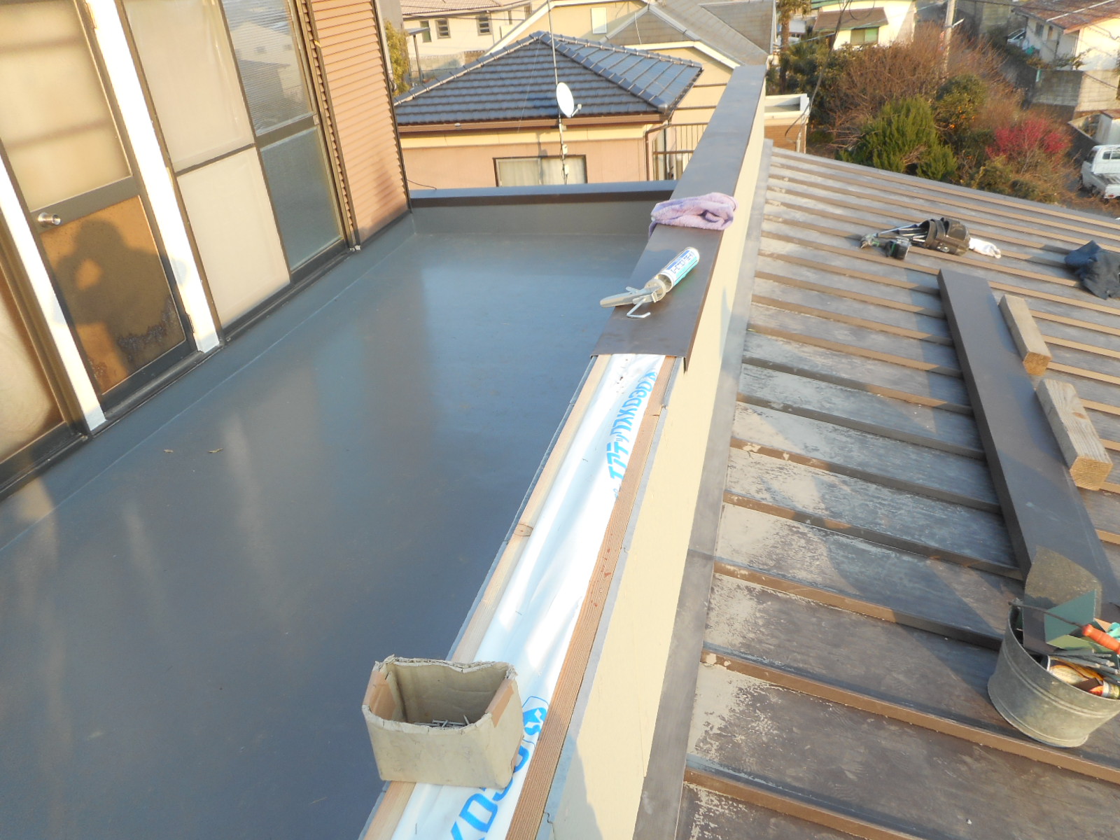 ◎前々回のブログで紹介した様に、バルコニーの床の防水工事が終わったので、ここからの続きの作業を行います。