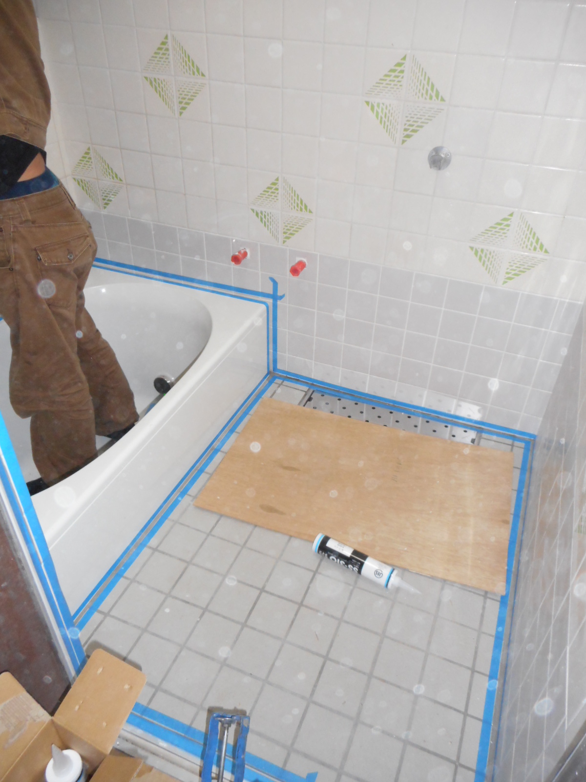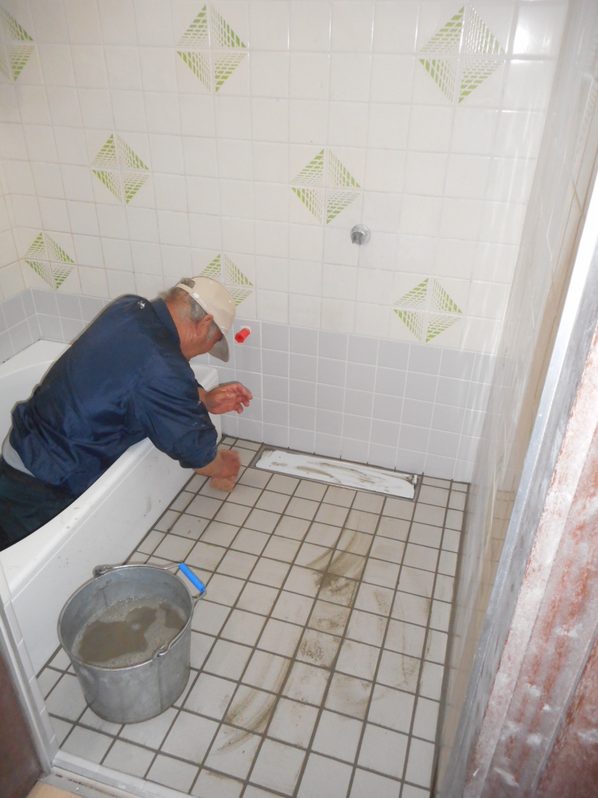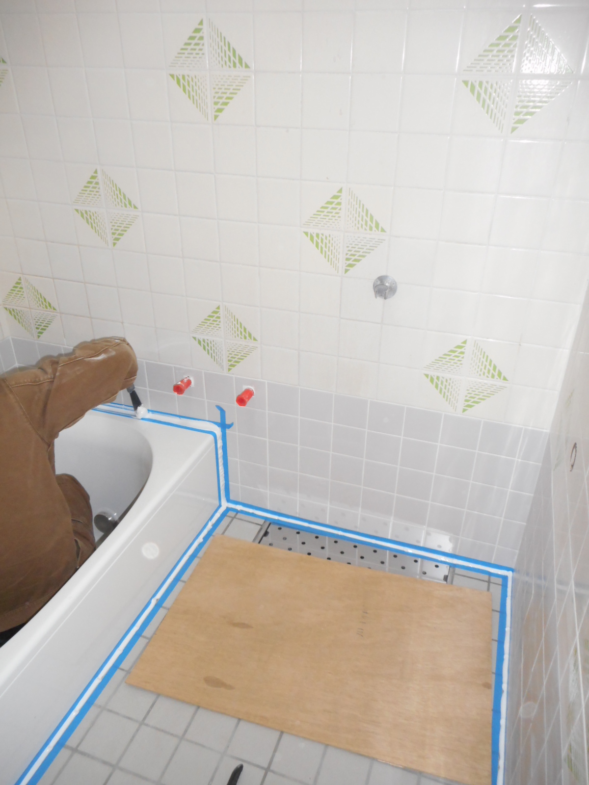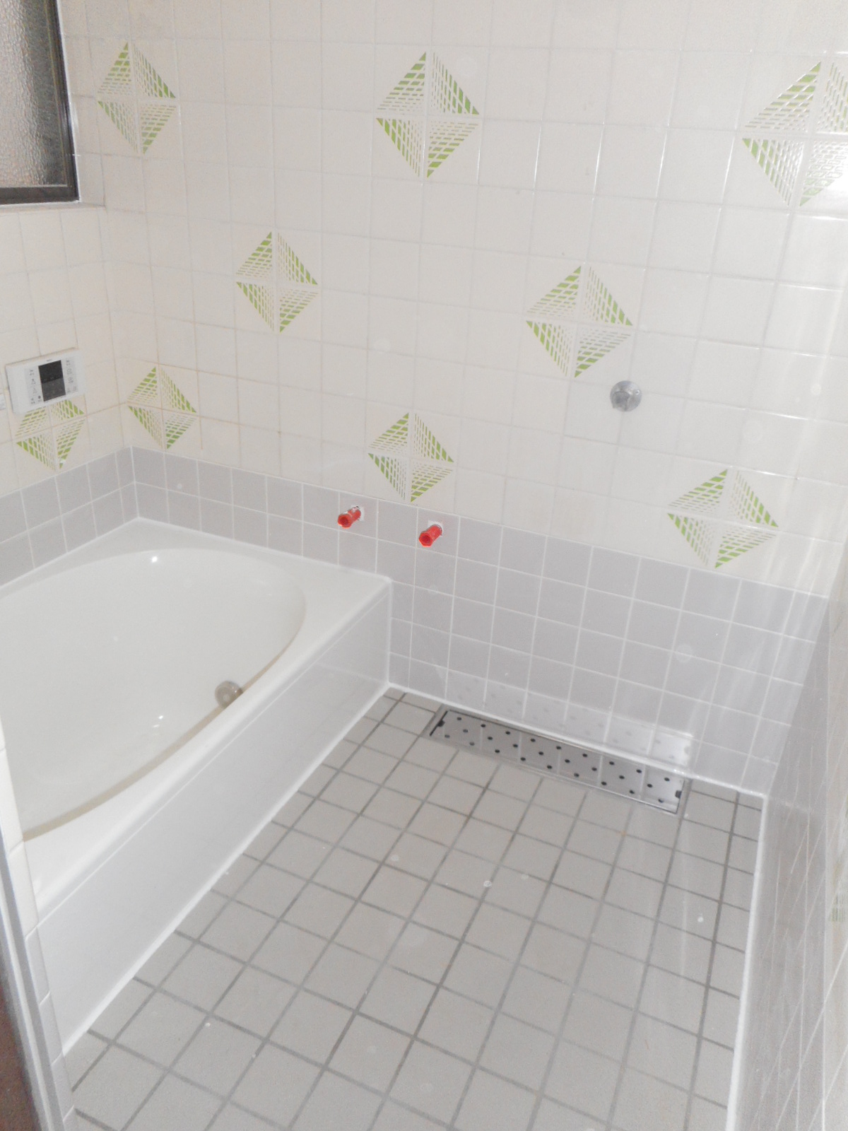今回の浴室の改修は、古くなった浴槽の交換と、それに合わせて洗い場のタイルの張替え、シャワー水栓の交換、動きの悪い入り口折れ戸と換気扇の交換を行います。