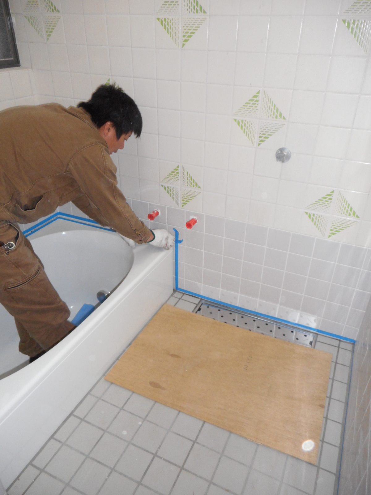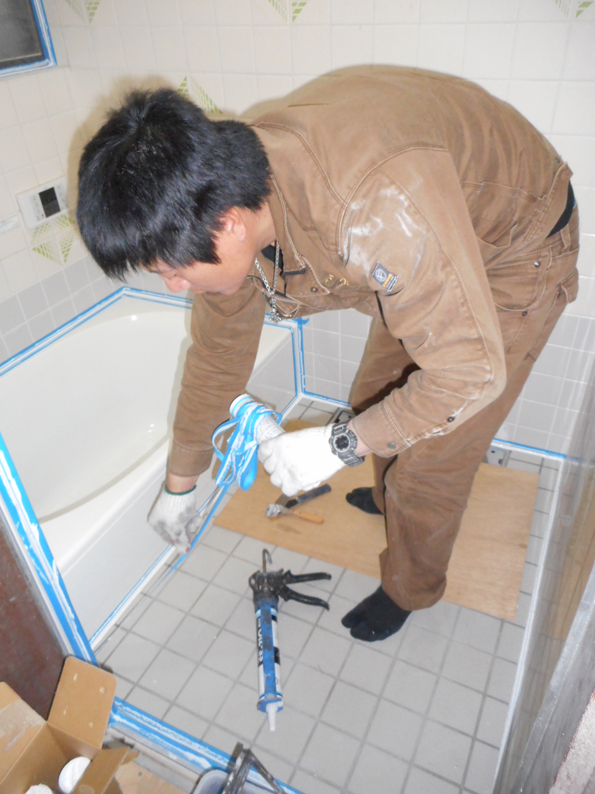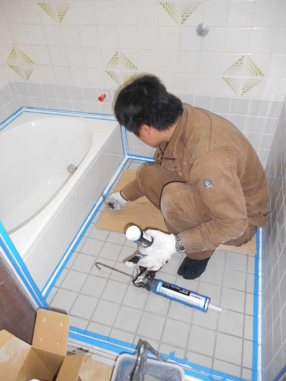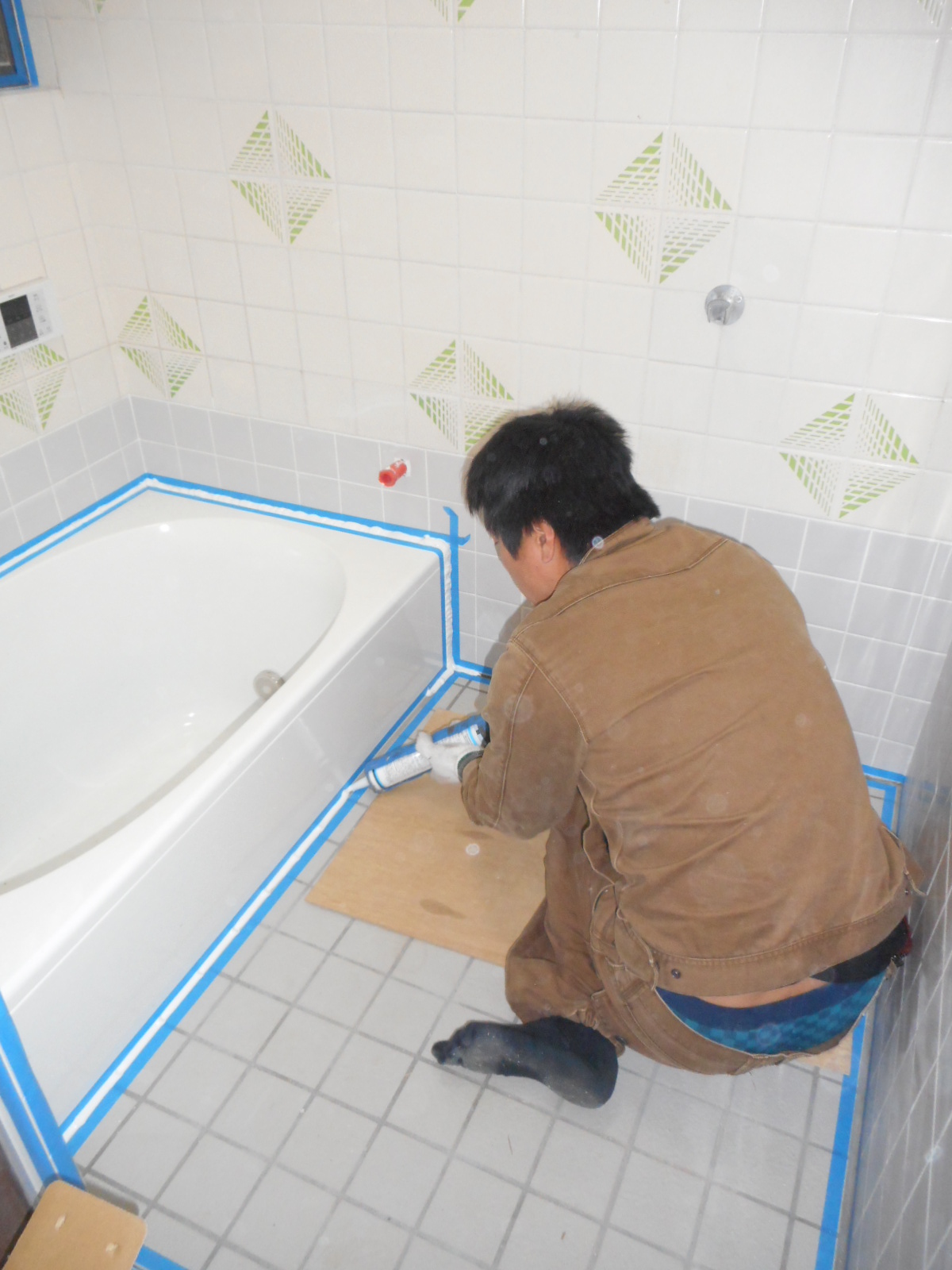 | 浴槽廻りに、コーキングを打って行きます!! | 洗い場のコーナーにも、コーキングを打ちます!! |