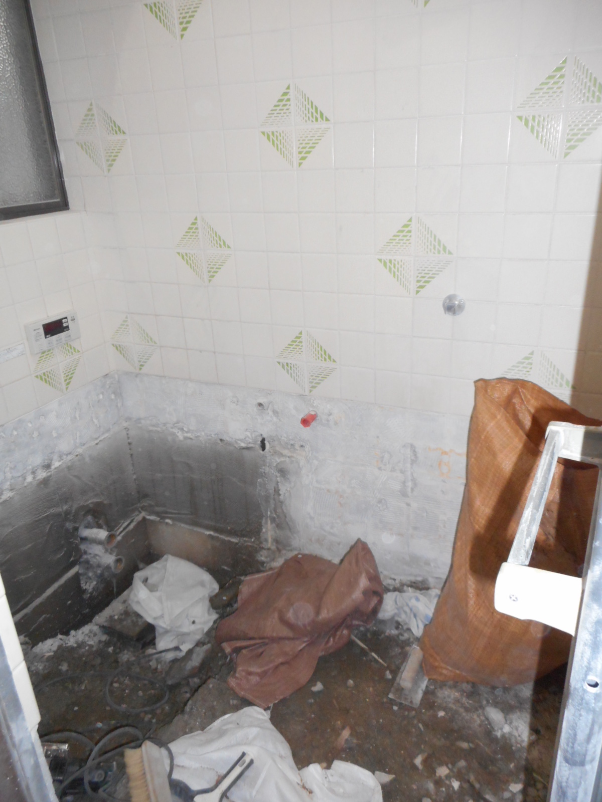 浴槽を解体、撤去し壁廻りのタイルの下部<水栓の部分から下>と洗い場の土間部分もすべて、ご覧の様に解体、撤去しました!!