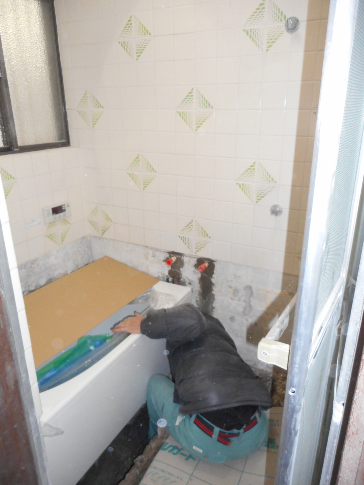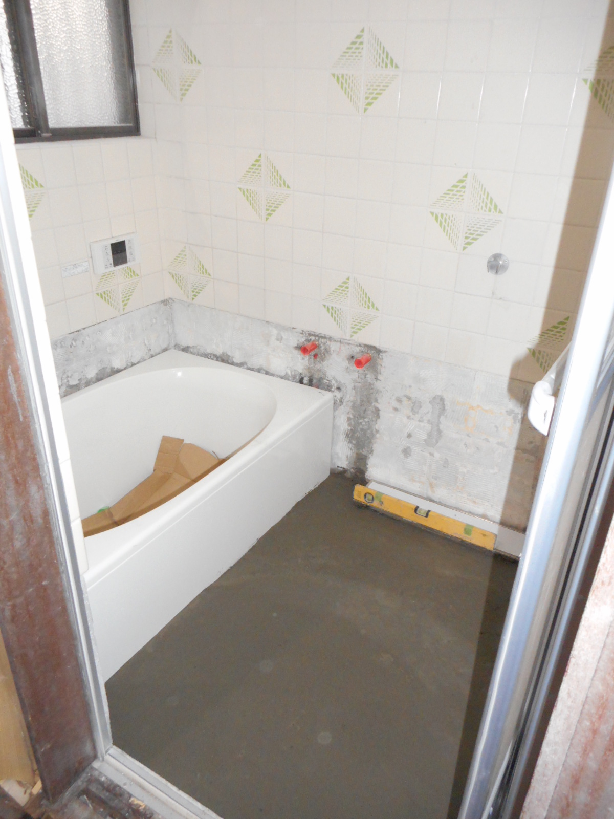 | 給水、給湯、排水管、追炊き配管の整備をし 浴槽据付けの下地づくりが完了しました!! |