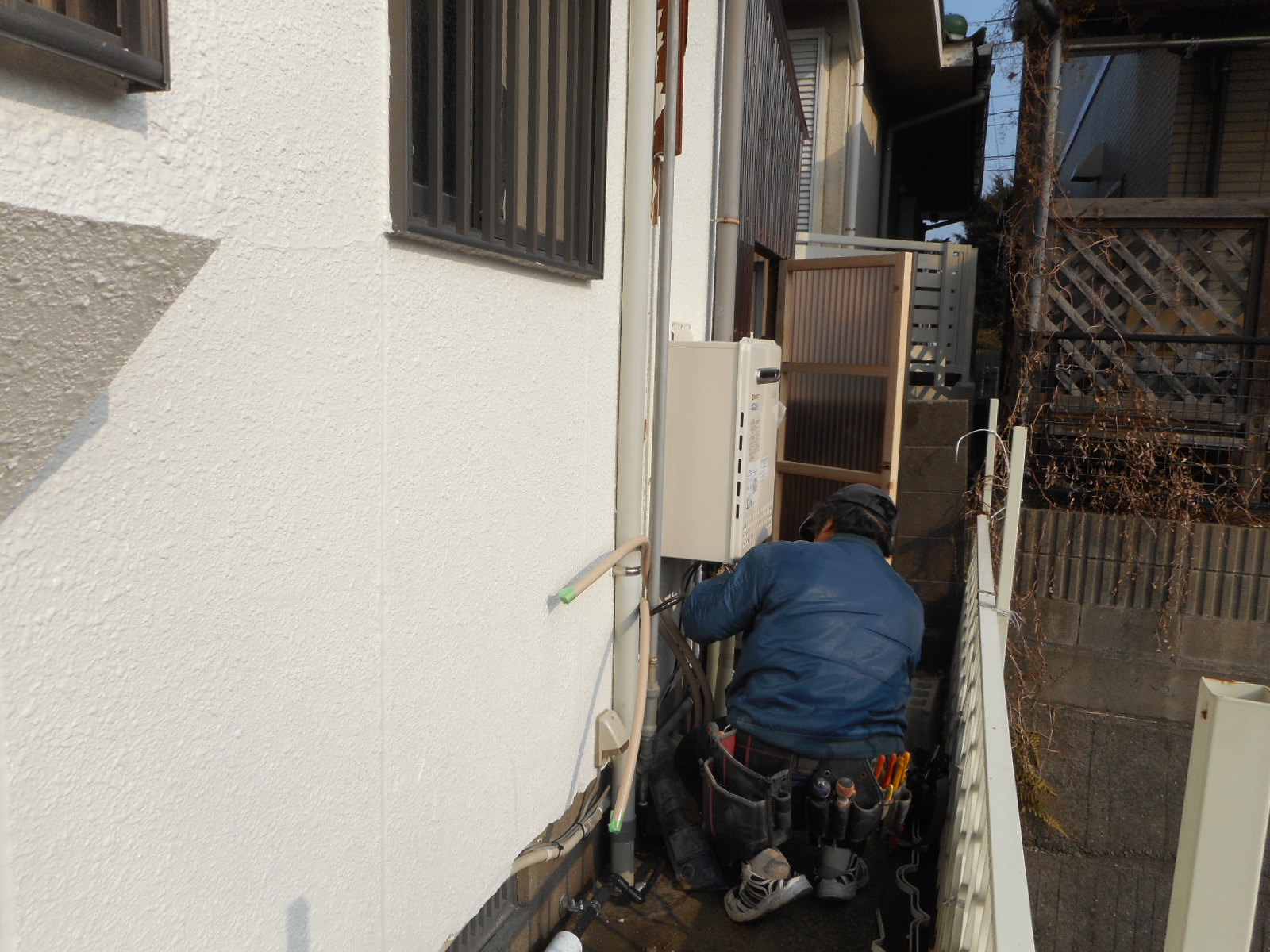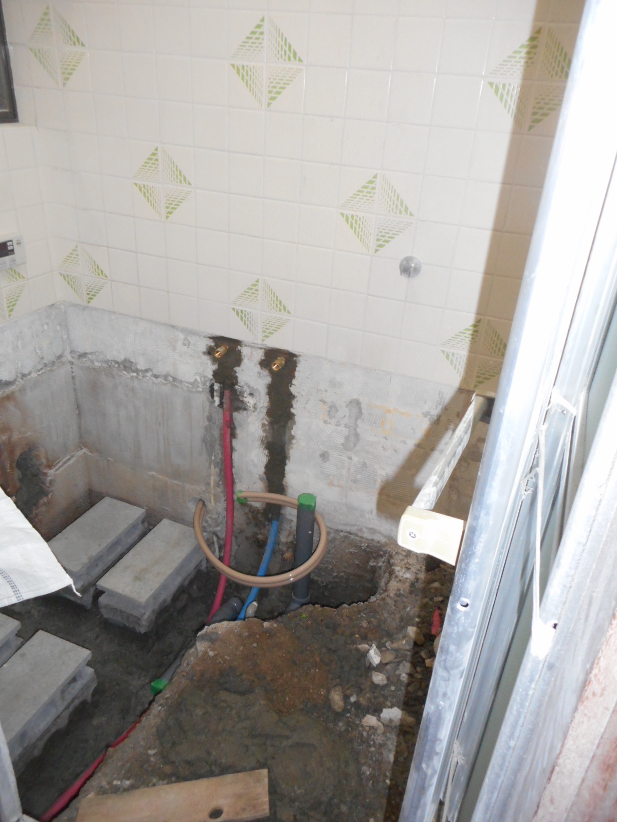 | 以前は倉庫の中にあった給湯器を、新規の給湯器は屋外に設置します!! | ここからキッチン、洗面所への給湯管の引込みと浴室への給湯管と追炊き配管が完了しました!! |