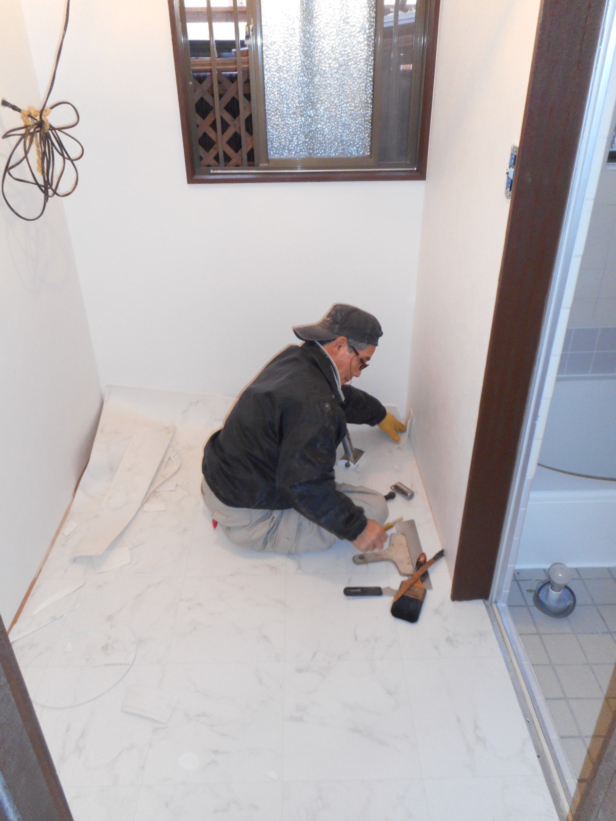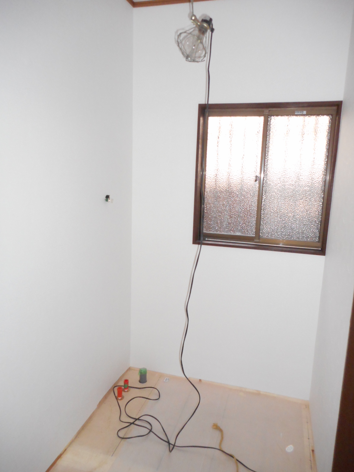 | 天井と壁廻りの、クロス張りが終わりました!! | 床にCFを、張って行きます!! |