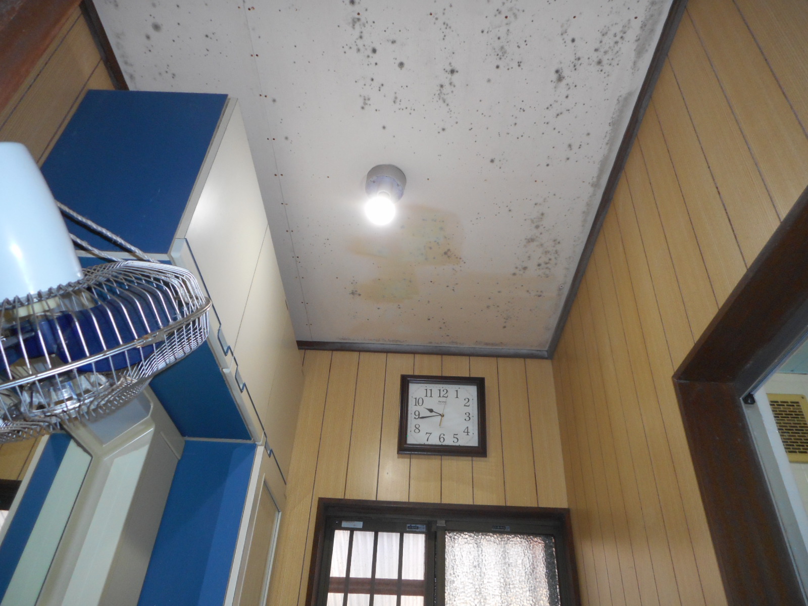 | 床がブカブクし、化粧台の状態も、良くありません!! | 天井も、だいぶ汚れています!! |