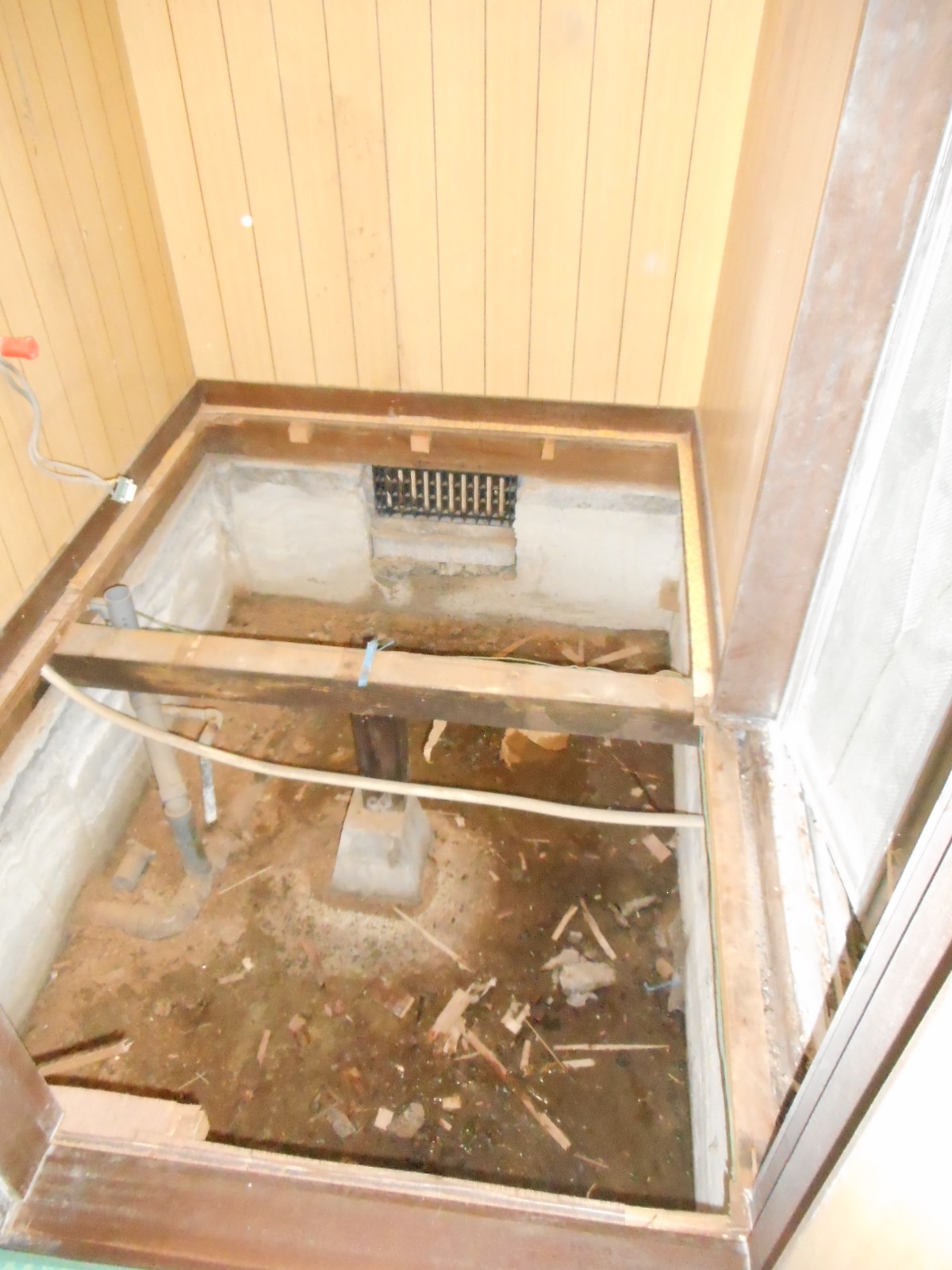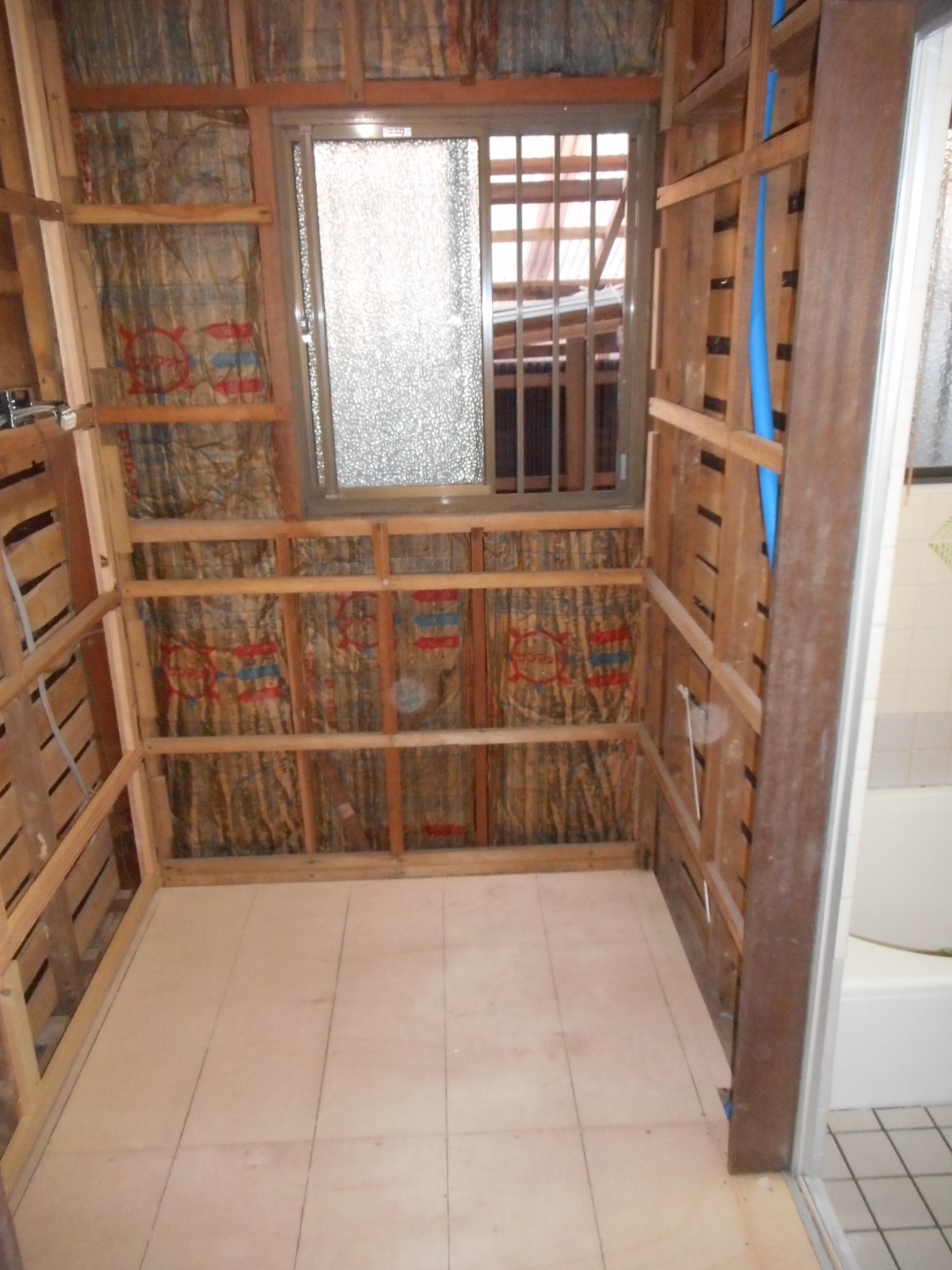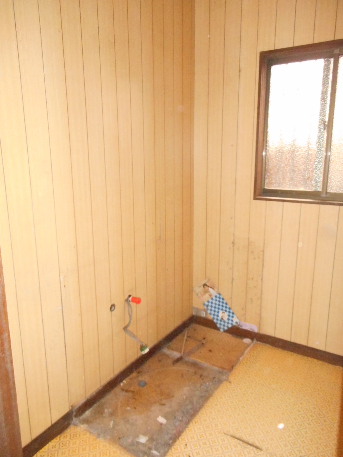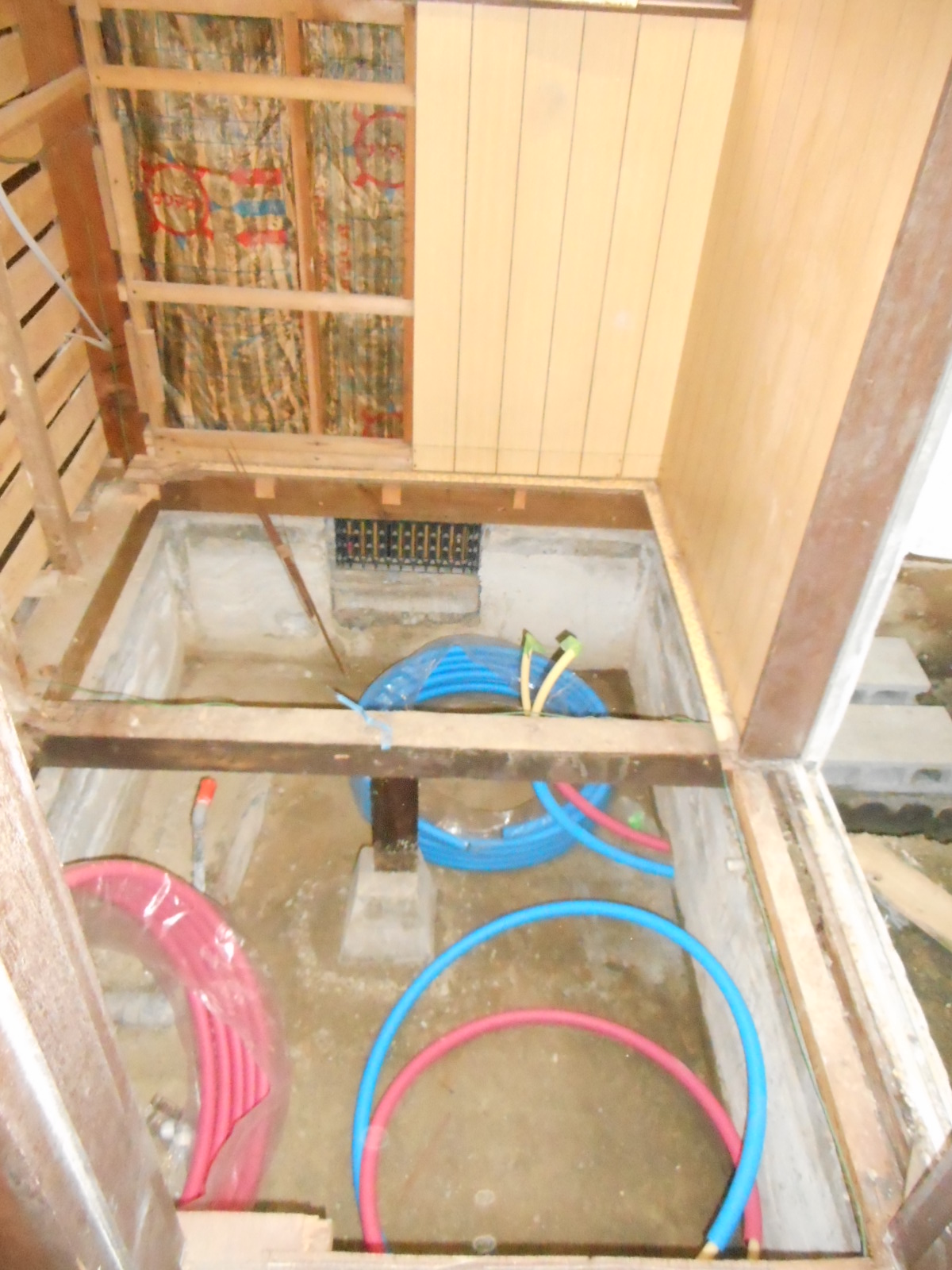 | 床も、解体しました!! | この時点で、新規の化粧台用の給水、給湯、排水管の整備をします!! |