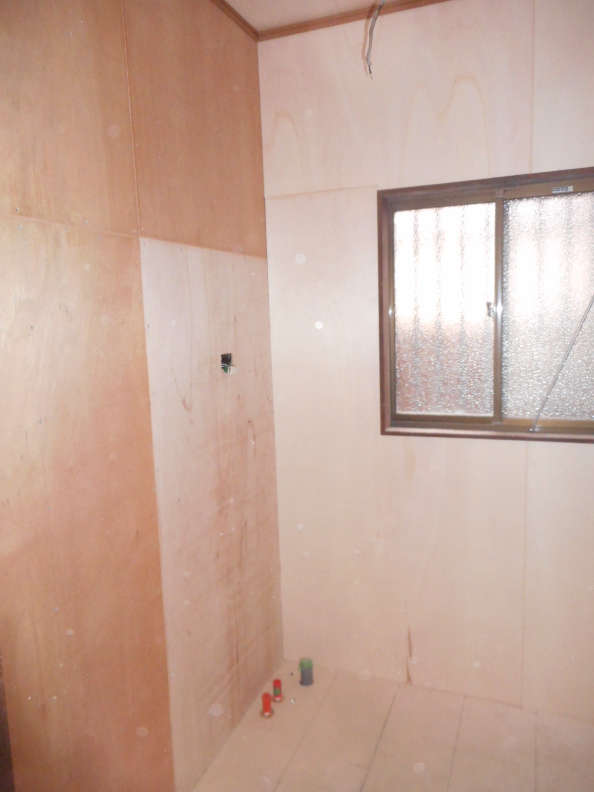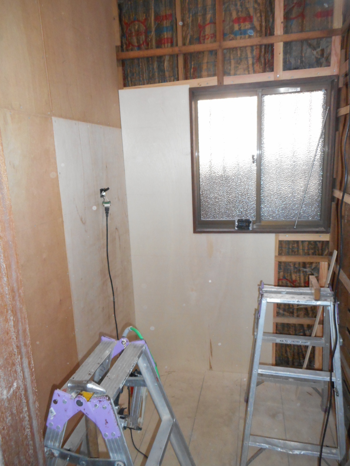 | 壁板も、すべて解体し床にはCF下地のコンパネを張りました!! | 壁廻りに、クロス下地のベニヤを張って行きます!! |