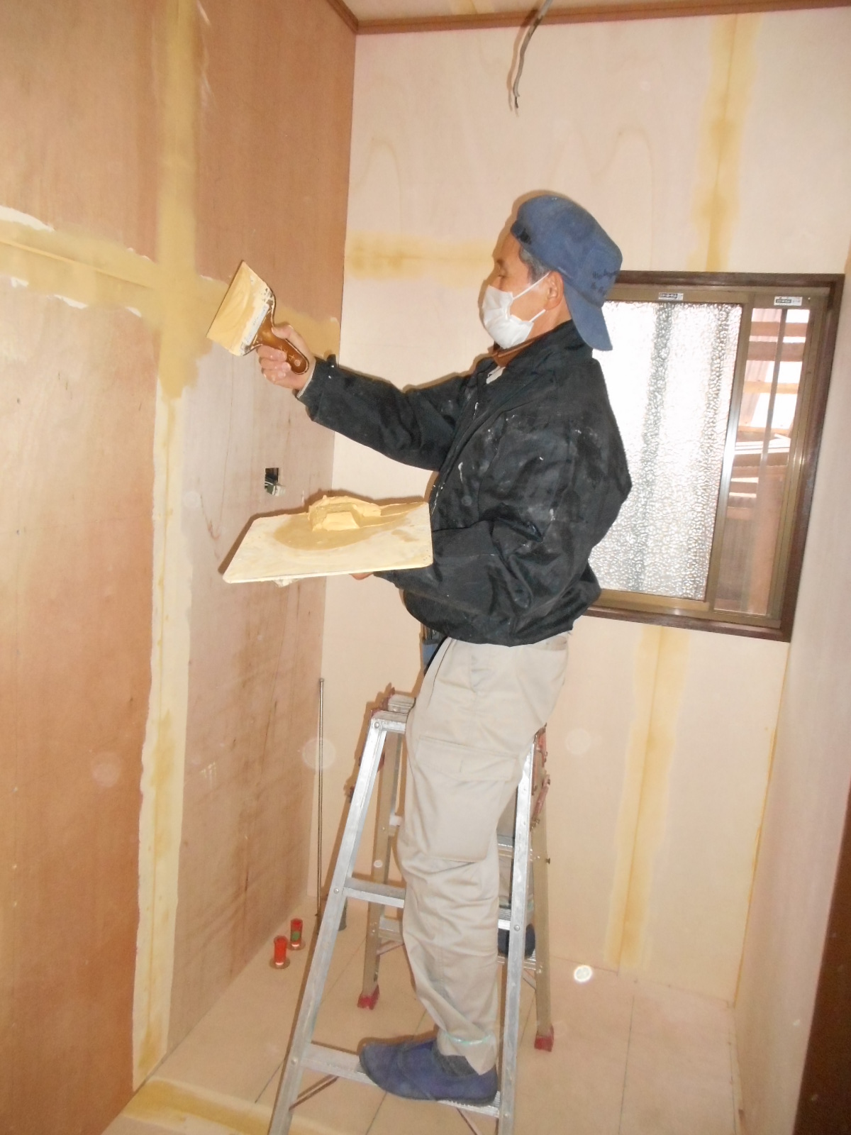 | 内装の下地づくりが、完了しました!! | クロスを張る前に、パテを打ちます!! |