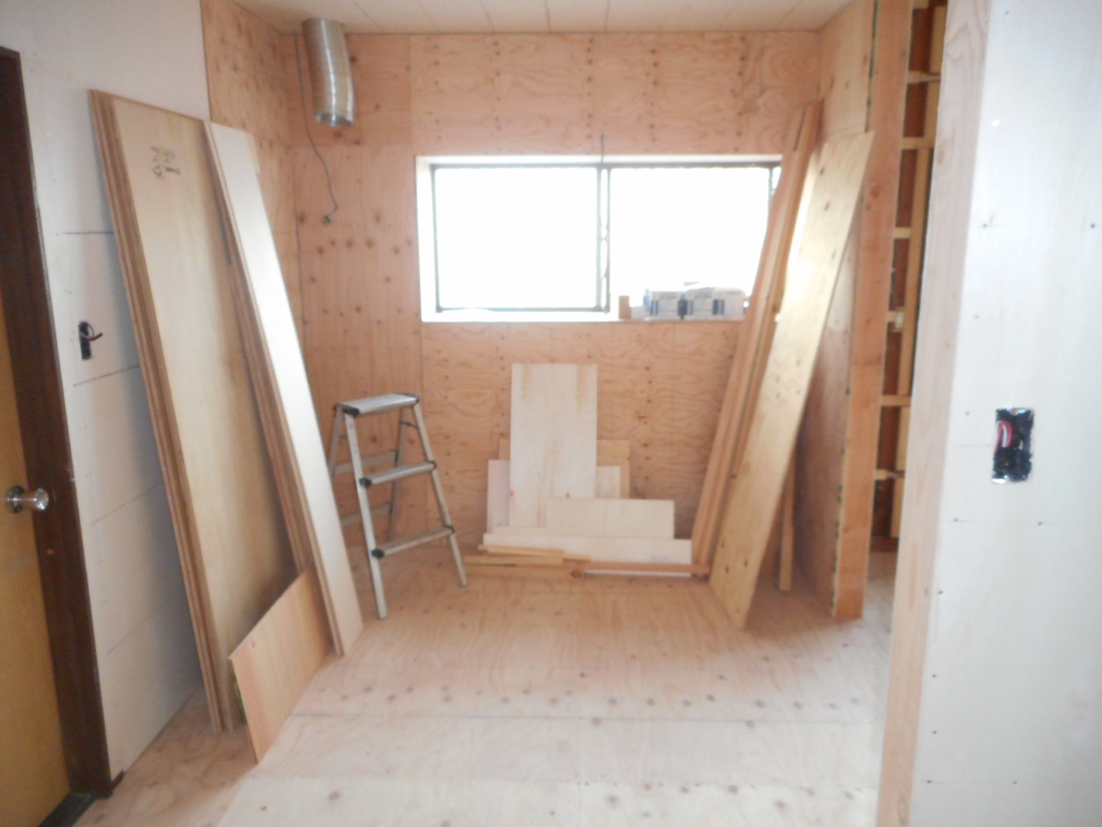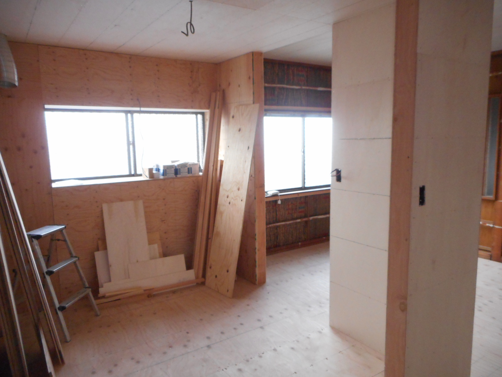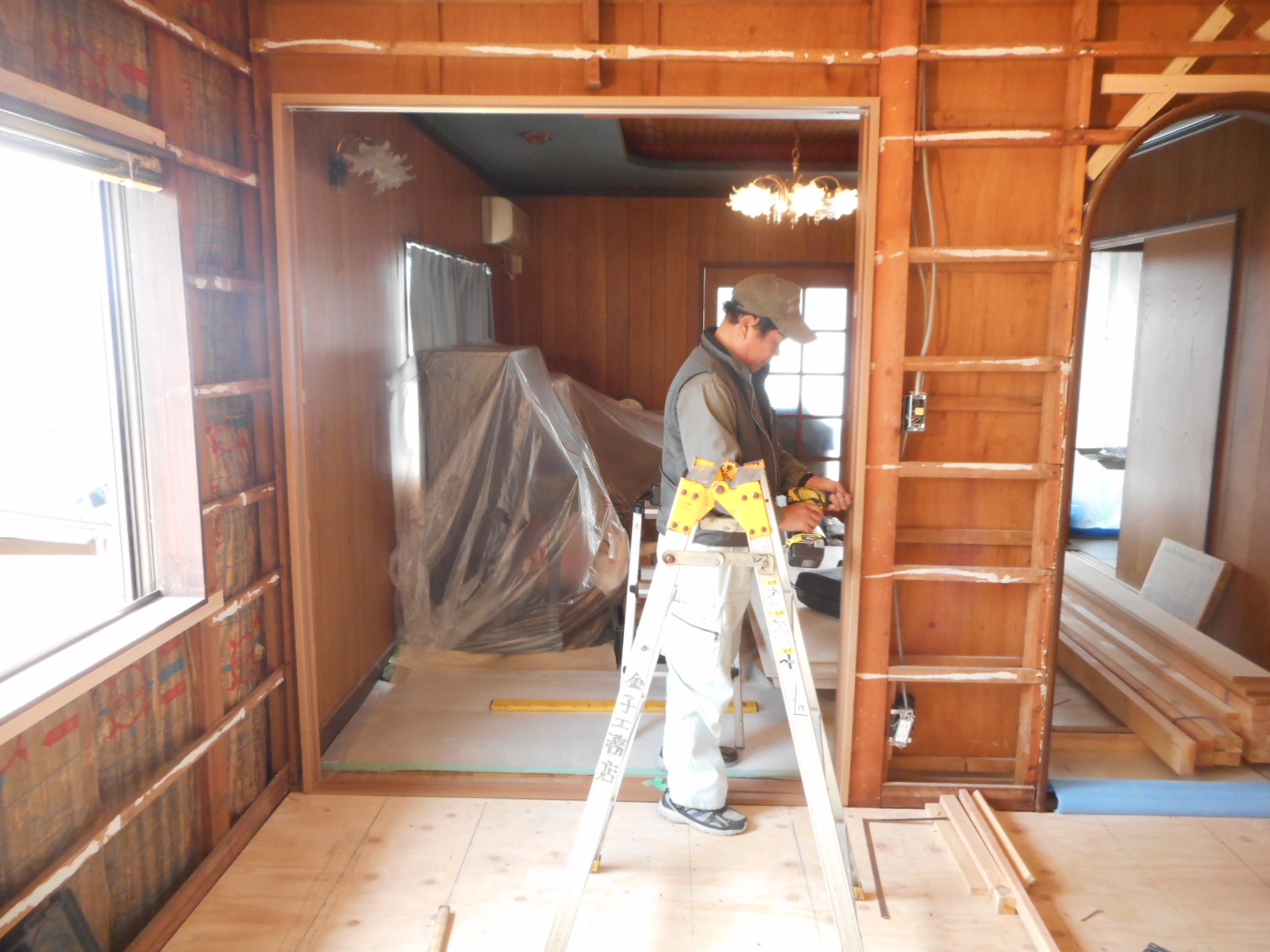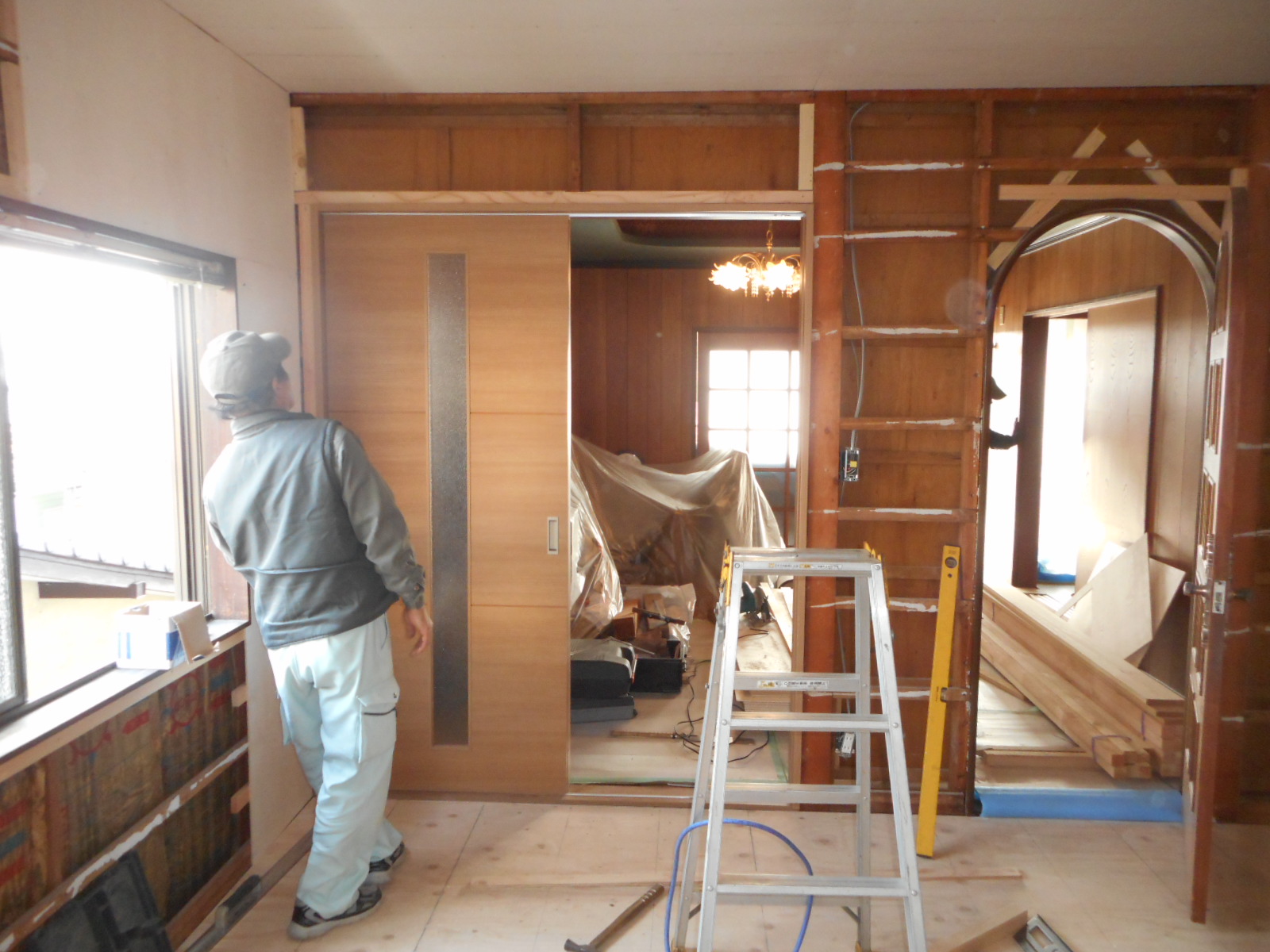 | リビング側の、壁を開口します!! | 開口が完了しました<この部分に新規に片引き戸を取付けます>!! |