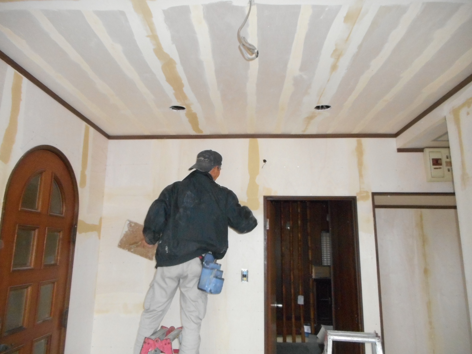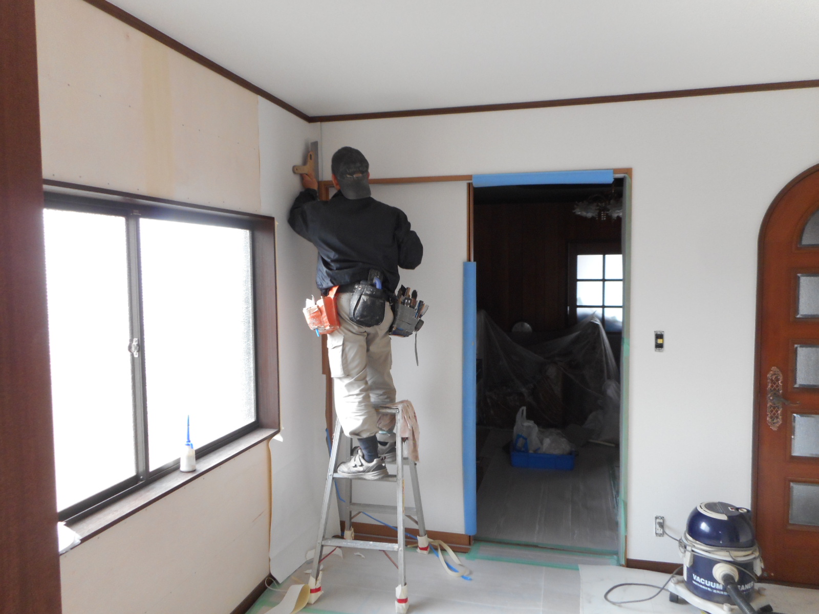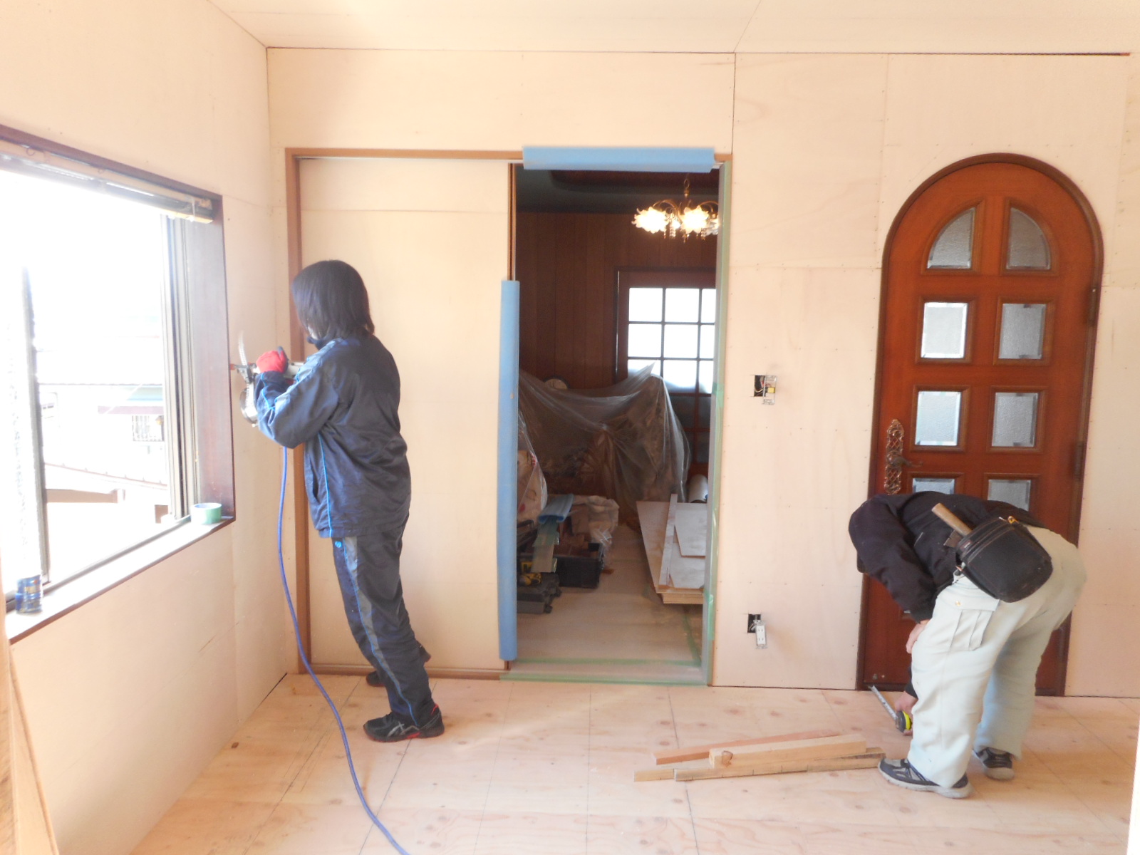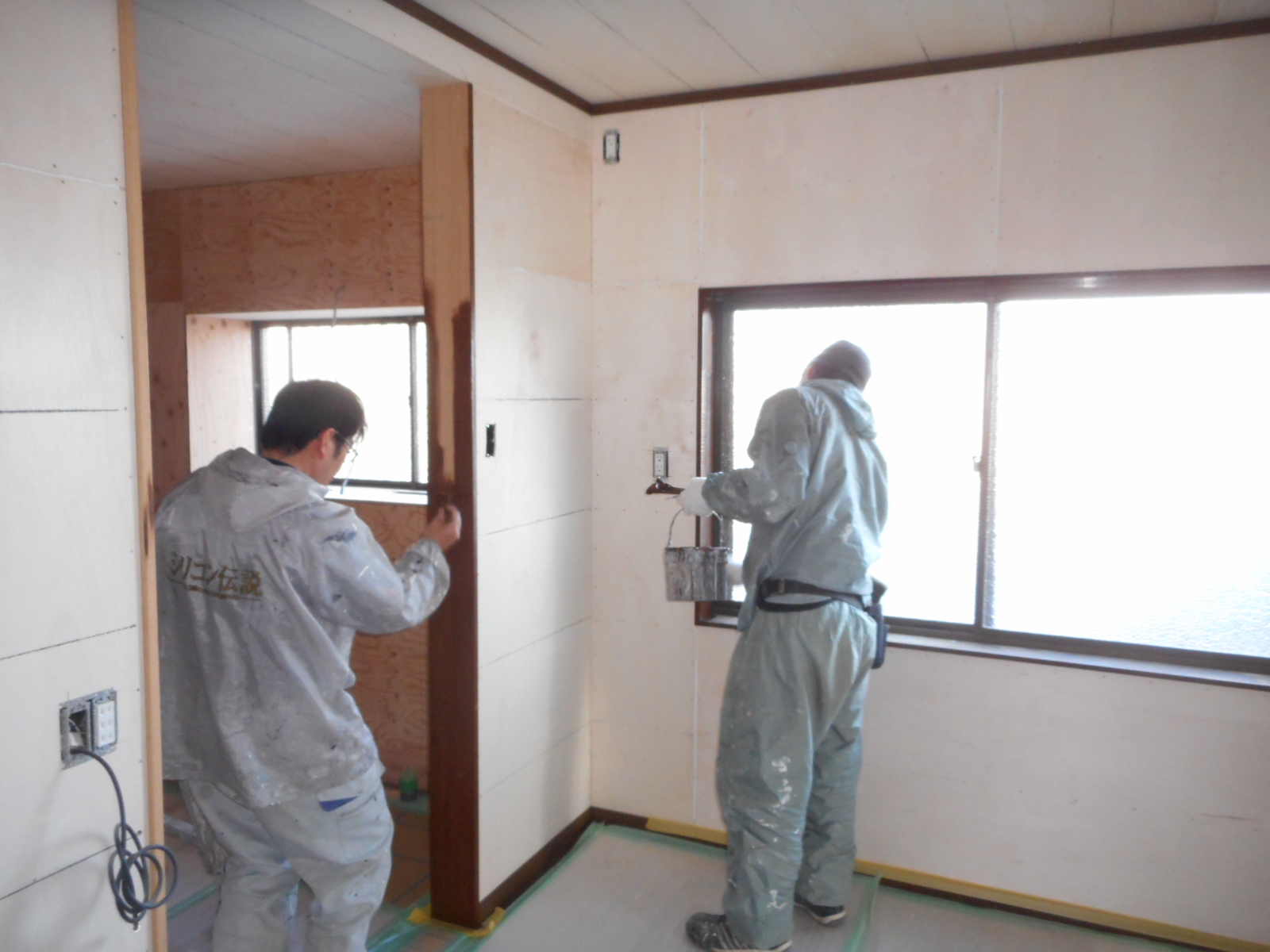 | サッシの枠や、新規に施工した化粧枠を塗装します!! | クロス屋さんが、クロスを張る前にパテを打ちます!! |