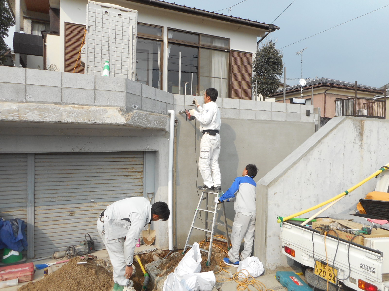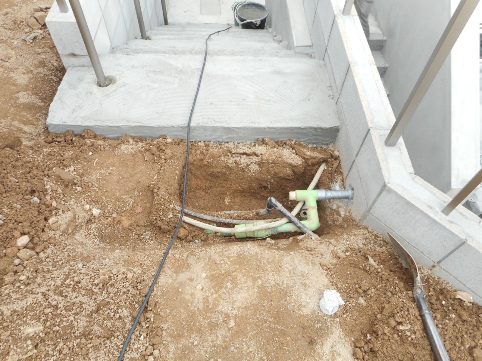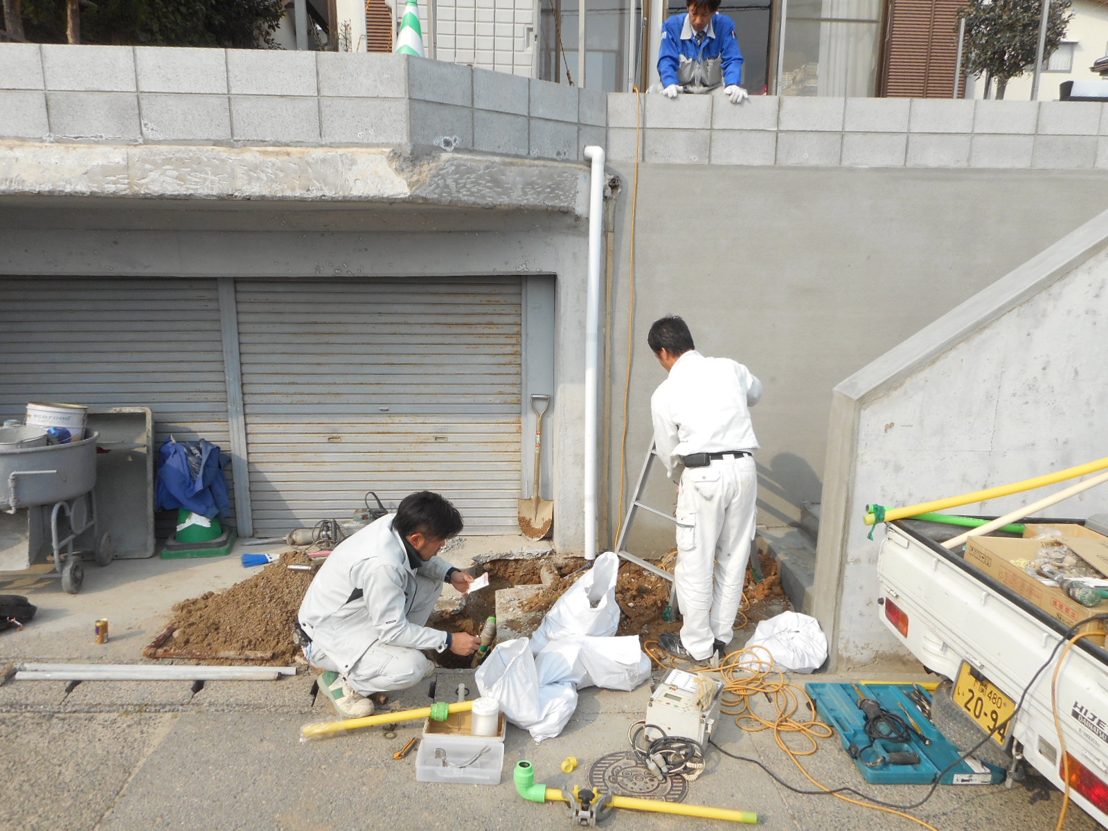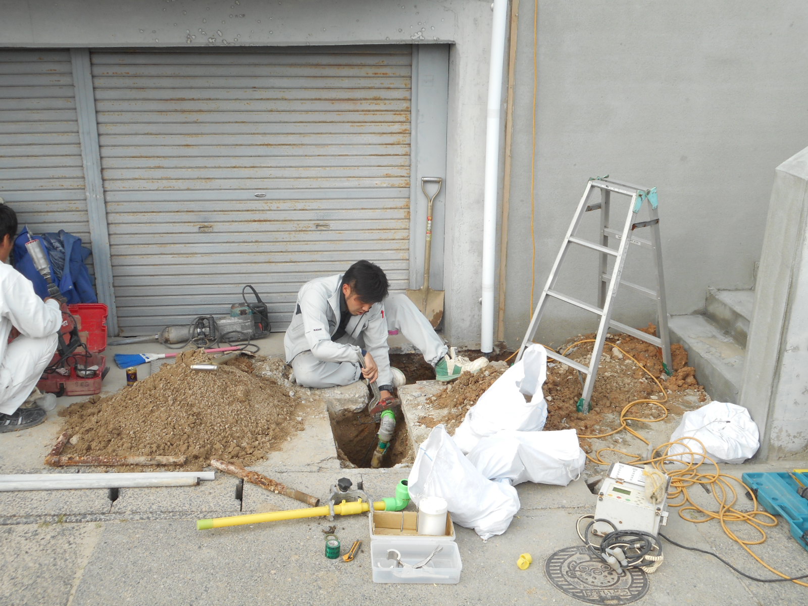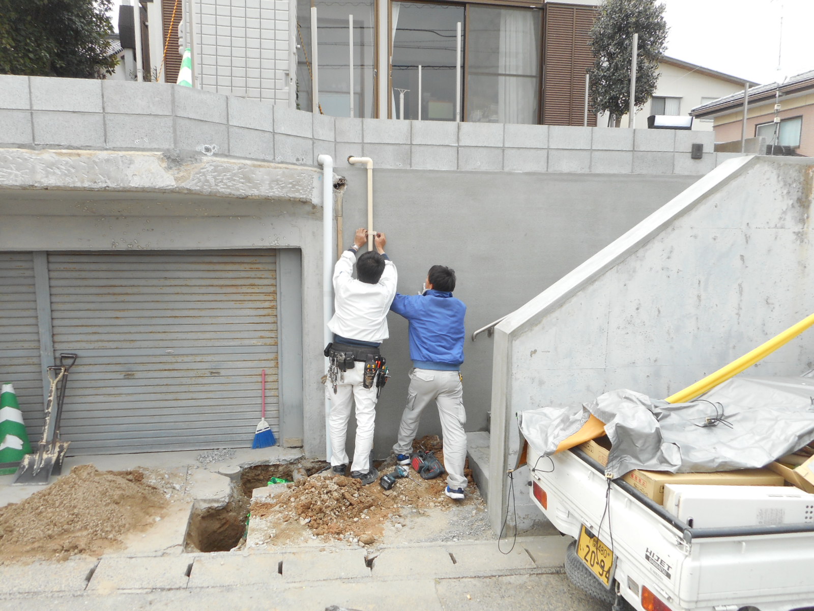 | 上の敷地に、ガス管を引き込むための穴を新規にコアドリルで明けます!! | 新規のガス管を、整備します!! |