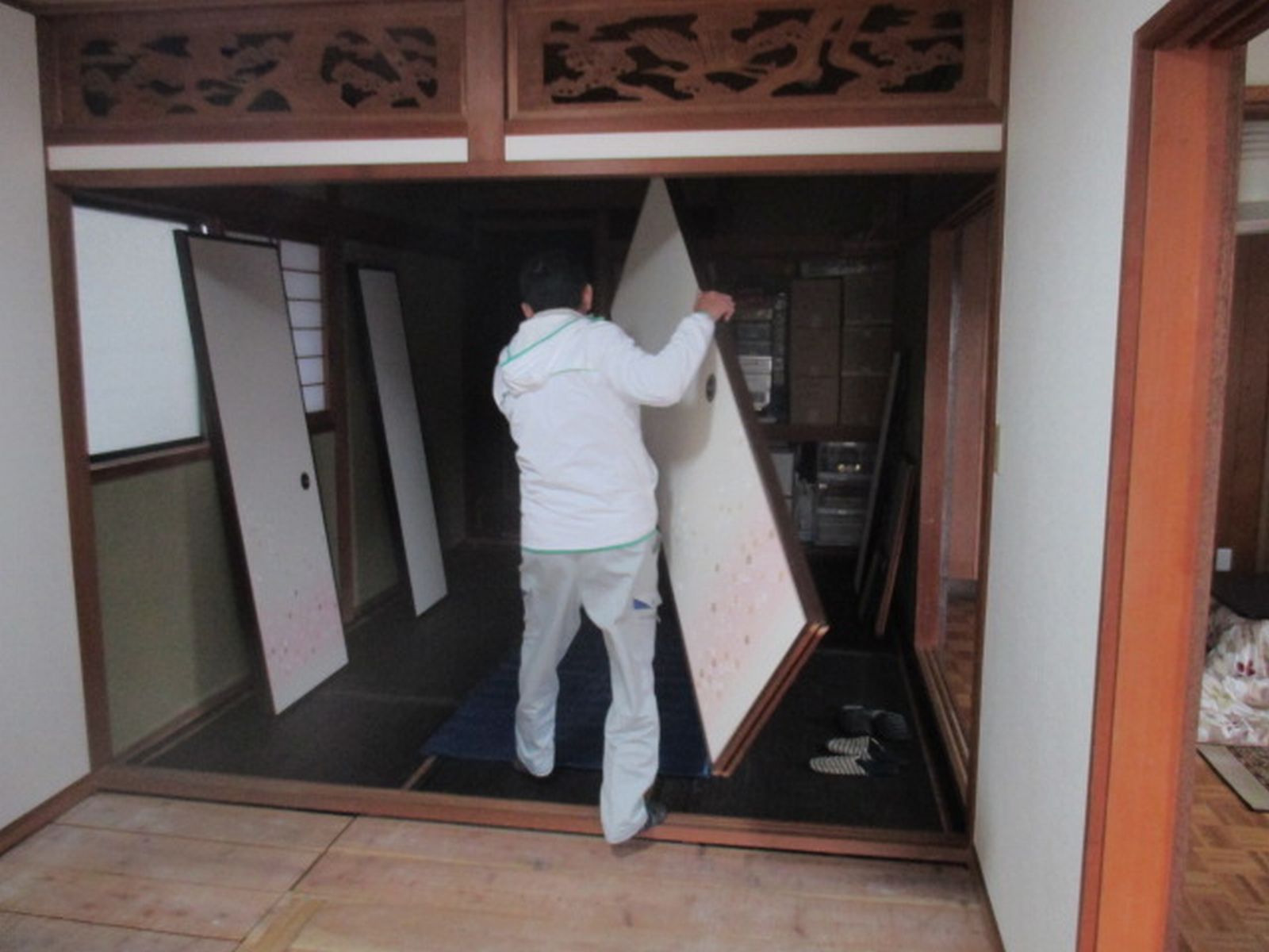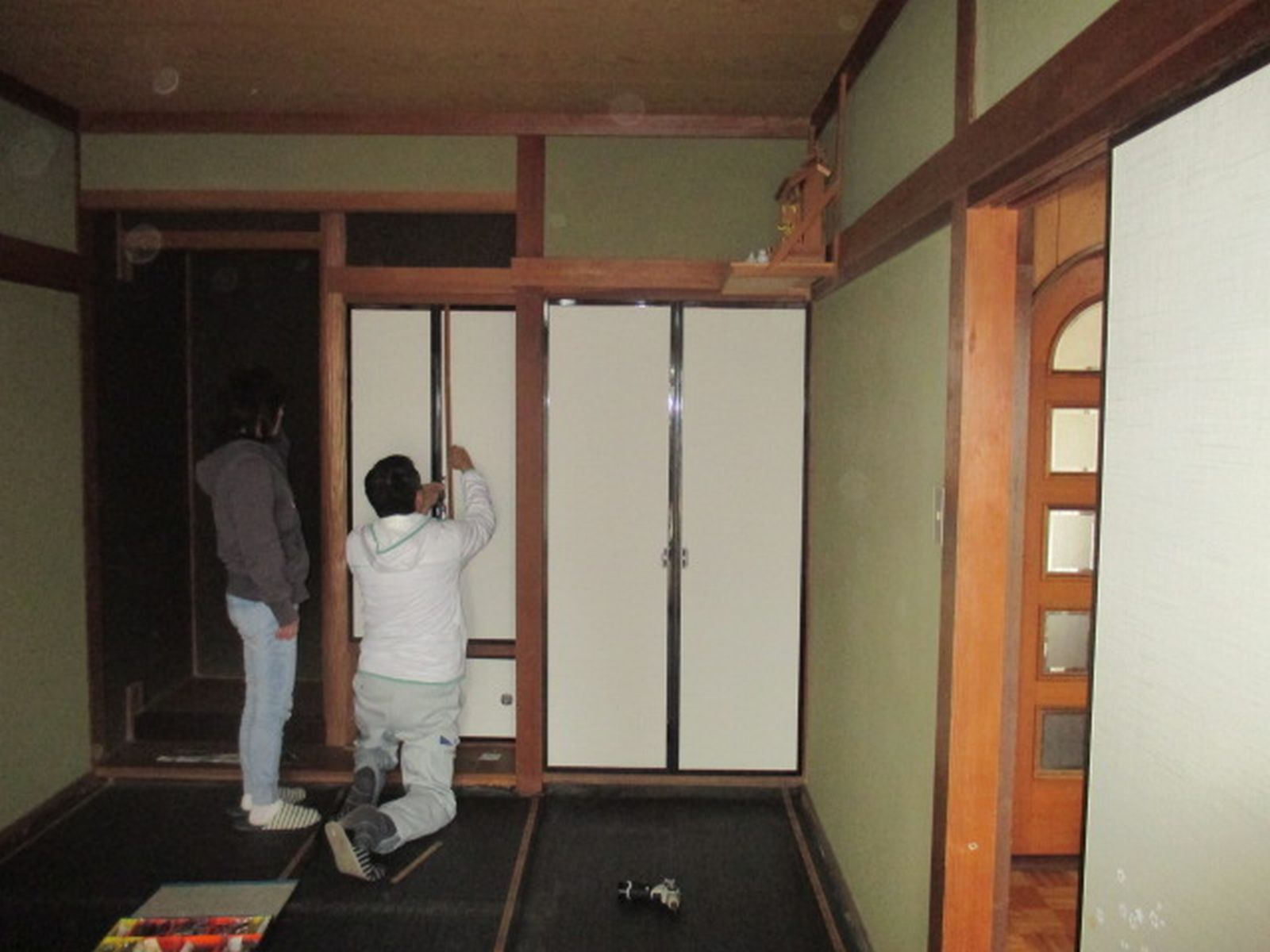 | 建付けを、調整します!! | 間仕切りの襖も収めて、調整します!! |