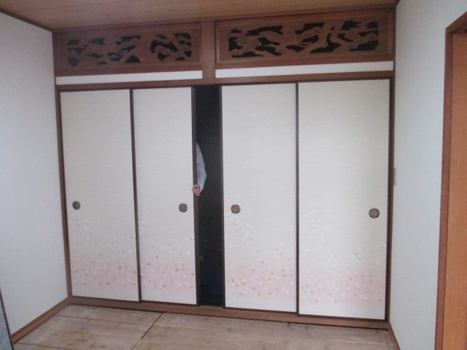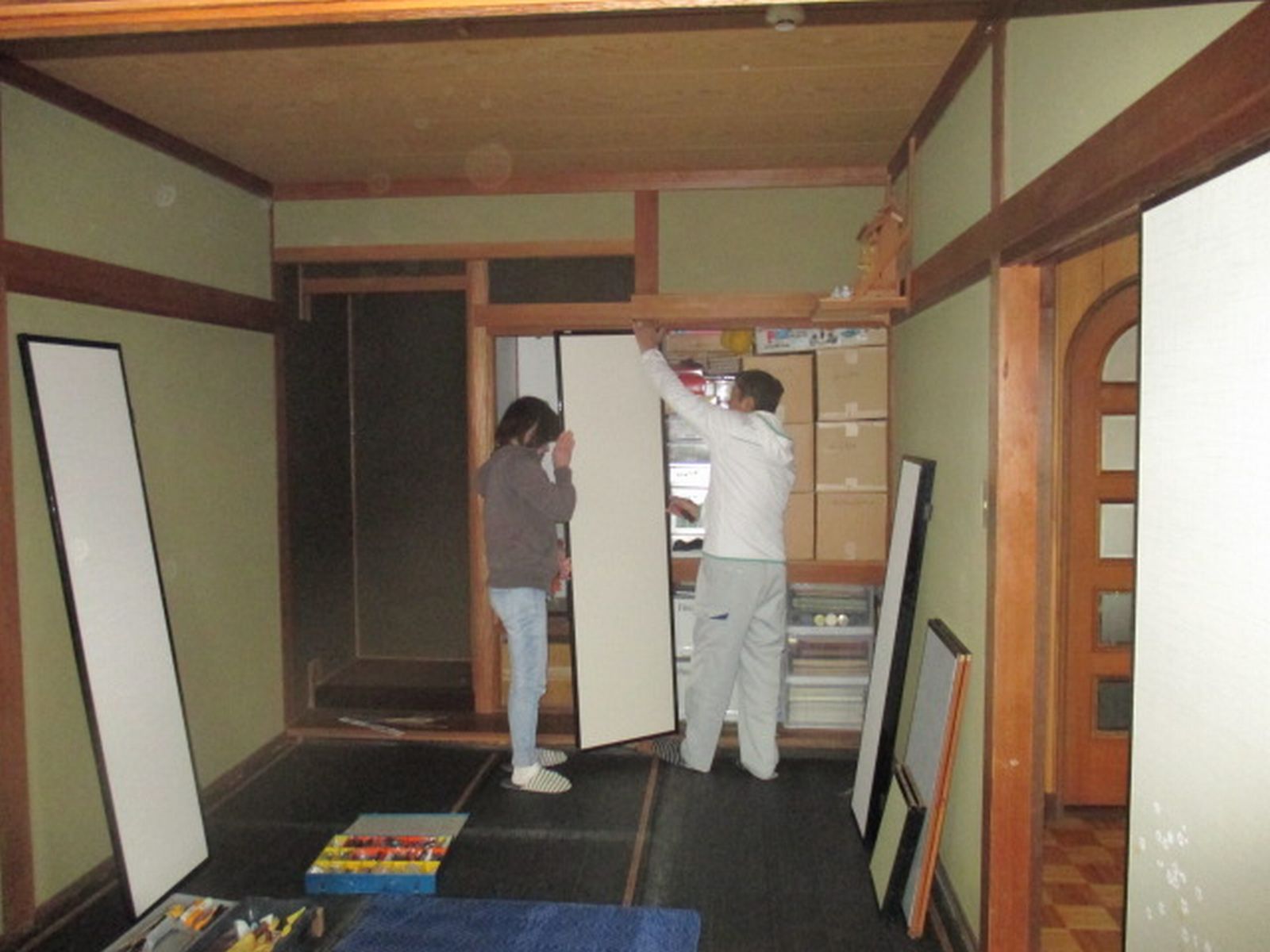 | 作業場で張替えて来た襖を、運び入れます!! | 収めて行きます!! |