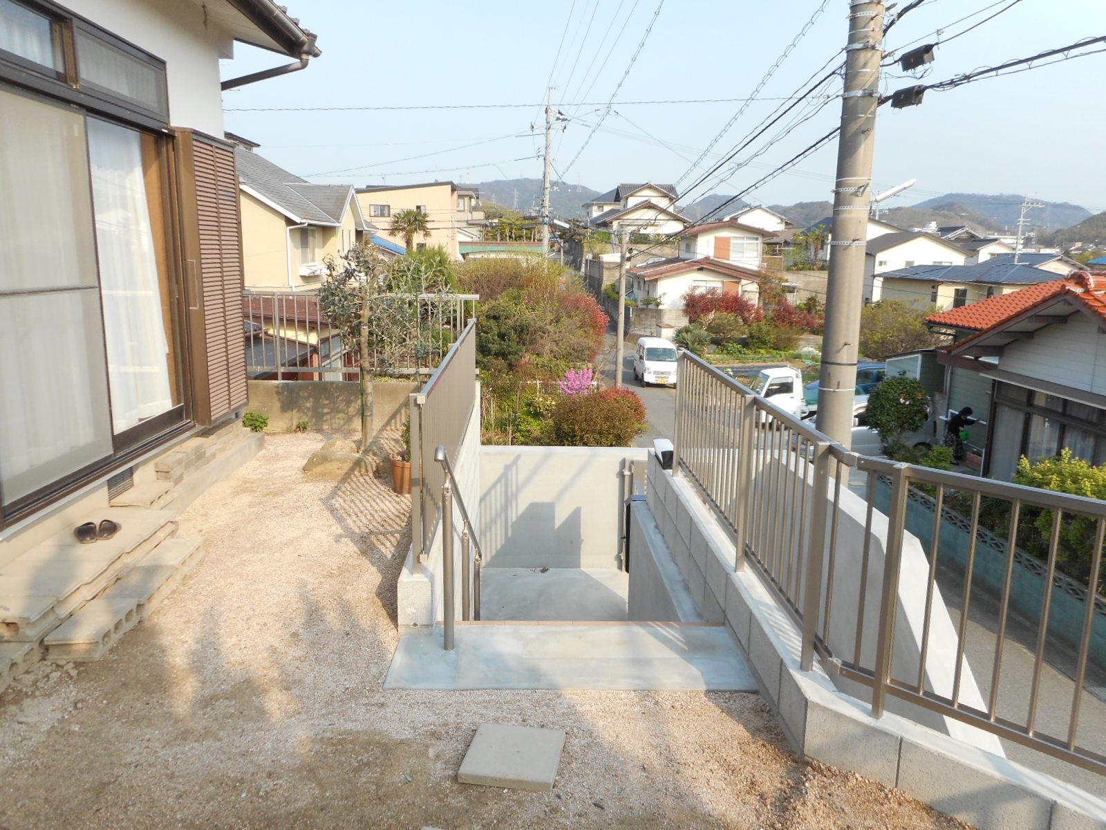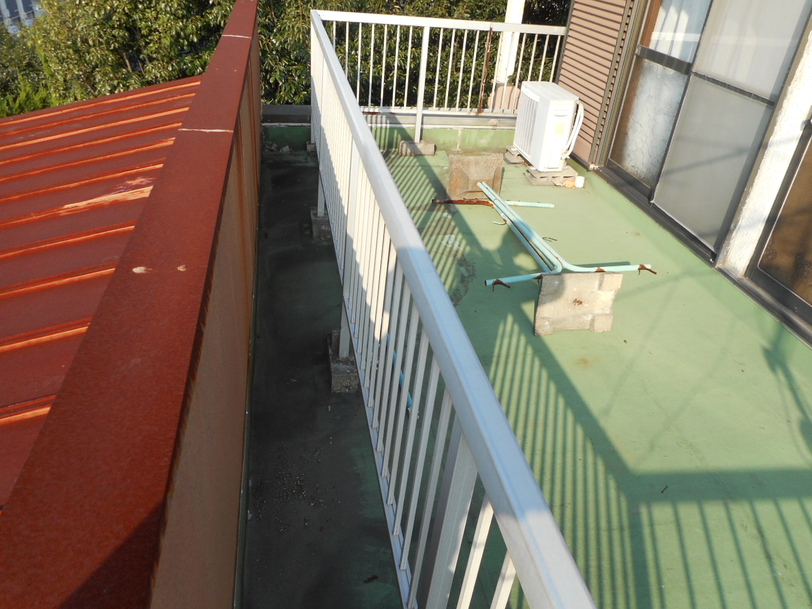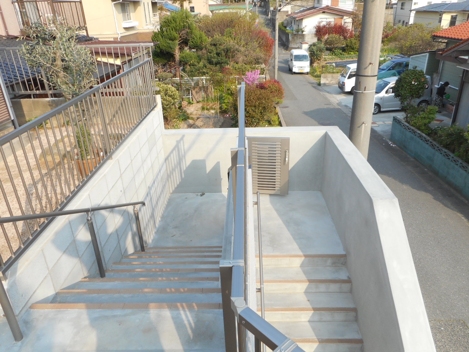 床の防水工事を行い、前の立ち上がり壁を改修し、既設手摺りを撤去し両側に新規の手摺りを取付けました。