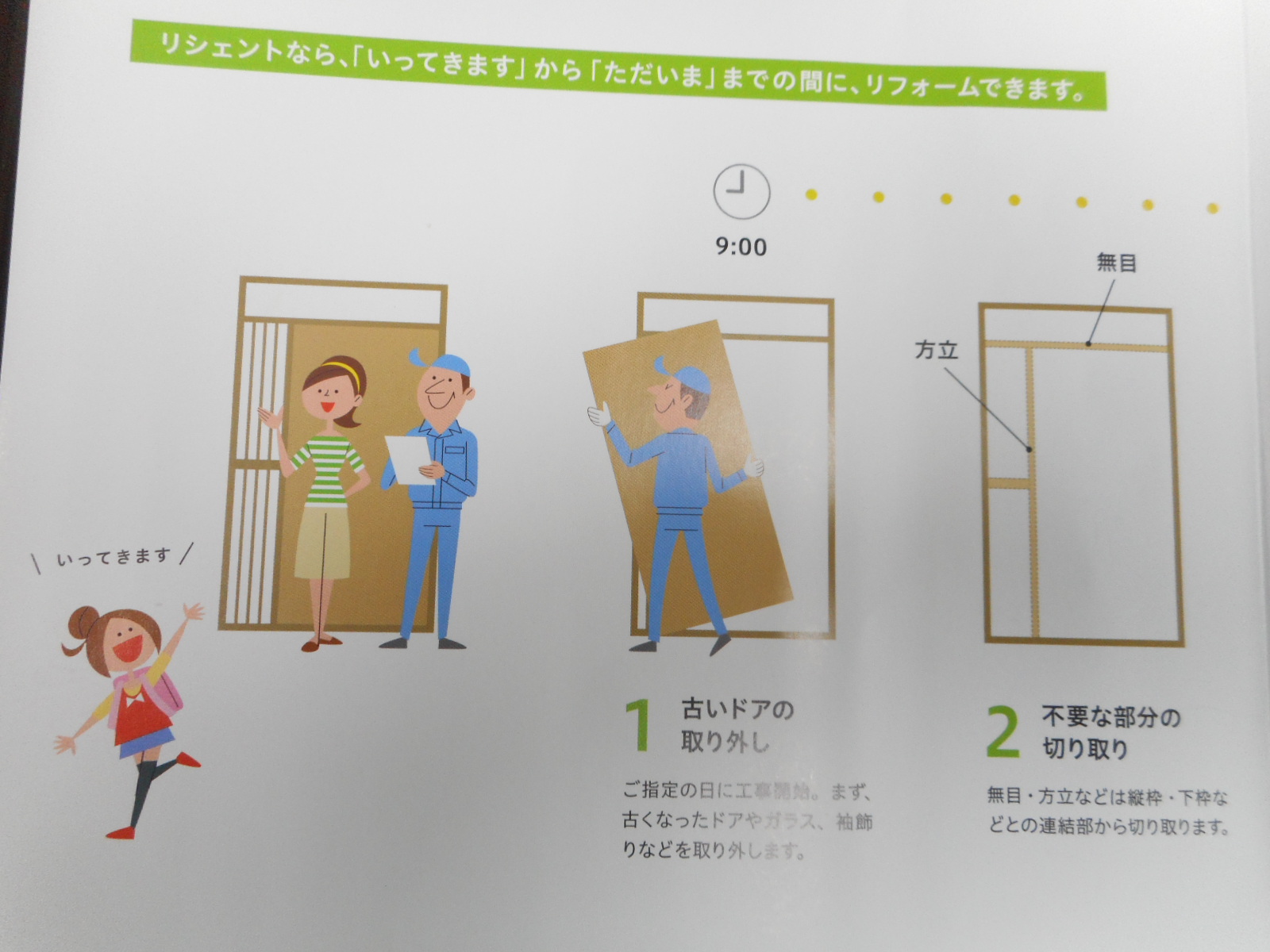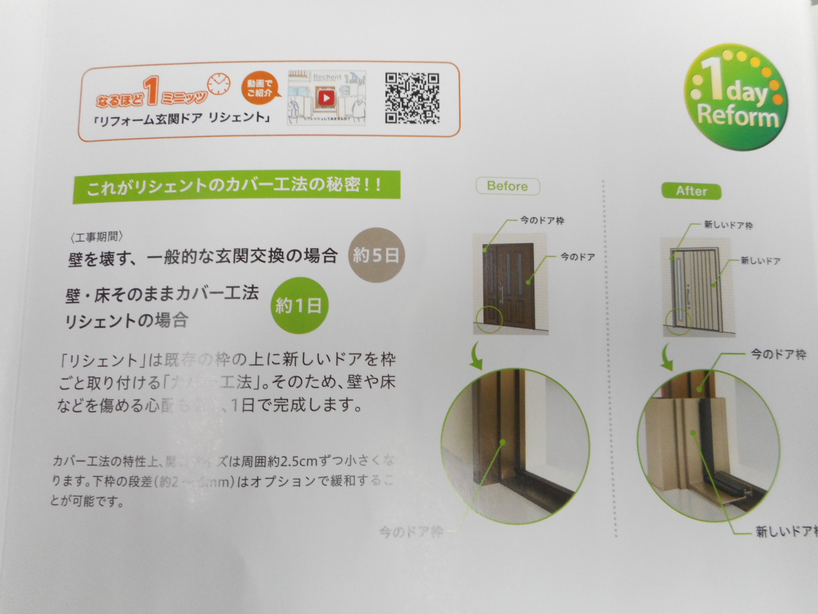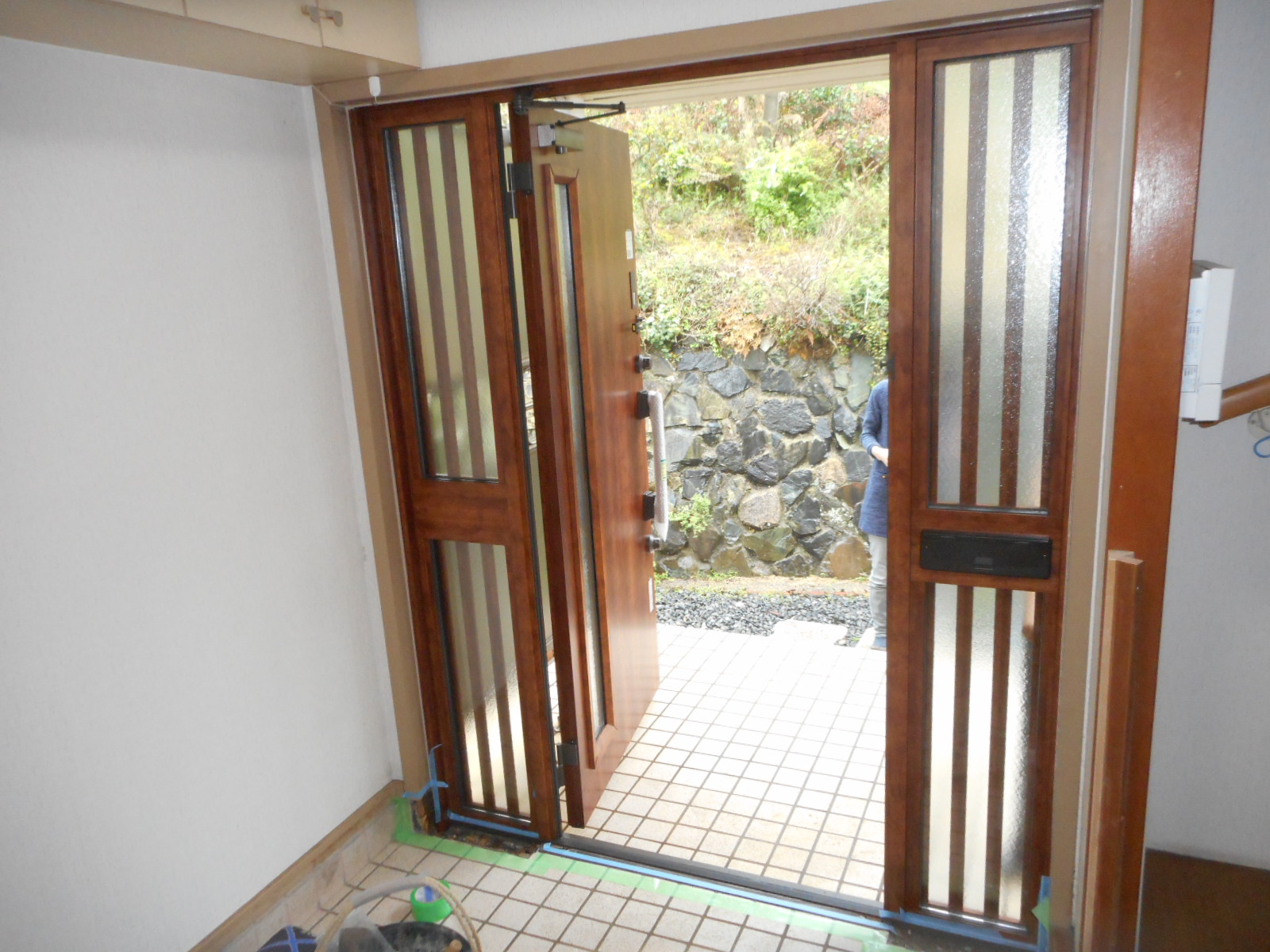 今回取付けた新規のドアは、廻りの壁や土間を解体することなく1日で交換が可能な「カバー工法」で