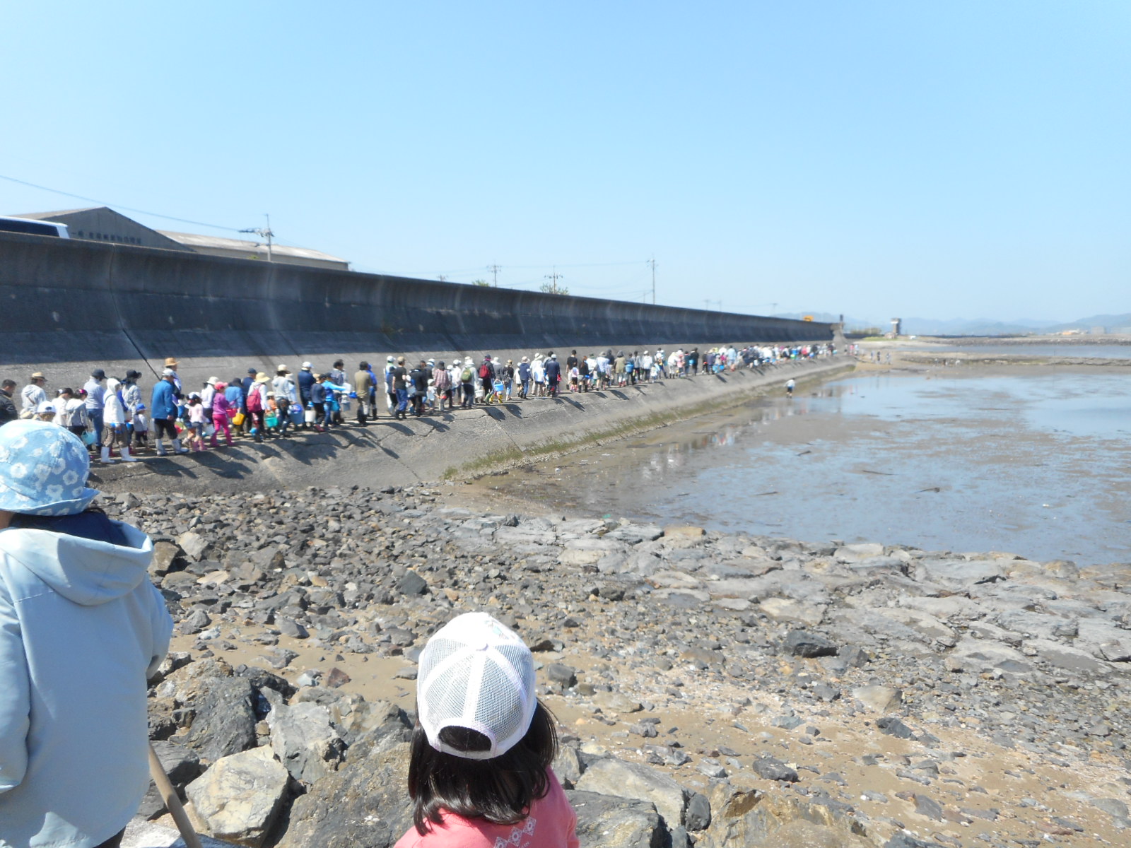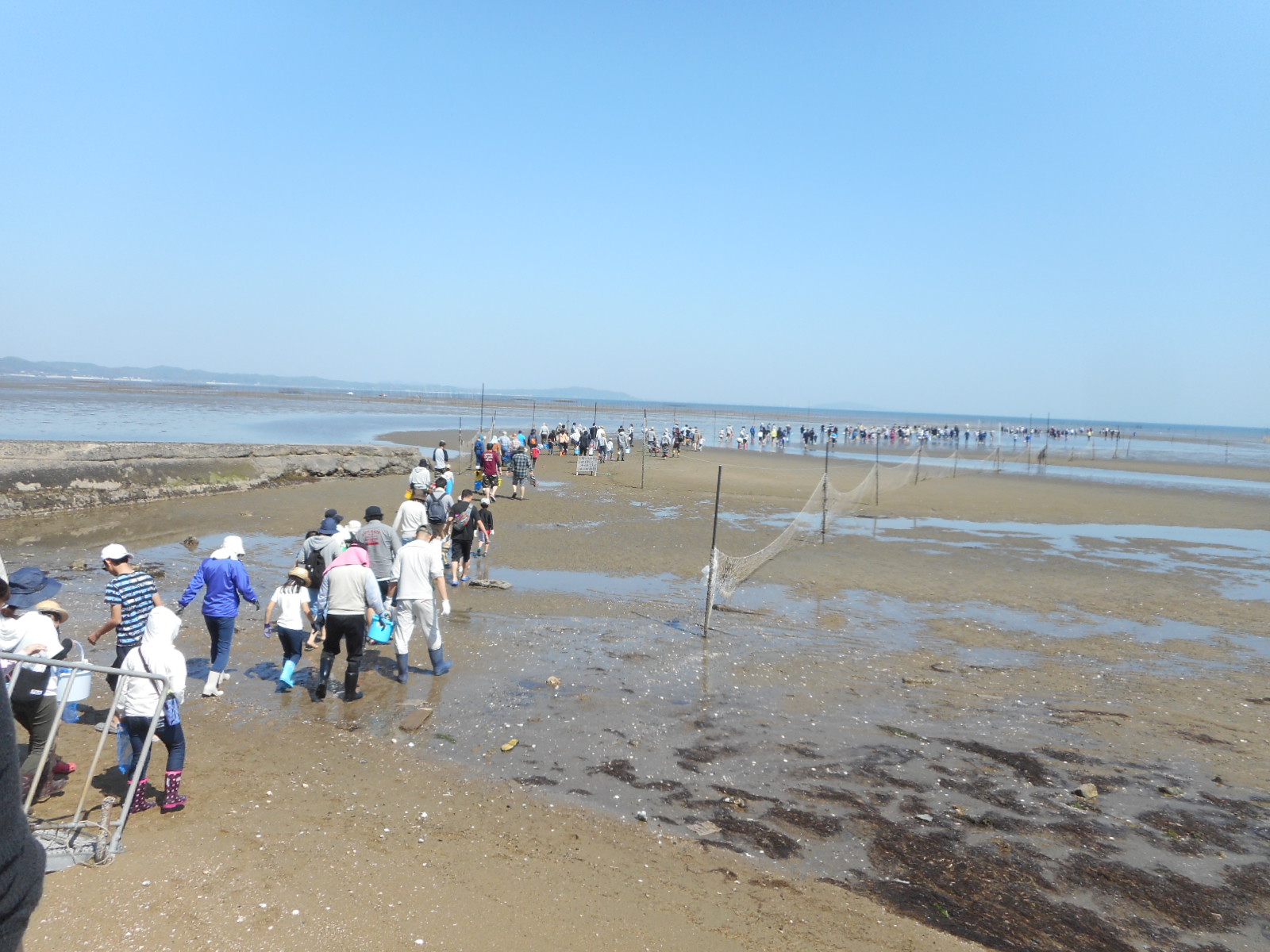 | 開門と同時にみなさん、潮干狩りが出来る場所まで歩いて行きます!! | 潮干狩りが出来る場所まで、もう少しです!! |