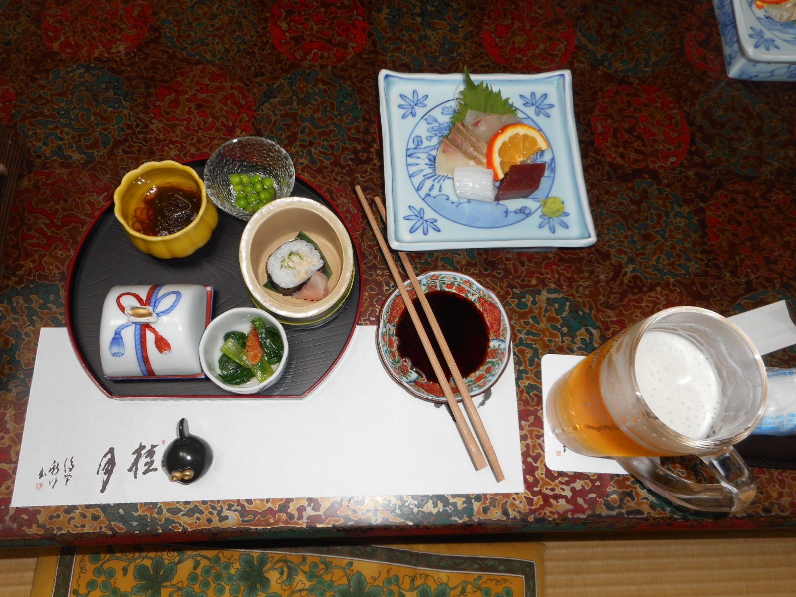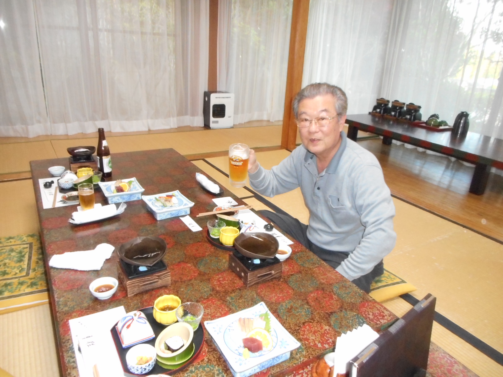 | 夕方の6時に、桂月さんに着きました!! | さっそくビールで祝杯です!! (奥さんと孫娘は顔出しNGだそうです。美人?の奥さんと可愛い?孫娘を紹介出来なくて残念です) |