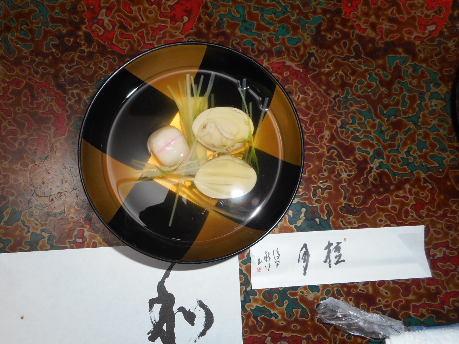 | 最初に小鉢、前菜、お造りが、用意されていました!! | 次に、蛤のお吸い物が出て来ました!! |