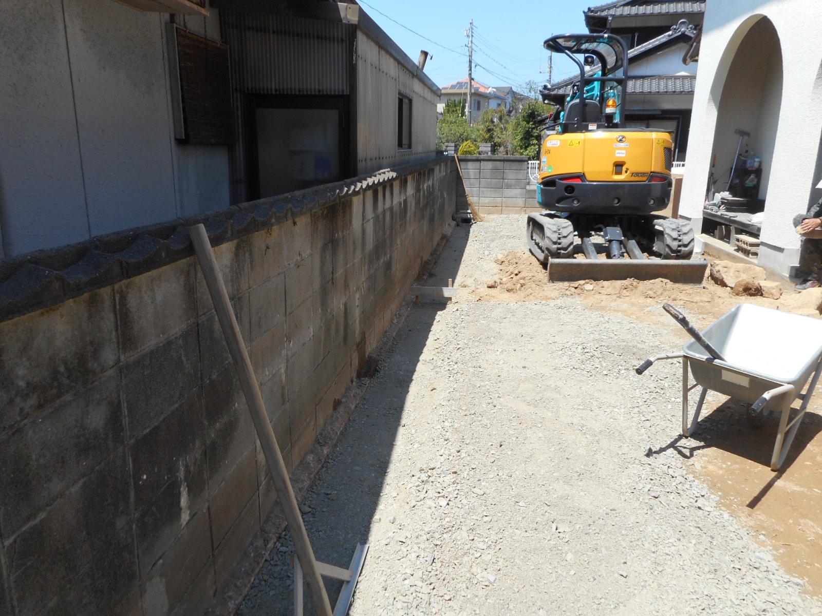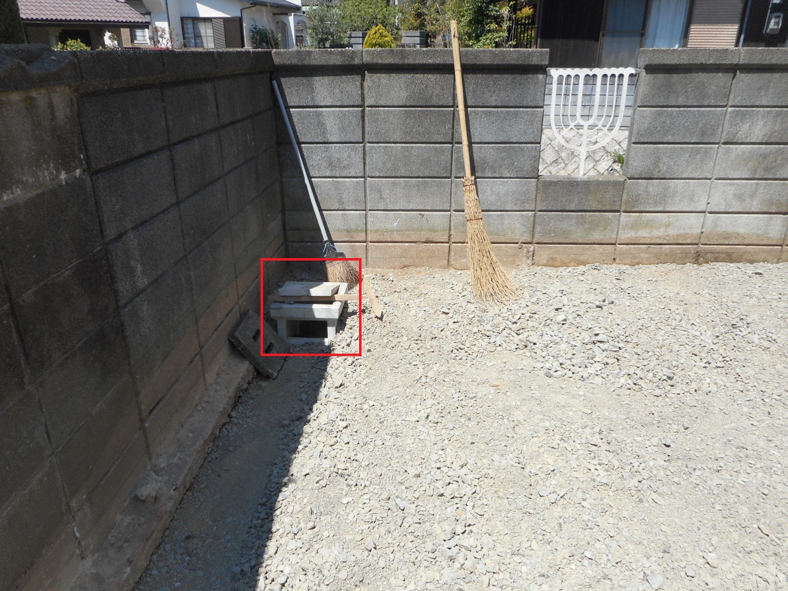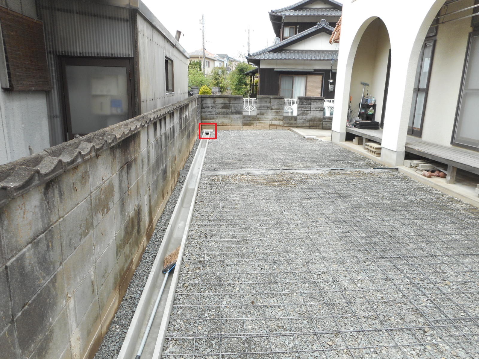 | 整地後、砕石を敷き天圧し均します!! | 道路側に、溜め枡(□)を設置しました!!<この溜め枡にU字溝を繋ぎ入れ、ブロック塀を貫通しエンビ管入れ道路の側溝に雨水を落とし入れる様にします> |