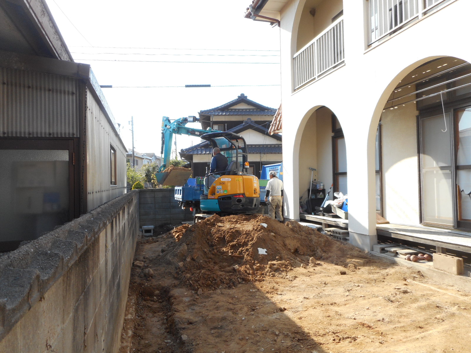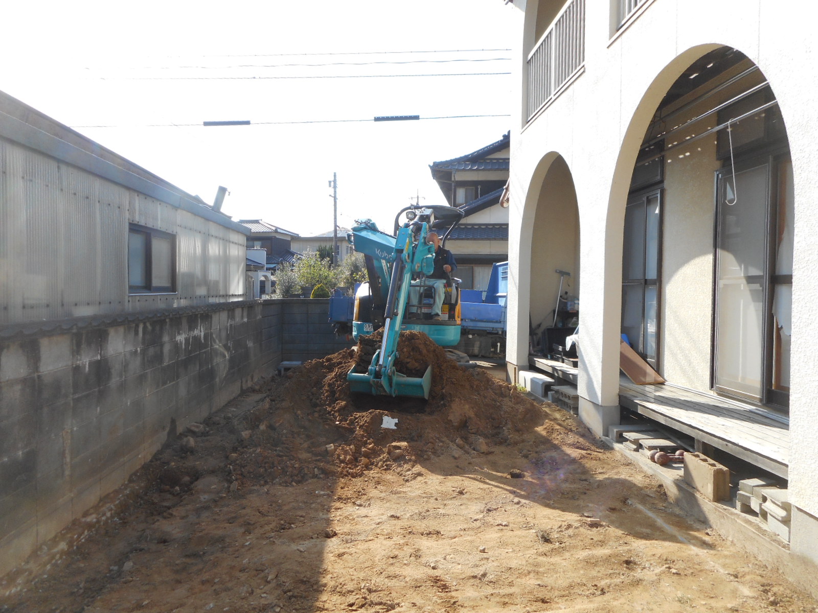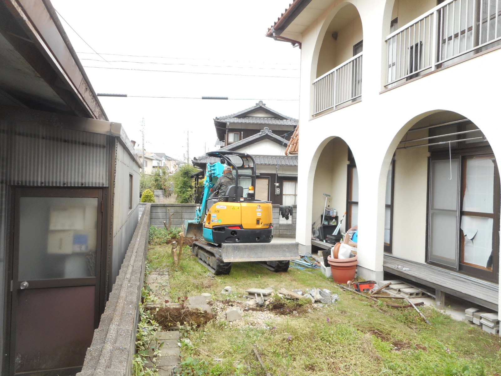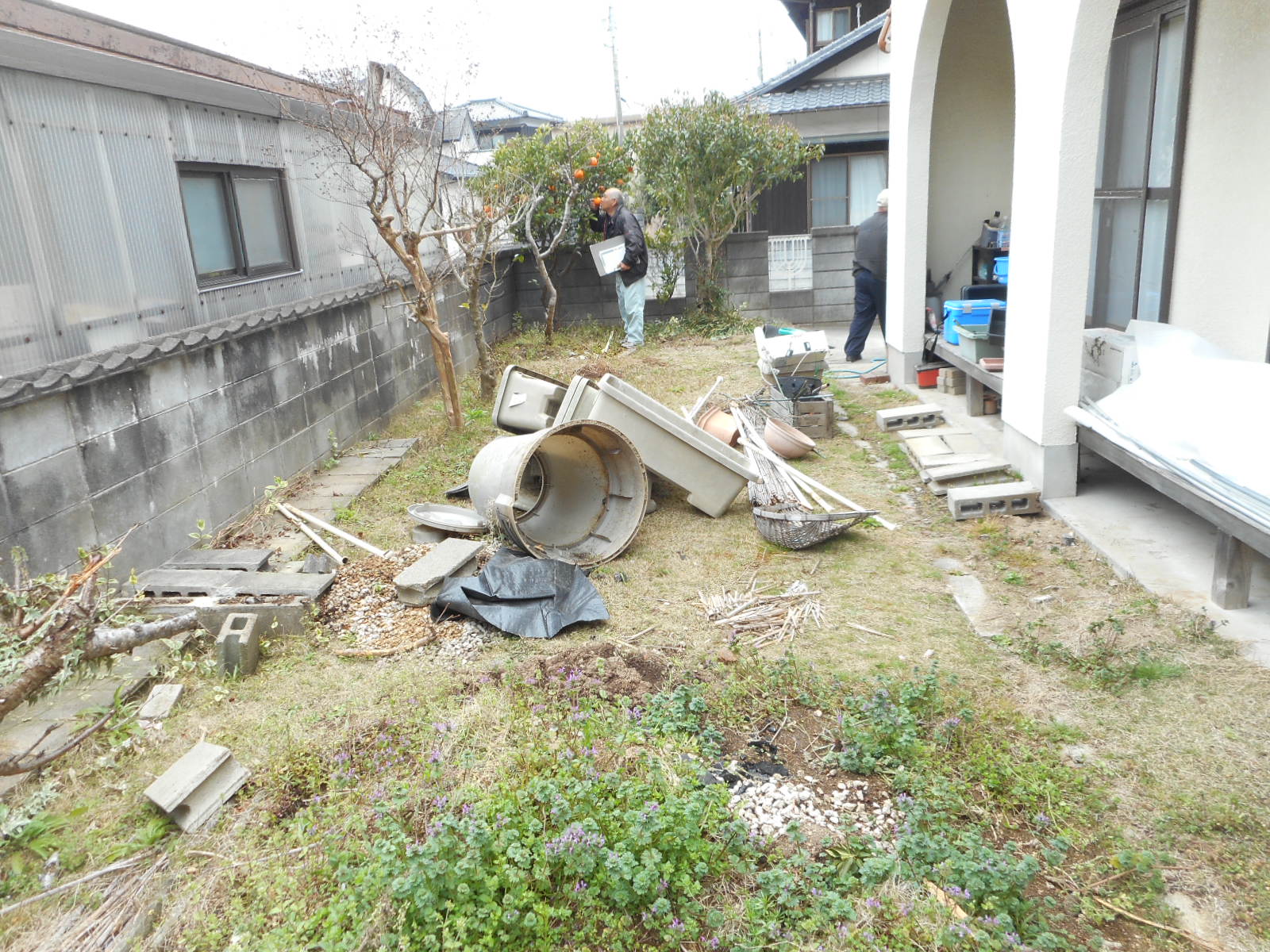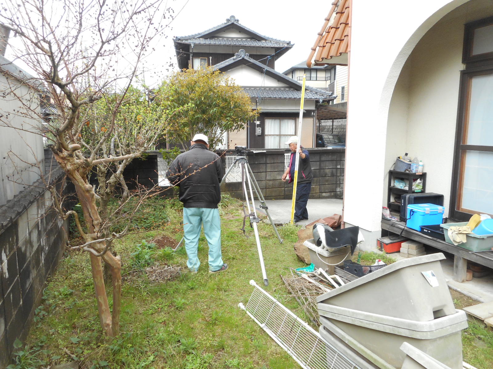 | 土砂を、どこまでスキ取るか等の測量をします!! | 庭木や不用品の、撤去をします!! |
