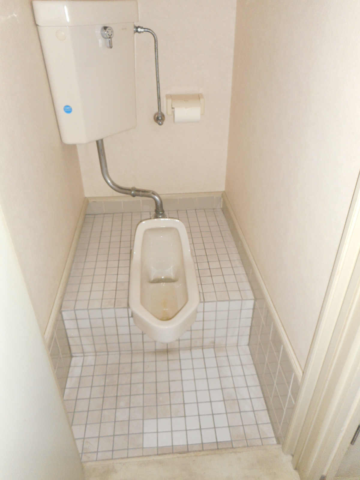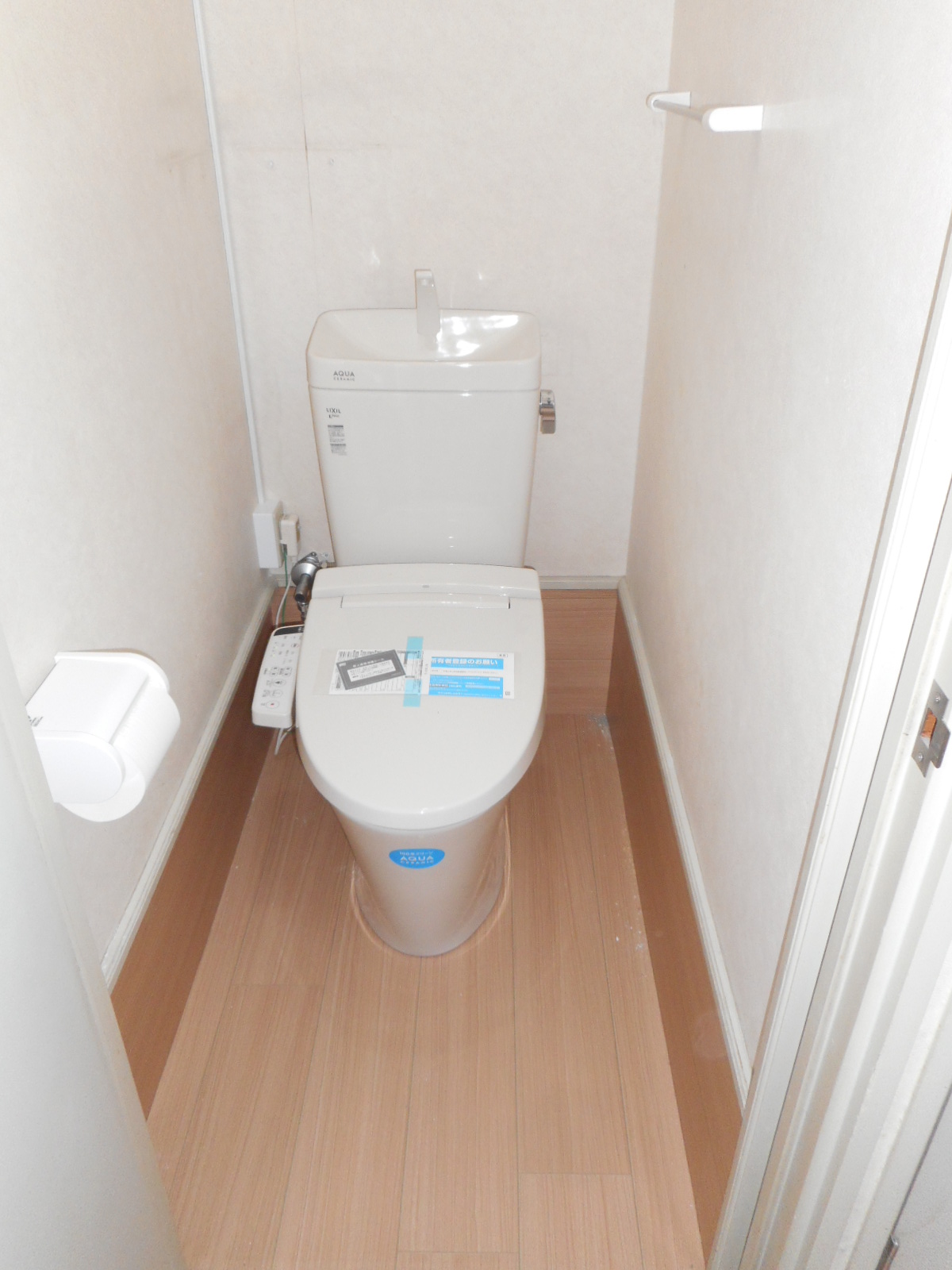 | 床と壁の立ち上がり部分に、CFを張りました!! | 新規の便器と備品を、取付けました!! |