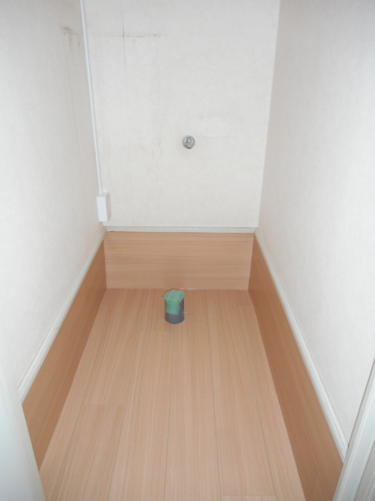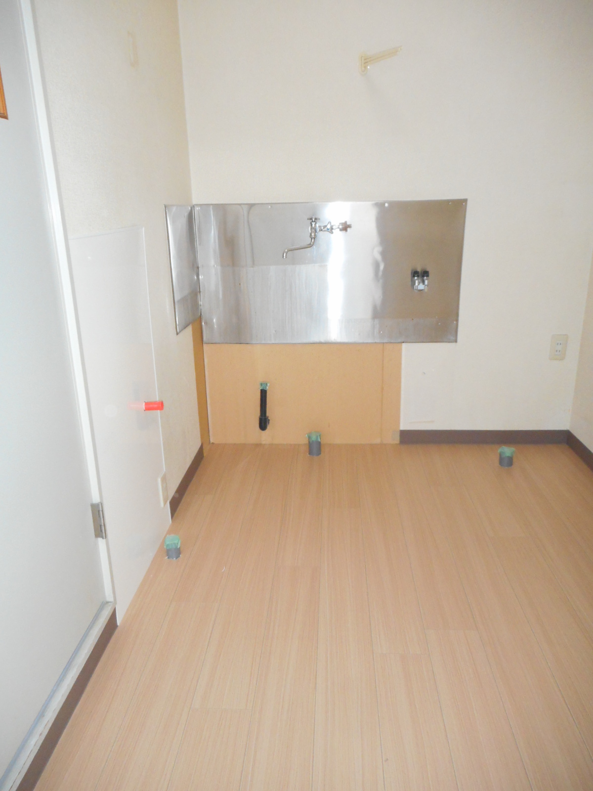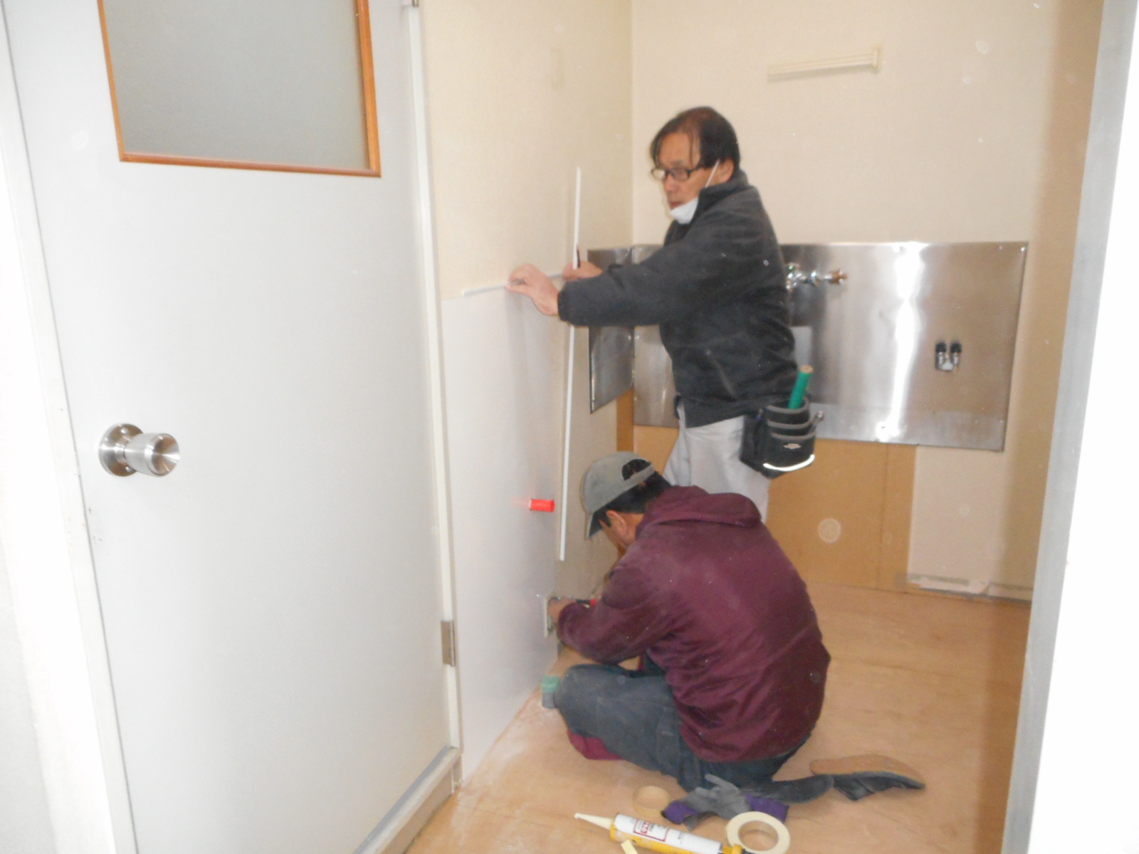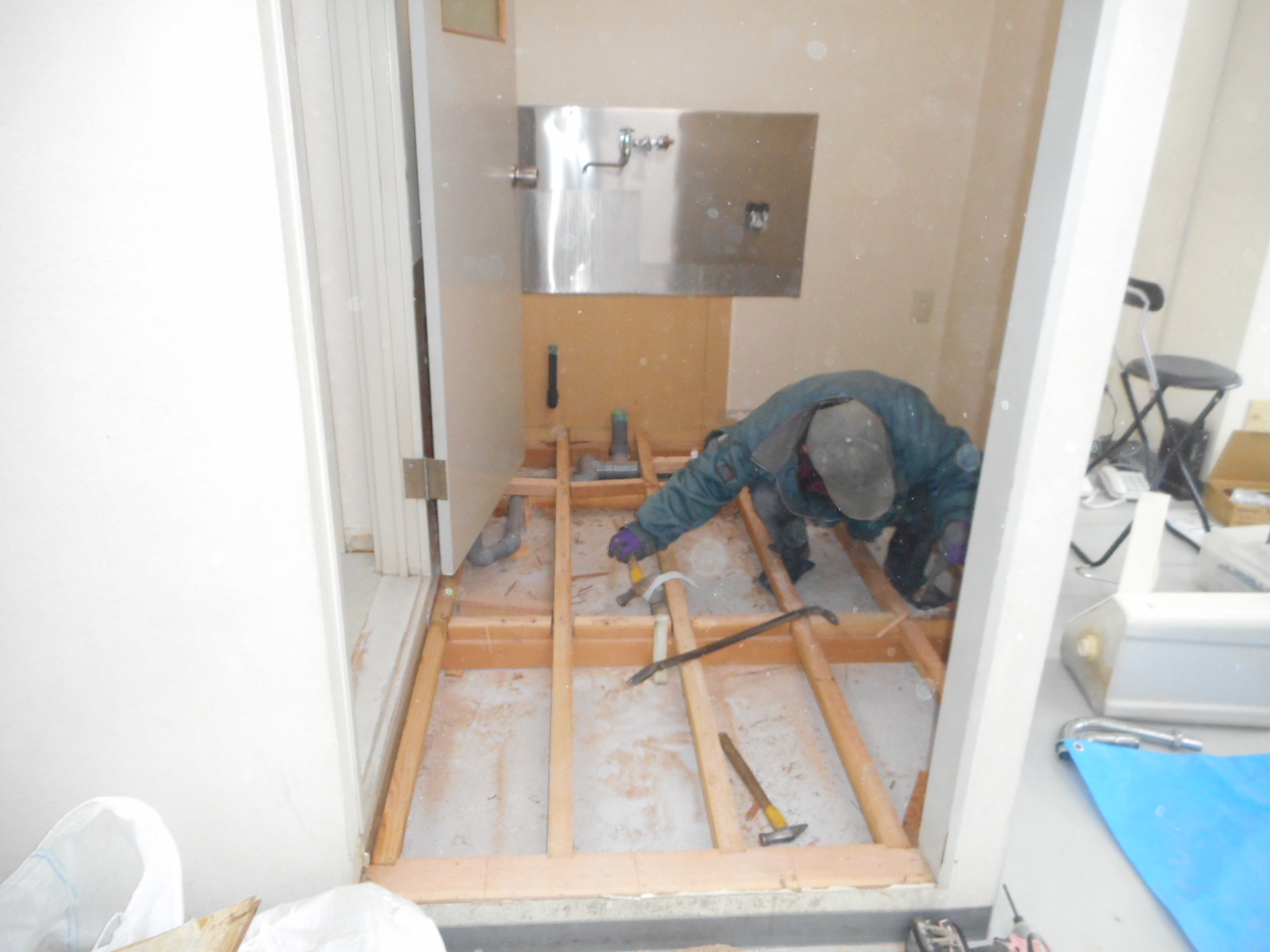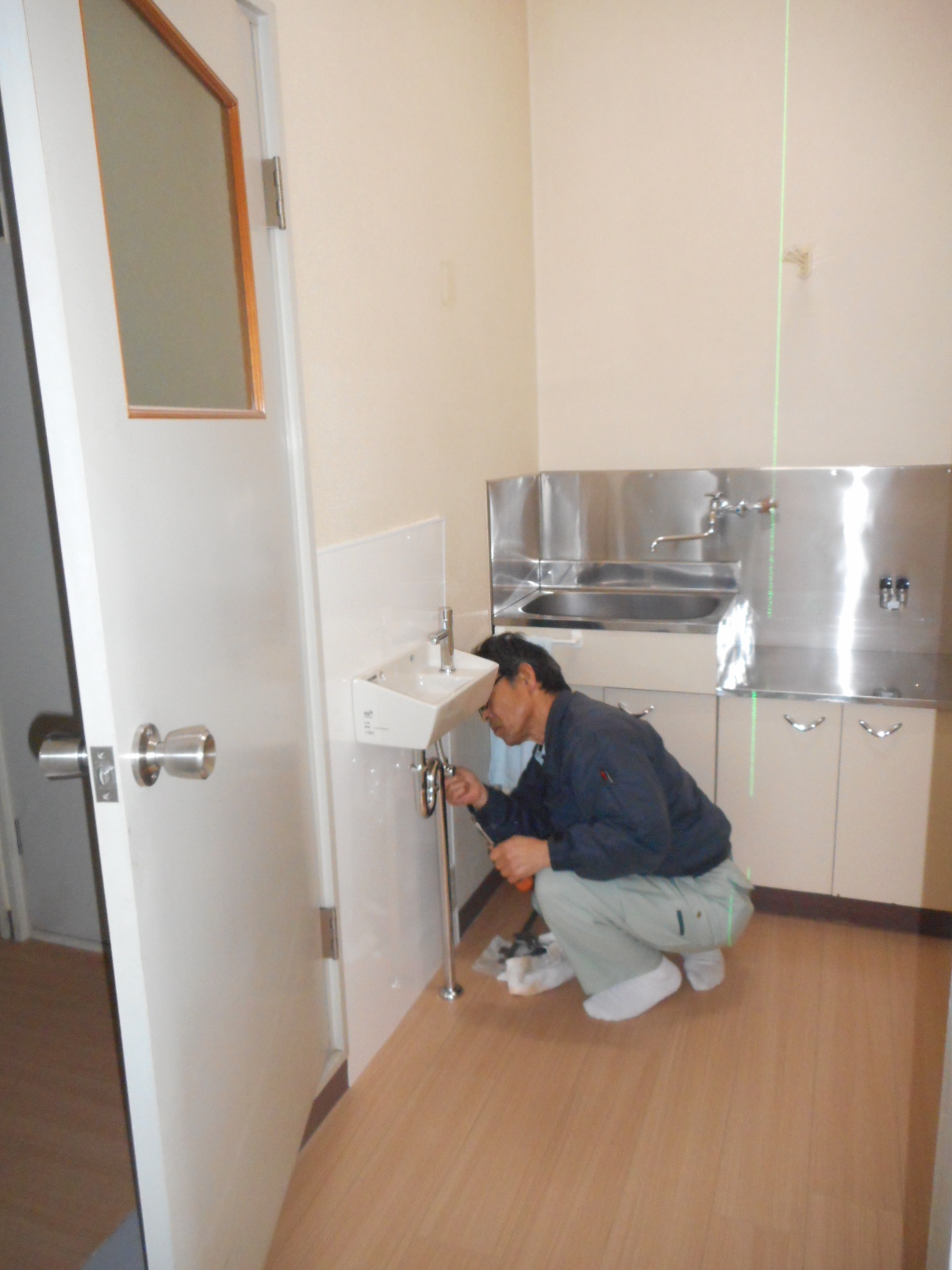 | 既設流し台を一時撤去後床を解体し、新規手洗い器用の給排水管を流し台から分岐する工事を行います!! | 給排水管の分岐工事後、床は下地コンパネを張りCFを施工し、手洗い器を取付ける部分にパネルを施工します!! |